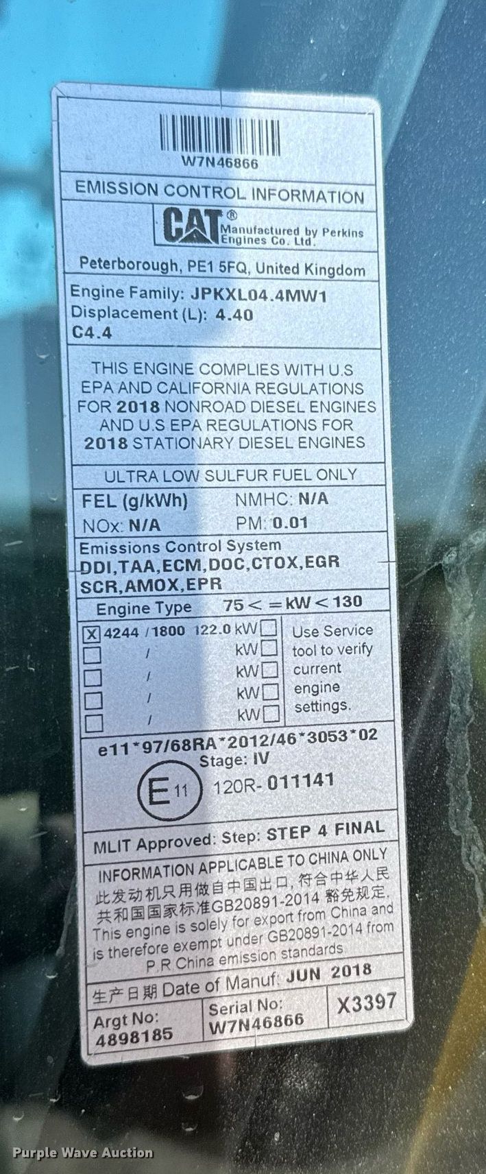 2018 Caterpillar 320 excavator. Hours: 2,030 on meter, Serial: CAT00320AHEX10325. Engine Caterpillar C4.4 Acert, Serial: W7N46866, Displacement: 4.40L, Cylinders: 4, Fuel type: Diesel. Transmission Hydrostatic, Two speed travel. Operators station Enclosed cab, AC, Heat, Backup camera, Pattern changer. Features Auxiliary hydraulics, Boom Standard, Stick Stick length: 9' 7", Quick coupler: Hydraulic Caterpillar, Bucket Caterpillar, Width: 48", Teeth: 6. Tracks Width: 31", Steel, Grouser pads: Triple. Patterson Energy LLC. Hays, KS 67601