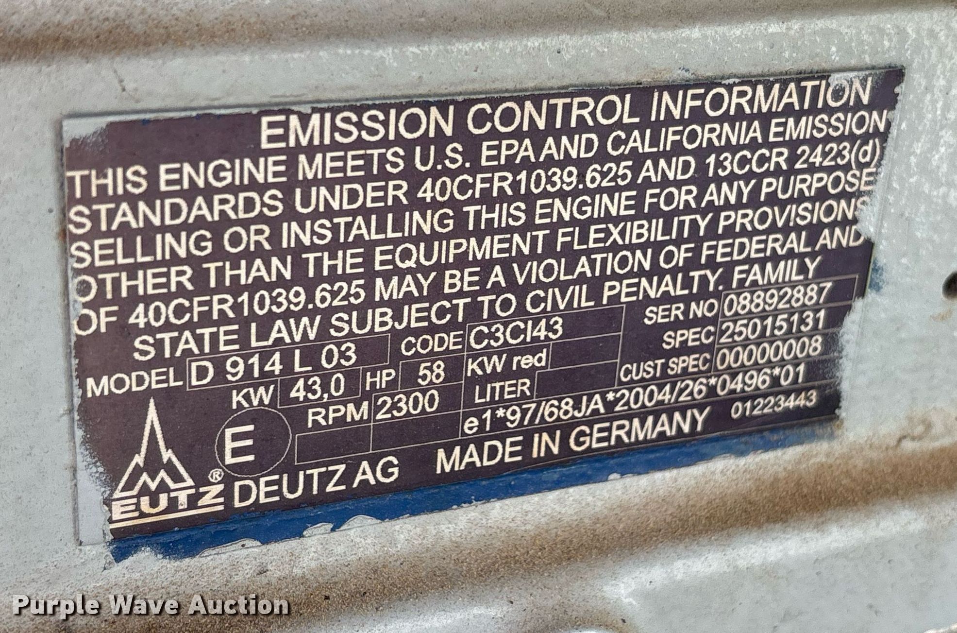 Gorman-Rupp T4A60S pump. Hours: 236 on meter, Serial: 1580388. Engine Deutz D914L03, Serial: 08892887, Cylinders: 3, Fuel type: Diesel, HP: 58, kW: 43. Features Inlet: 4", Outlet 4", Skid mounted. Notes Battery missing. Apex Energy Service. Pelican, LA 71063