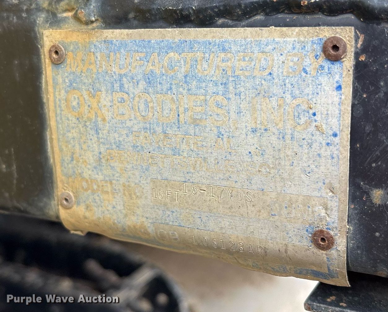 1988 Peterbilt dump truck. Miles: 89,733 on odometer Actual mileage unknown, Hours: 3,202 on meter, VIN: 1XP5DB9X5JD253393. Engine Caterpillar 3406B, Cylinders: 6, Fuel type: Diesel. Transmission Eaton Fuller, Manual, Speed: 10. Chassis Axles: Tandem, Differential lock: Full, Suspension: Spring over walking beam, Brakes: Air, PTO, GVWR: 56,000 lbs FAWR: 12,000 lbs, IAWR: 22,000 lbs, RAWR: 22,000 lbs. Interior AC, Heat, Heated mirrors. Features Dump bed Ox Bodies 15-17yds, Capacity: 17 cu.yd., 16' L x 8' W, Side height: 47", Side board height: 8", Bed type: Steel, Roll tarp, Ram: Single, End gate: Air operated. Tires Front: 385/65R22.5, Rear: 11R24.5. Notes Odometer has been replaced. Cherokee Nation classic title. Seller is an Oklahoma licensed motor vehicle dealer. Title will be assigned and distributed by the dealer. Please contact the seller for distribution questions. Title distribution may be delayed up to 14 days from verification of funds. TW Trucks & Equipment LLC. Stigler, OK 74462