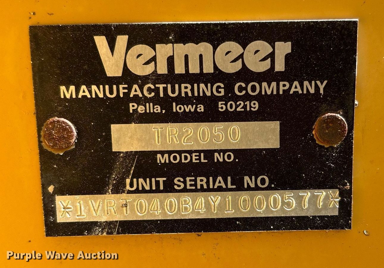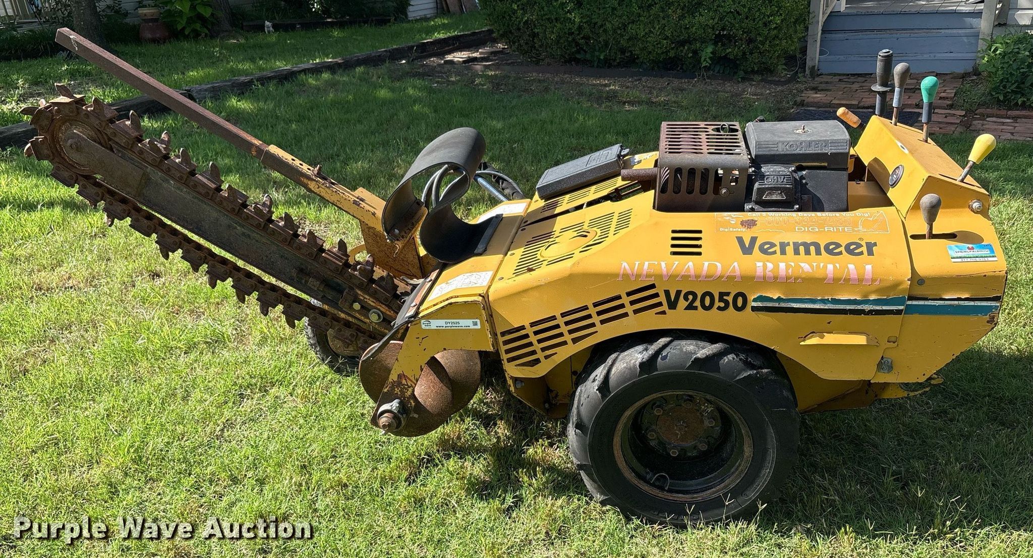 2000 Vermeer V2050 trencher. Hours: 891 on meter, Serial: 1VRT081A0Y1000590. Engine Kohler Command 20, Displacement: 624 cc, Cylinders: 2, Fuel type: Gas. Transmission Hydrostatic. Chassis Differential lock. Features Trencher Model: TR2050, Serial: 1VRT040B4Y1000577, Estimated dig depth: 48", Cutting width: 4", Teeth: Rock. Tires Size: 23x10.50-12. Notes Hydraulic leak. Waxahachie, TX 75165