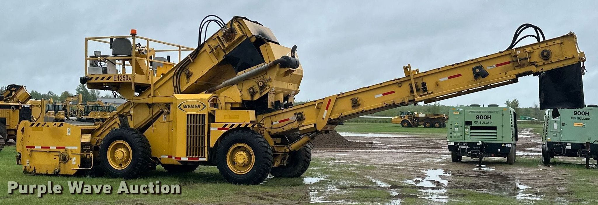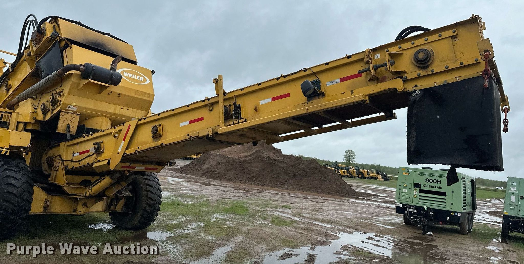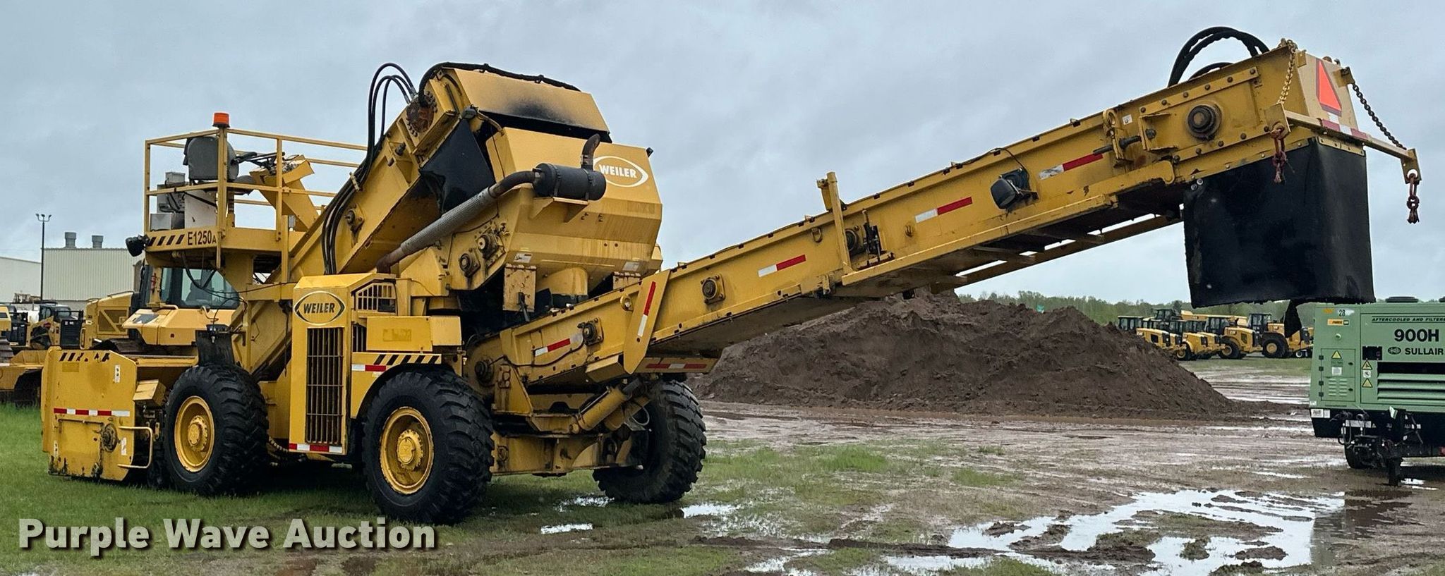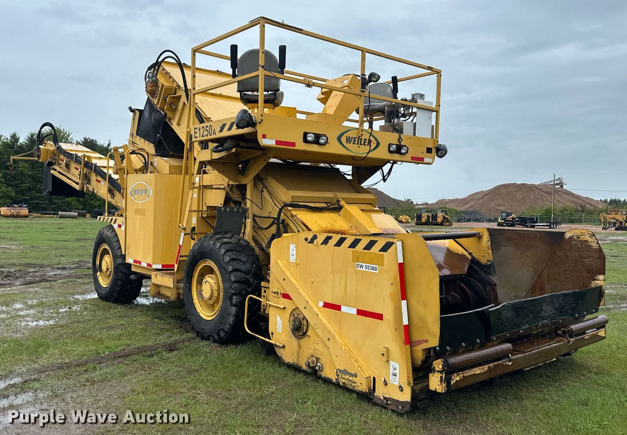 2009 Weiler E1250A material transfer vehicle. Hours: 5,754 on meter, Serial: A-1055. Engine Caterpillar C7, Cylinders: 6, Fuel type: Diesel. Transmission Hydrostatic. Features Cutting head Width: 10", Water/emulsion application system, Ground controls, Discharge conveyor 23' 6" L x 2' W. Tires Size: 17.5-25, Brand: Firestone. Inventory Reduction. Weston, WI 54476
