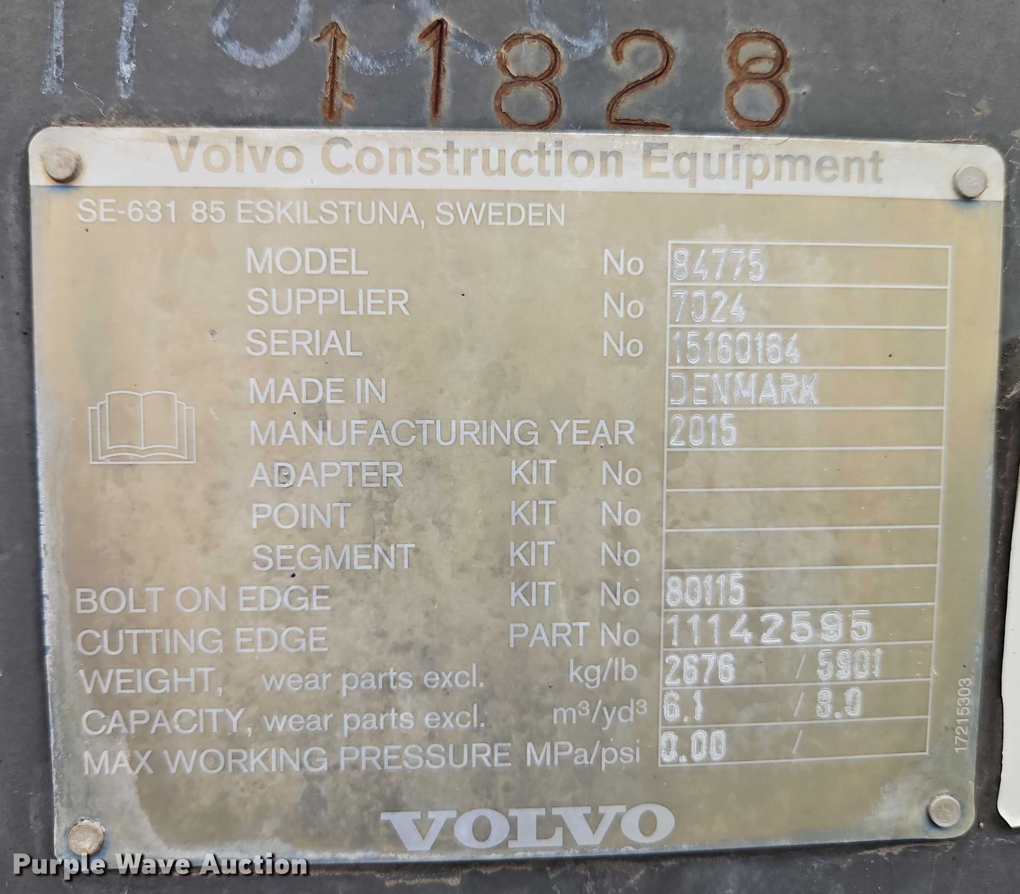Purple Wave is selling a used Wheel Loader Attach. in Missouri. This item is a 2015 Volvo 84775 wheel loader bucket with the following: Serial: 15160164, Width: 11'