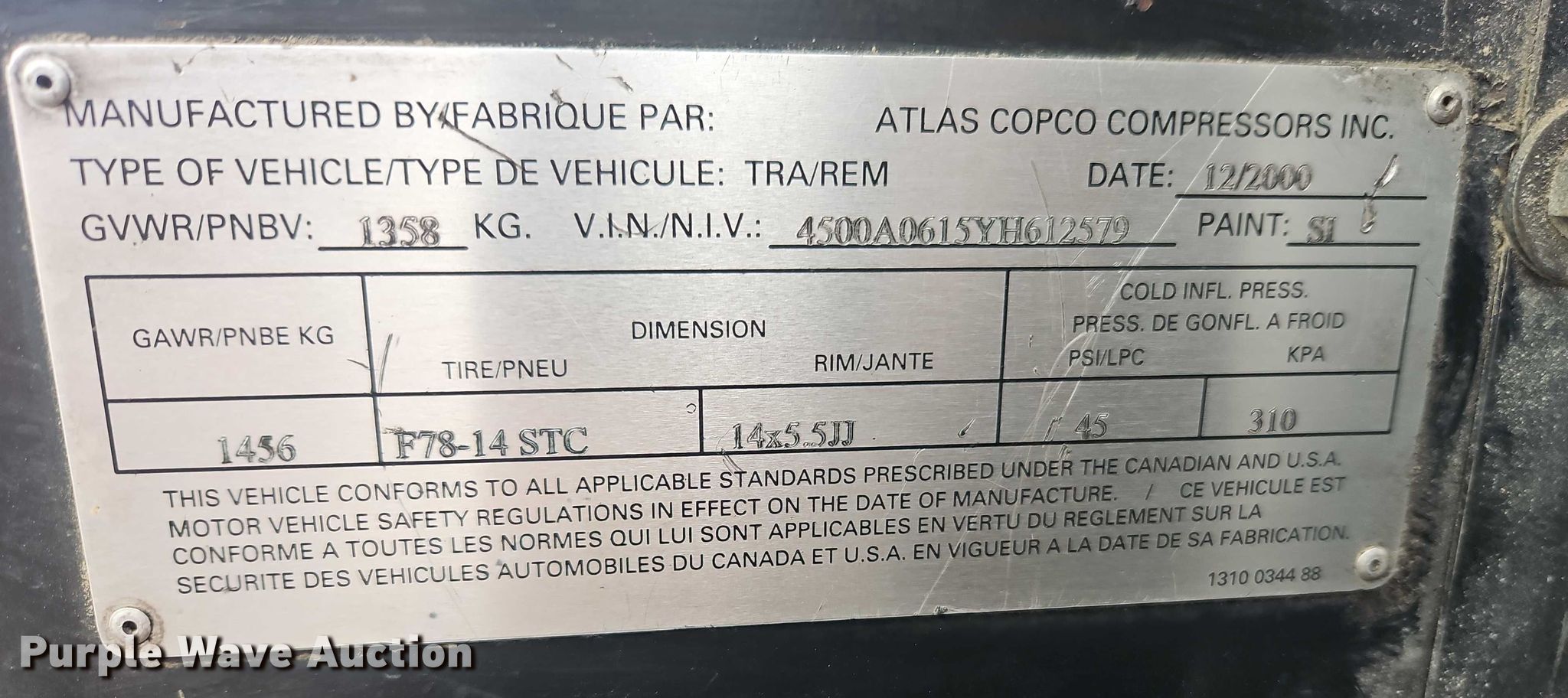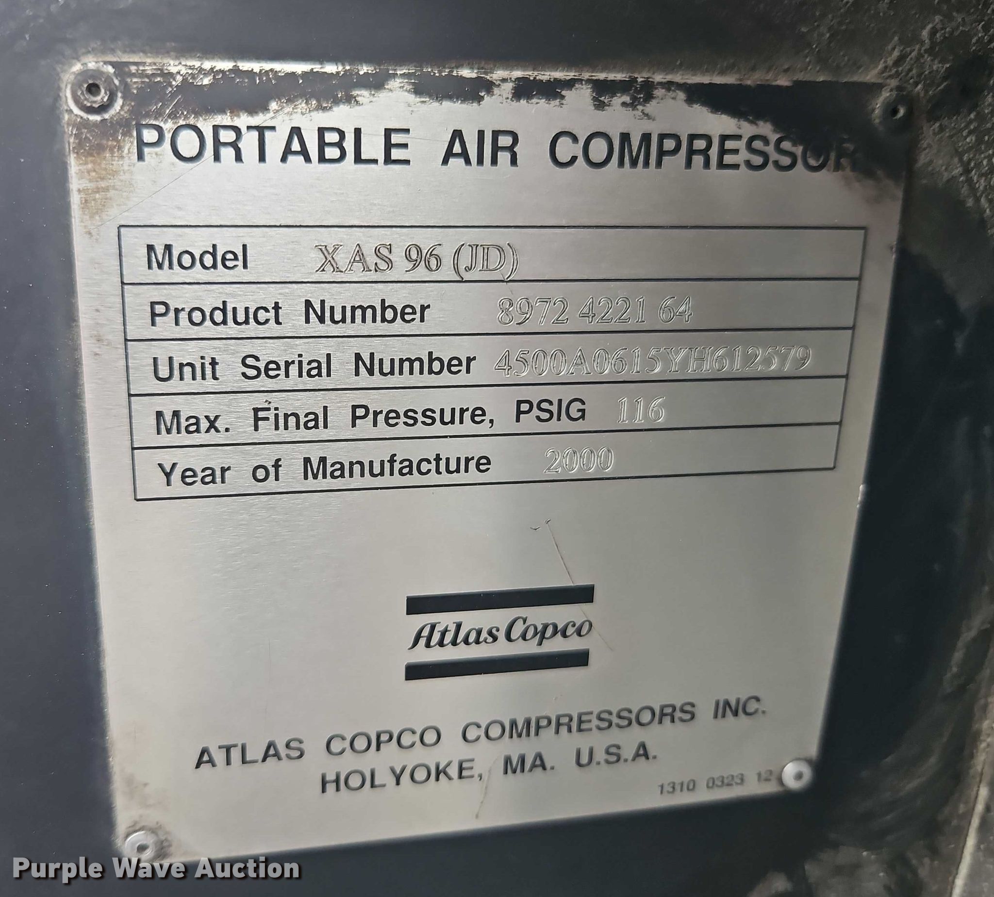 Purple Wave is selling a used Air Compressor in Kansas. This item is a 2000 Atlas Copco XAS 96 air compressor with the following: Hours: 1,151 on meter, VIN: 4500A0615YH612579, Unit #: 91-997