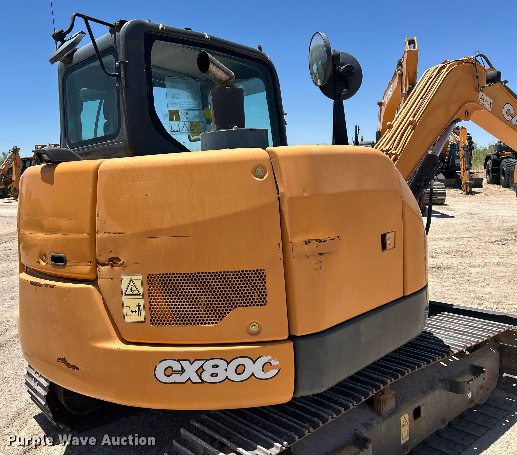 2019 Case CX80C mini excavator. Hours: 1,812 on meter, Serial: DAC080K6NKS6B2301. Engine Isuzu CP-4LE2X, Displacement: 2.2L, Cylinders: 4, Fuel type: Diesel. Transmission Hydrostatic, Two speed travel. Operators station Enclosed cab, AC, Heat, Backup camera, Pattern changer. Features Auxiliary hydraulics, Backfill blade Width: 91", Boom Swing, Stick Stick length: 88", Bucket Strickland, Teeth: 5. Tracks Width: 18", Steel, Grouser pads: Triple. Permian Tractor Sales, Inc.. Odessa, TX 79762