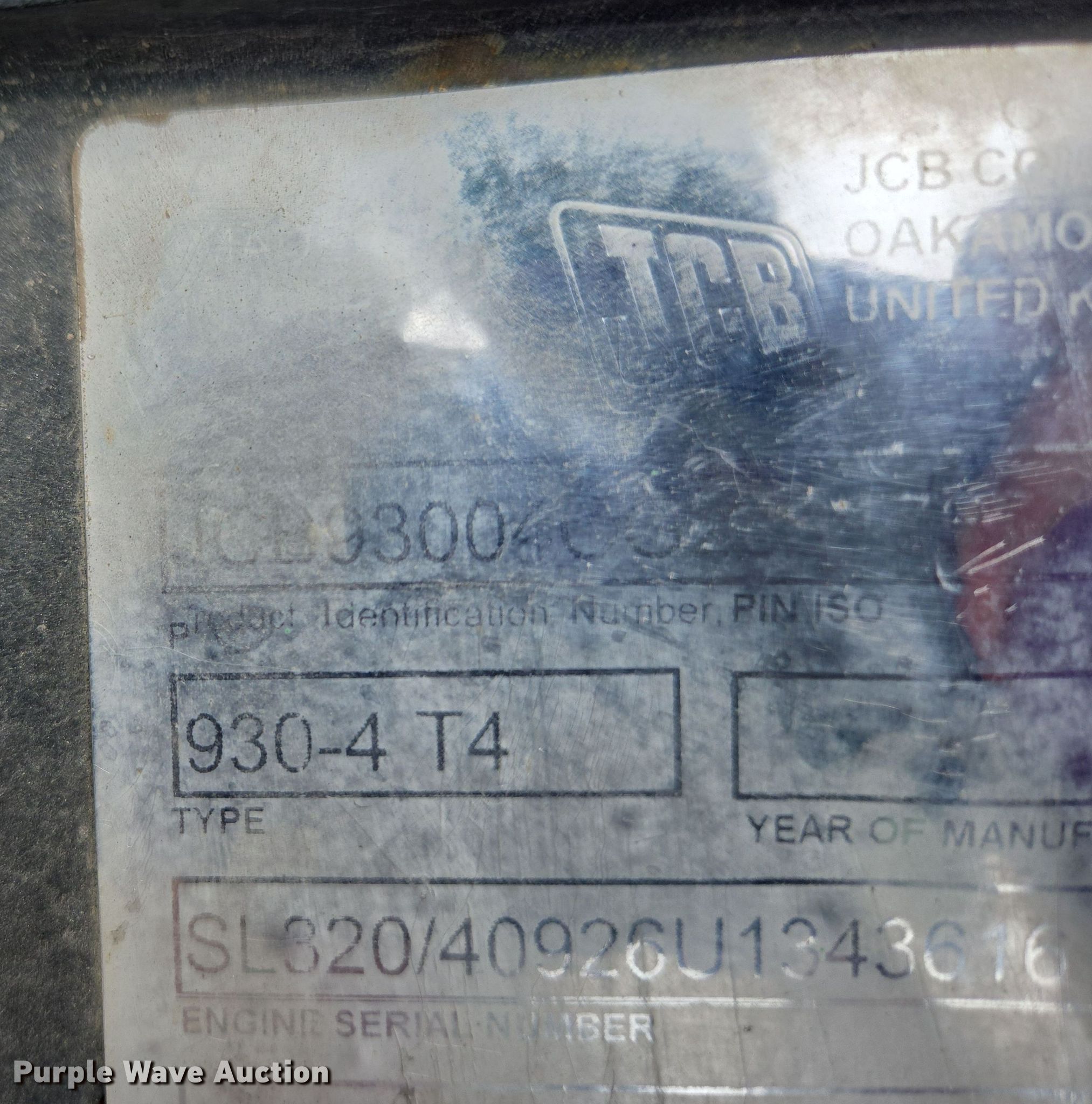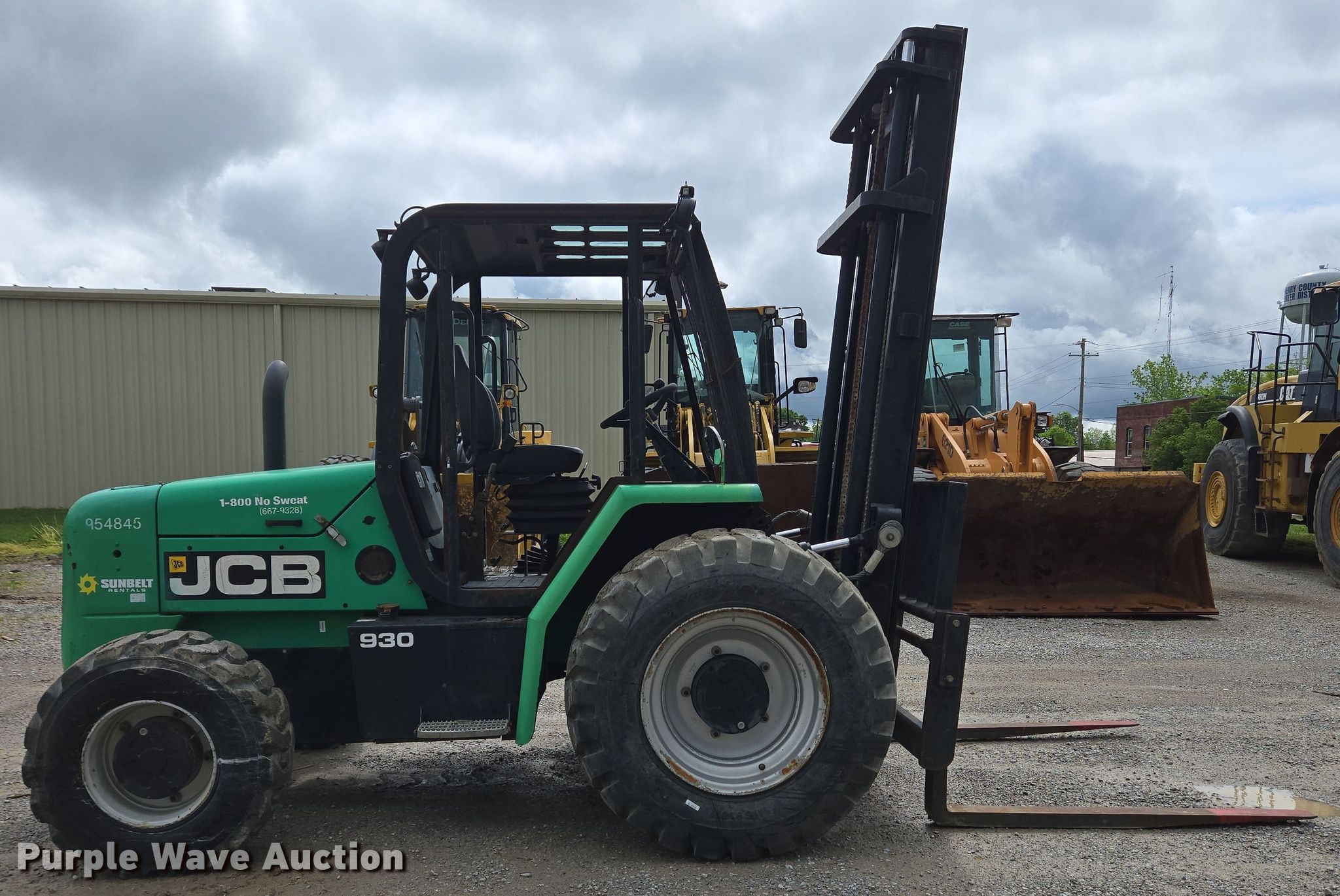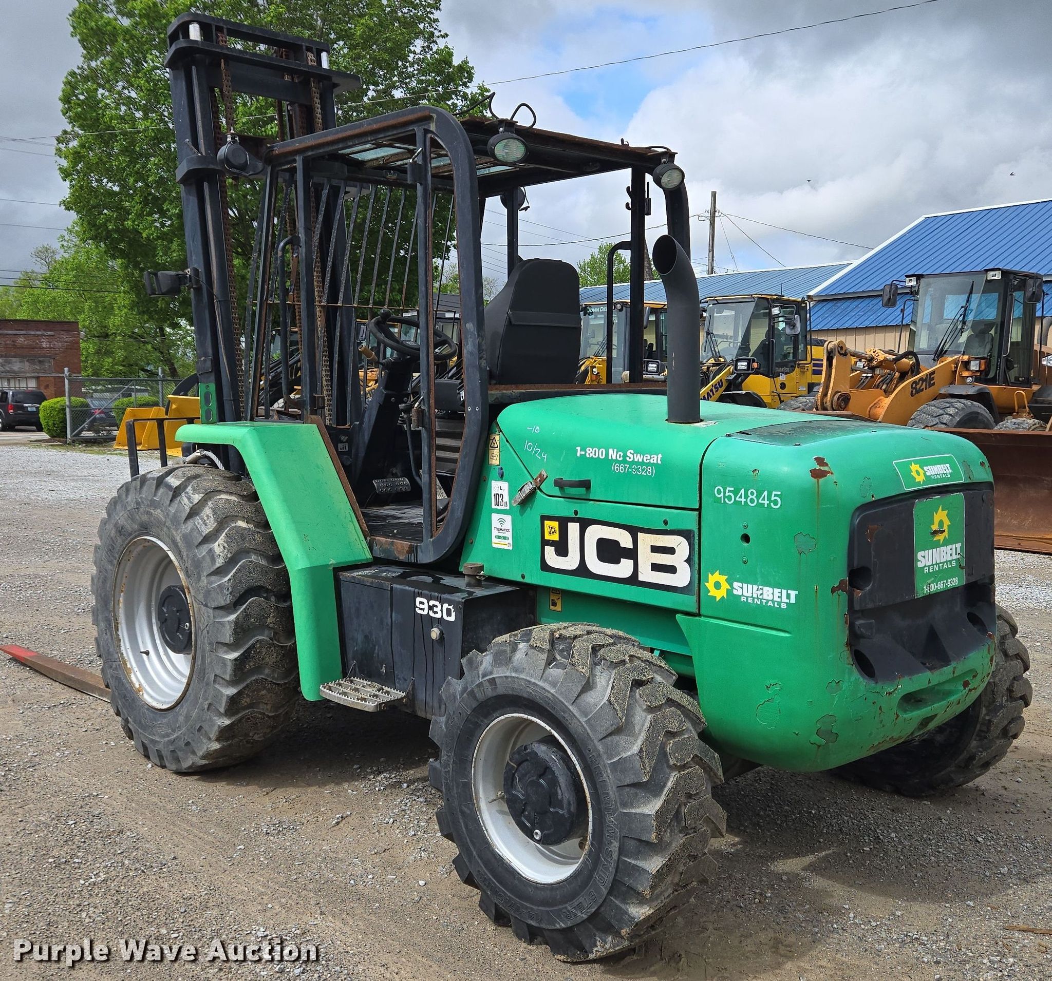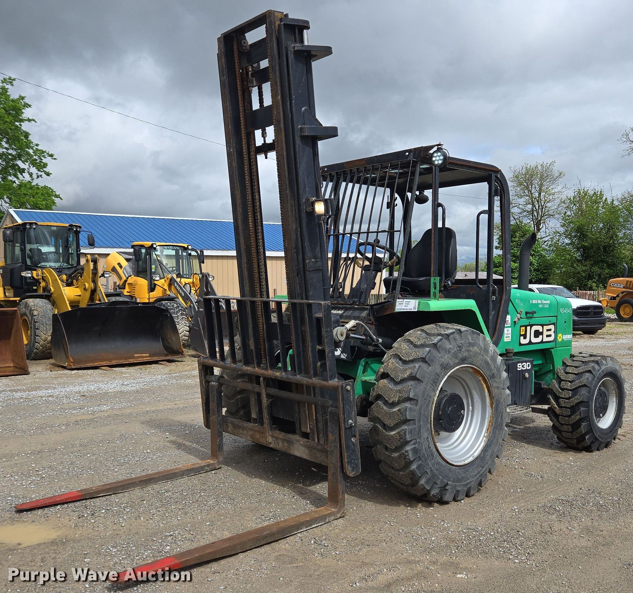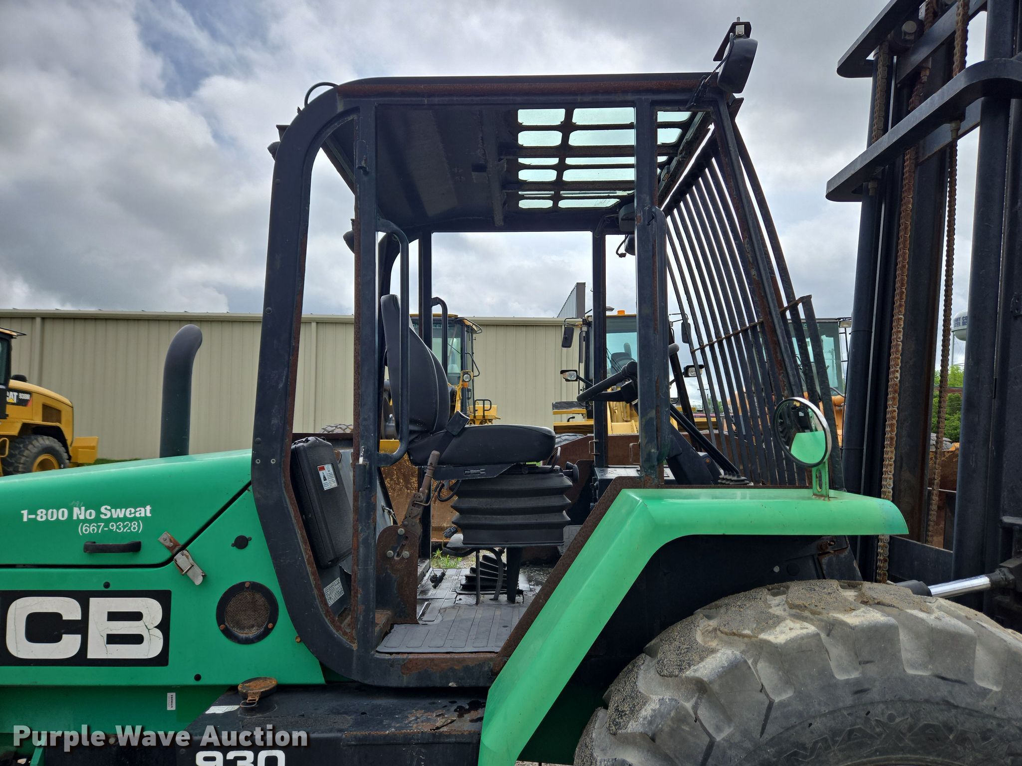 JCB 930 forklift. Hours: 3,596 on meter. Engine Cylinders: 4, Fuel type: Diesel. Chassis Four wheel drive. Operators station OROPS. Features Side shift, Mast tilt, Fork length: 60". Tires Front: 15 5-25, Rear: 14-17.5. Notes Throttle issues, unresponsive. Clark Heavy Equipment. Pleasureville, KY 40057