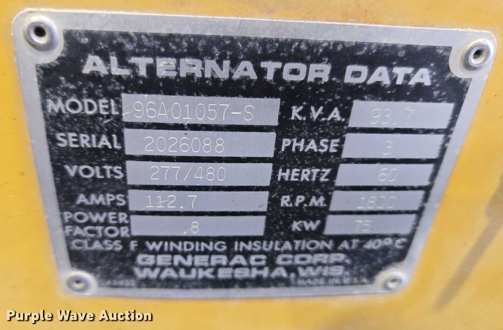 Generac 96A 01057 S generator. Hours: 4,412 on meter, Serial: 2026088. Engine Caterpillar, Cylinders: 4, Fuel type: Diesel, kW: 75. Electric Motor Volts: 277/480. Features Generator Phase: Single, Three, Electric start, Skid mounted. Notes Fuel tank not included, Unknown operating condition of generator, Dead battery. Fort Wayne, IN 46809