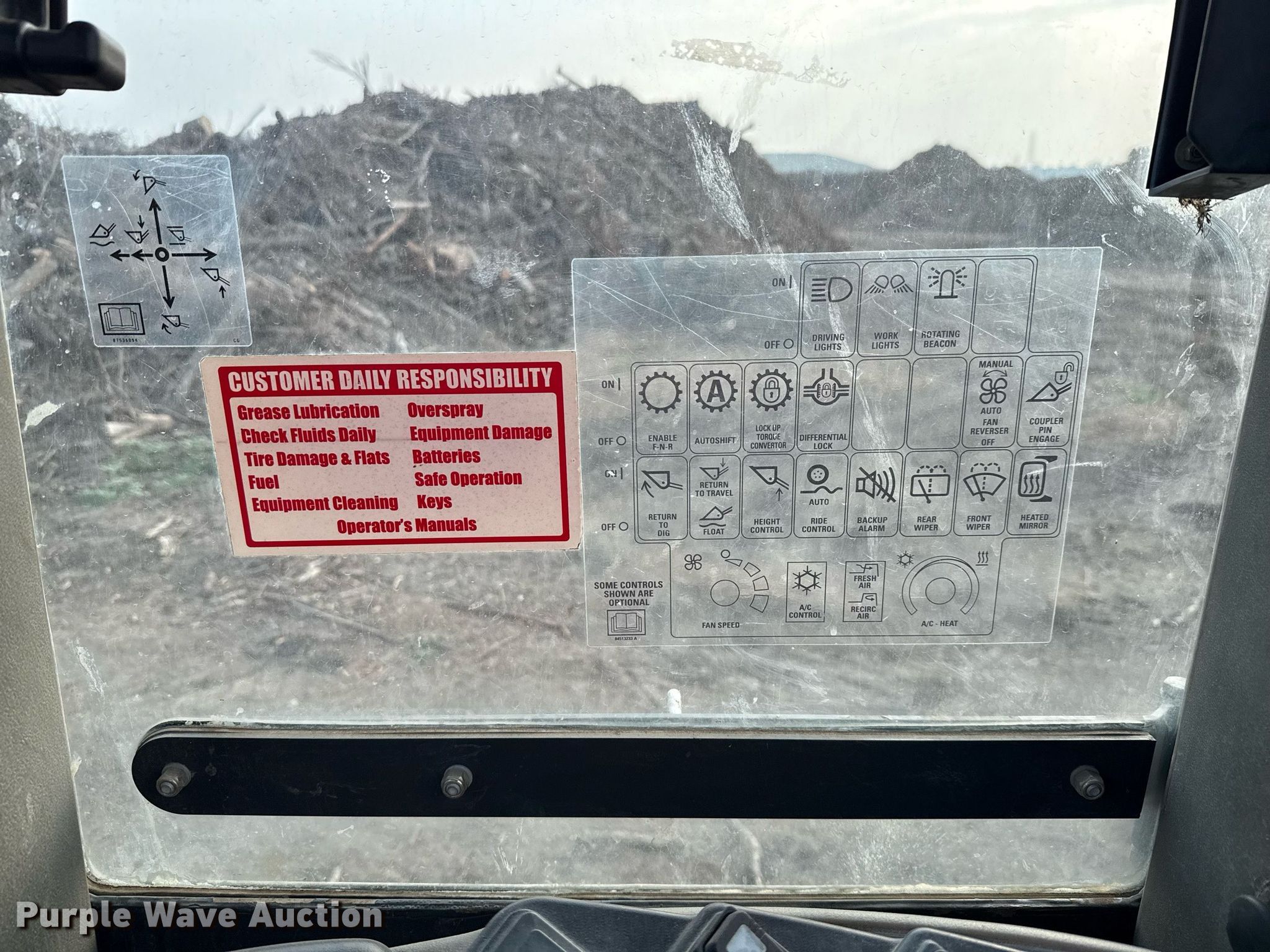 2016 Case 821F wheel loader. Hours: 6,865 on meter, Serial: NGF235915. Engine Cylinders: 6, Fuel type: Diesel. Transmission Powershift, 4F - 4R. Operators station Enclosed cab, AC, Heat, Bucket controls: Joystick. Features Auxiliary hydraulics: Front, Counter weights, Bucket CNH 84144003, Capacity: 45 cu.yd., Width: 119", Self- leveling bucket. Tires Size: 23.5R25. Notes Door issues, does not close. Second Nature Compost. 8449 Nelson Road. San Antonio, TX 78252