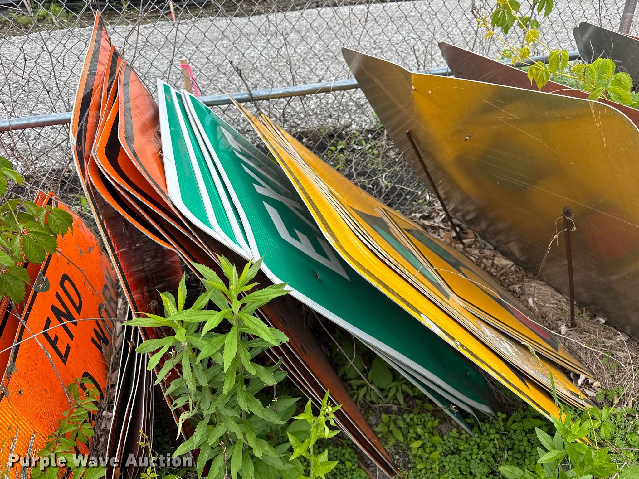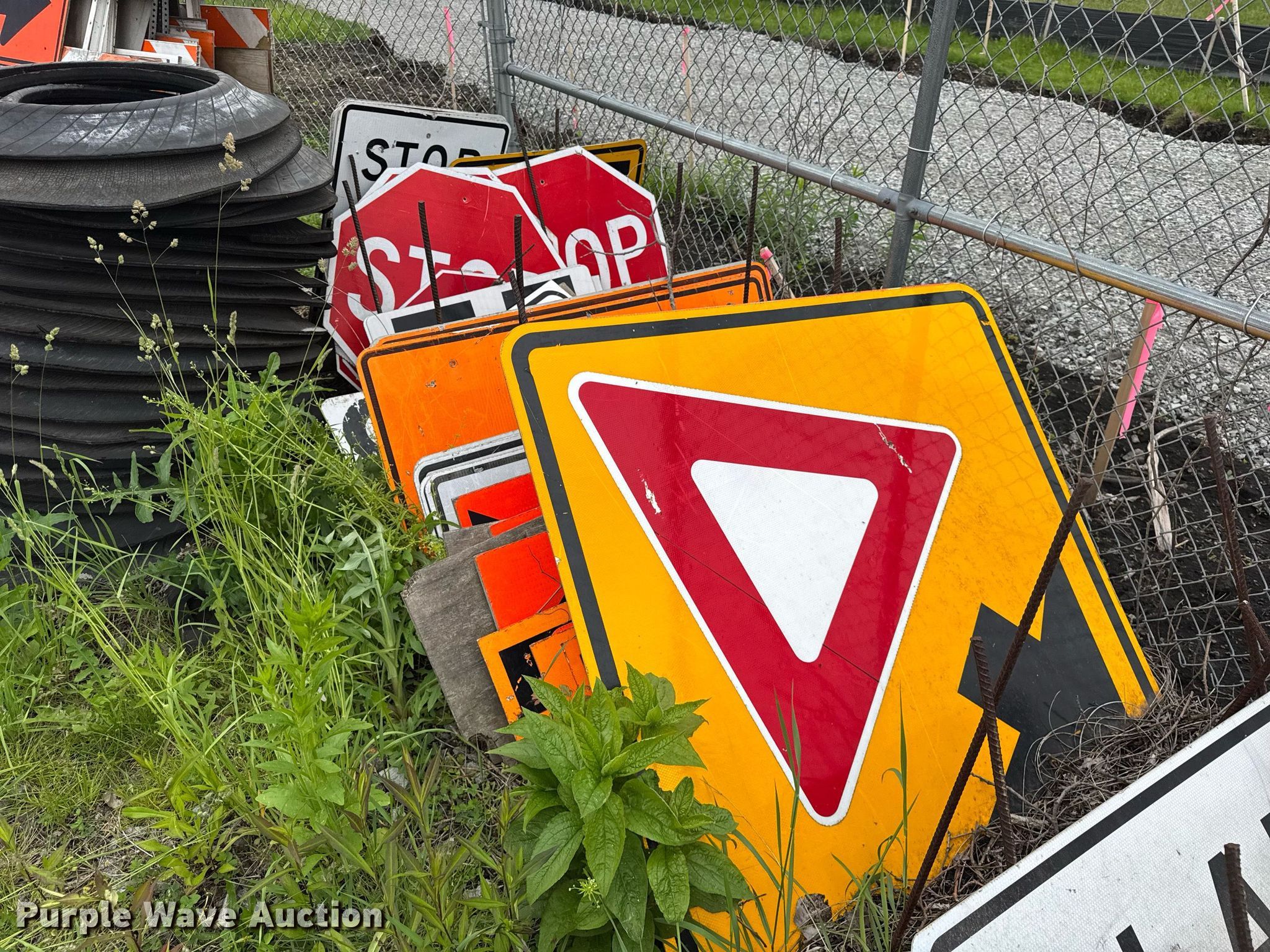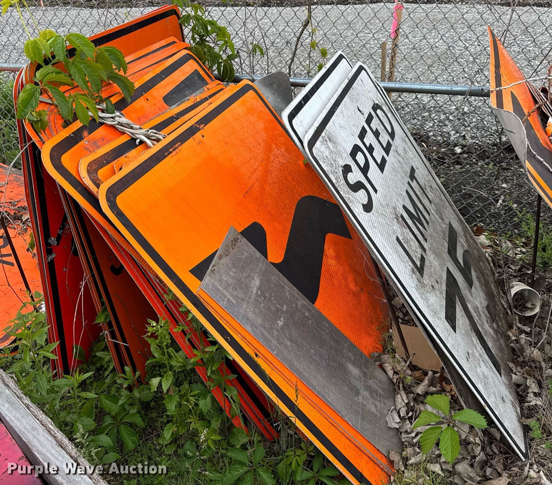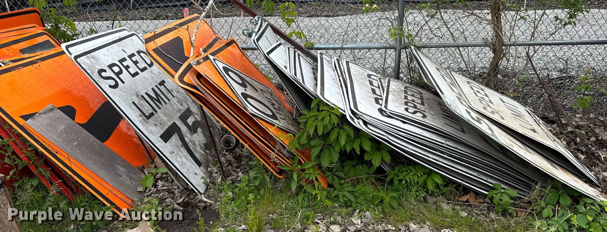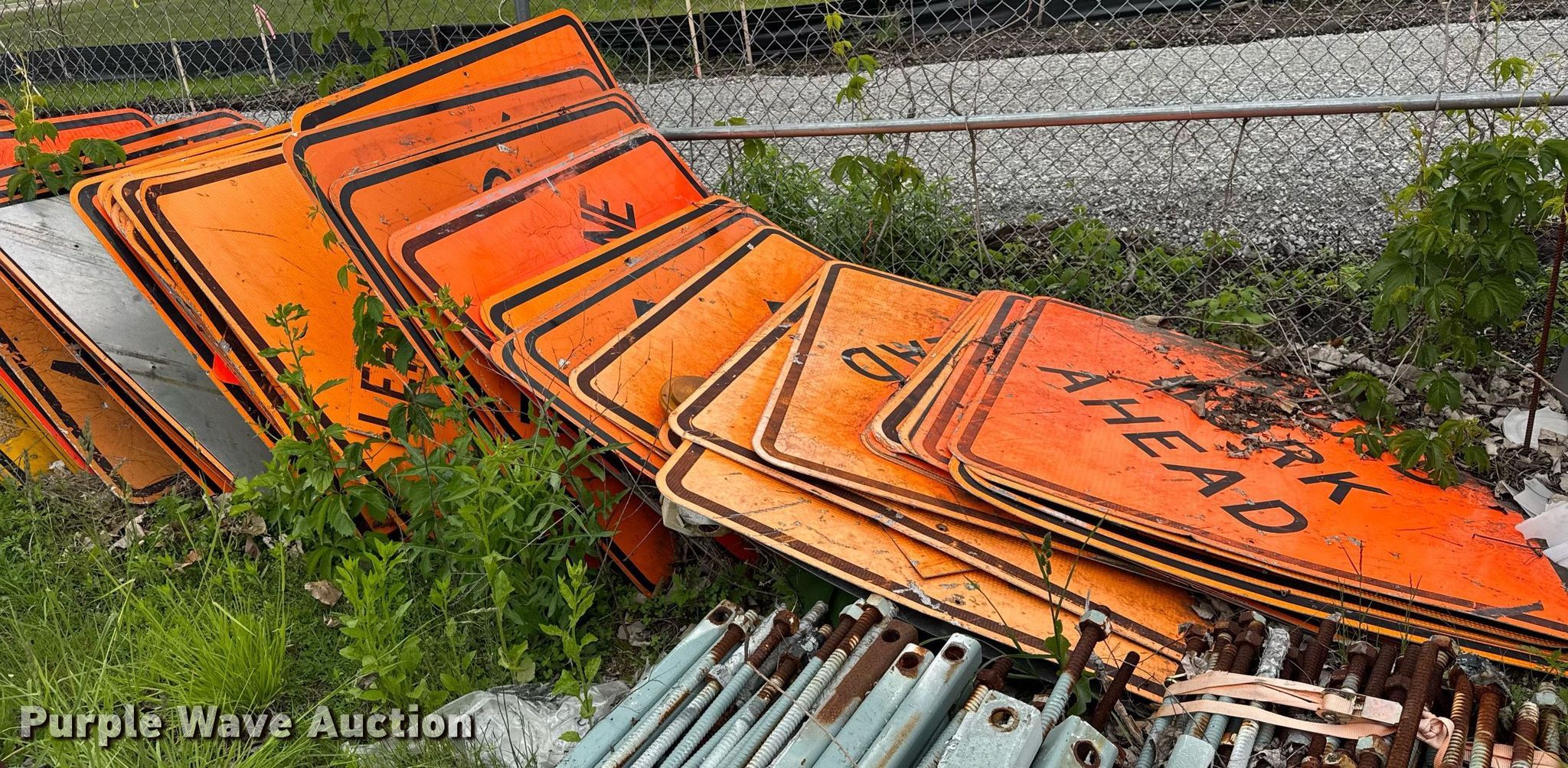 Purple Wave is selling a used Road Safety Equip. in Indiana. This item is a Road safety equipment with the following: Traffic barricades, Traffic control signage, High visual signs, Approximately 100 signs