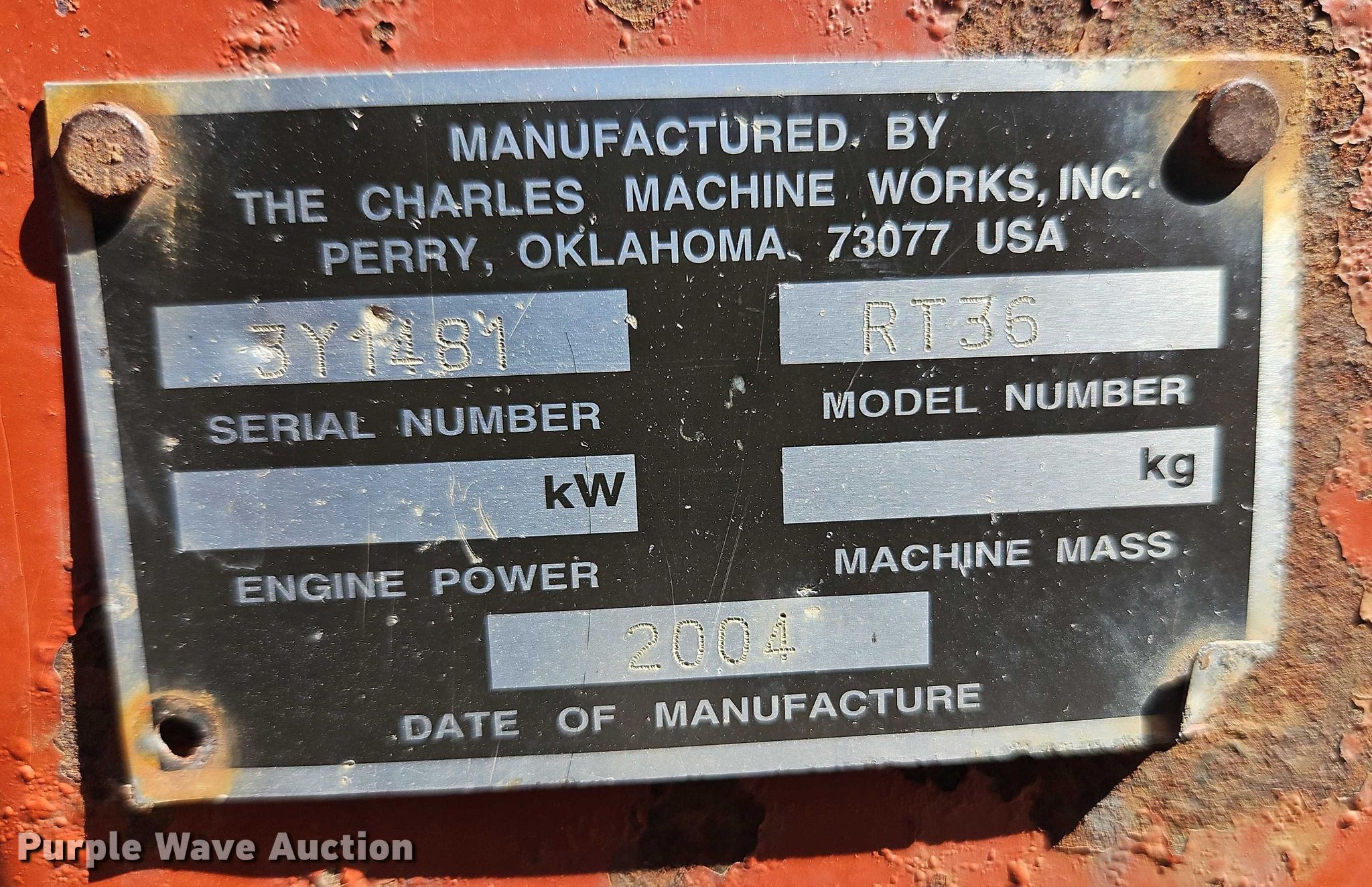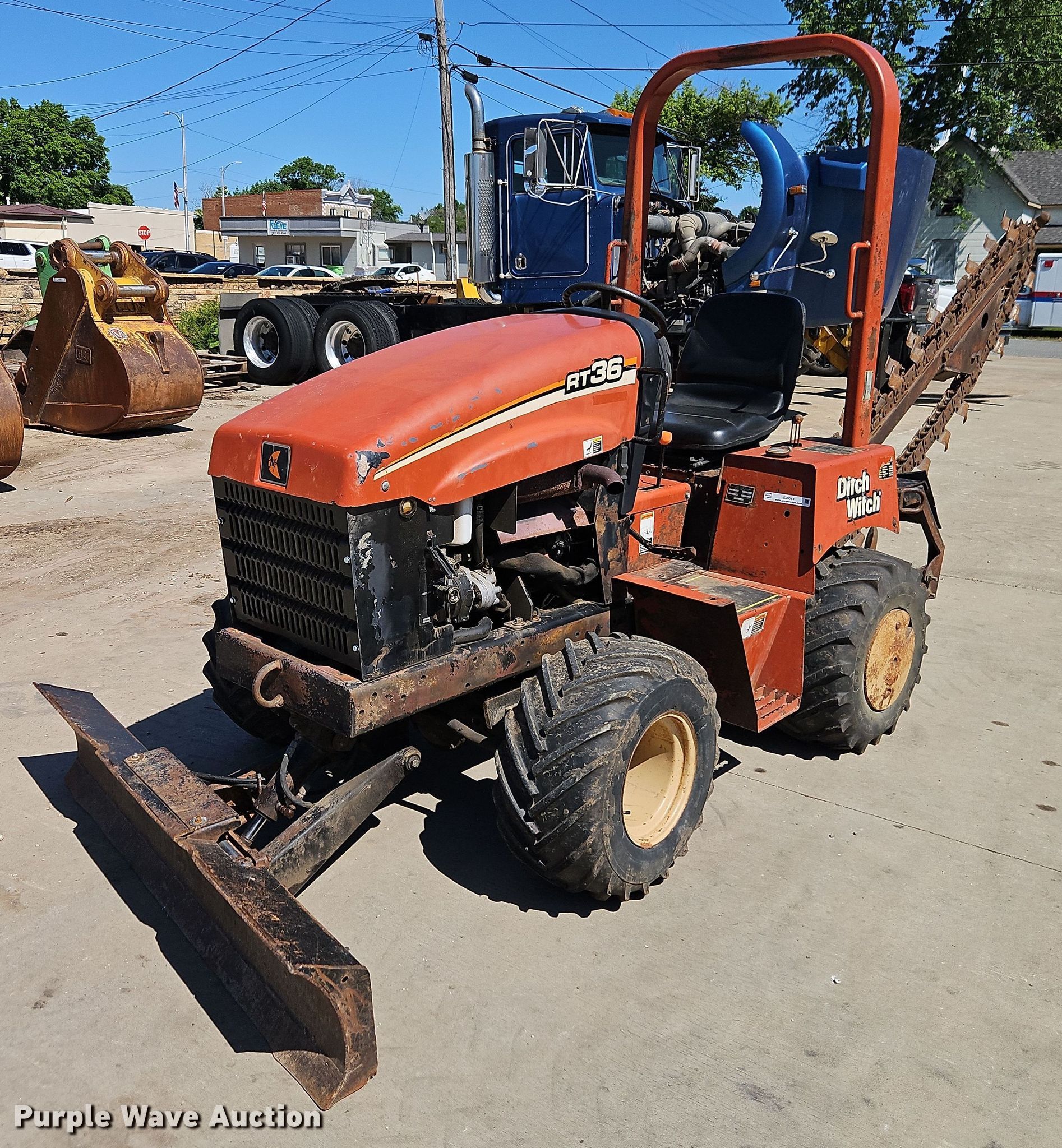 2004 Ditch Witch RT36 trencher. Hours: 2,094 on meter, Serial: 3Y1481. Engine Deutz, Fuel type: Diesel. Transmission Manual, 3F - 1R. Chassis Four wheel drive. Features Trencher Estimated dig depth: 96", Cutting width: 6", Teeth: Dirt, Backfill blade Width: 64". Tires Size: 26x12.00-12. Cohorst Enterprises, Inc.. Wellsville, KS 66092