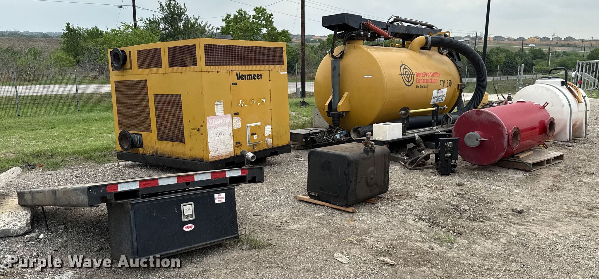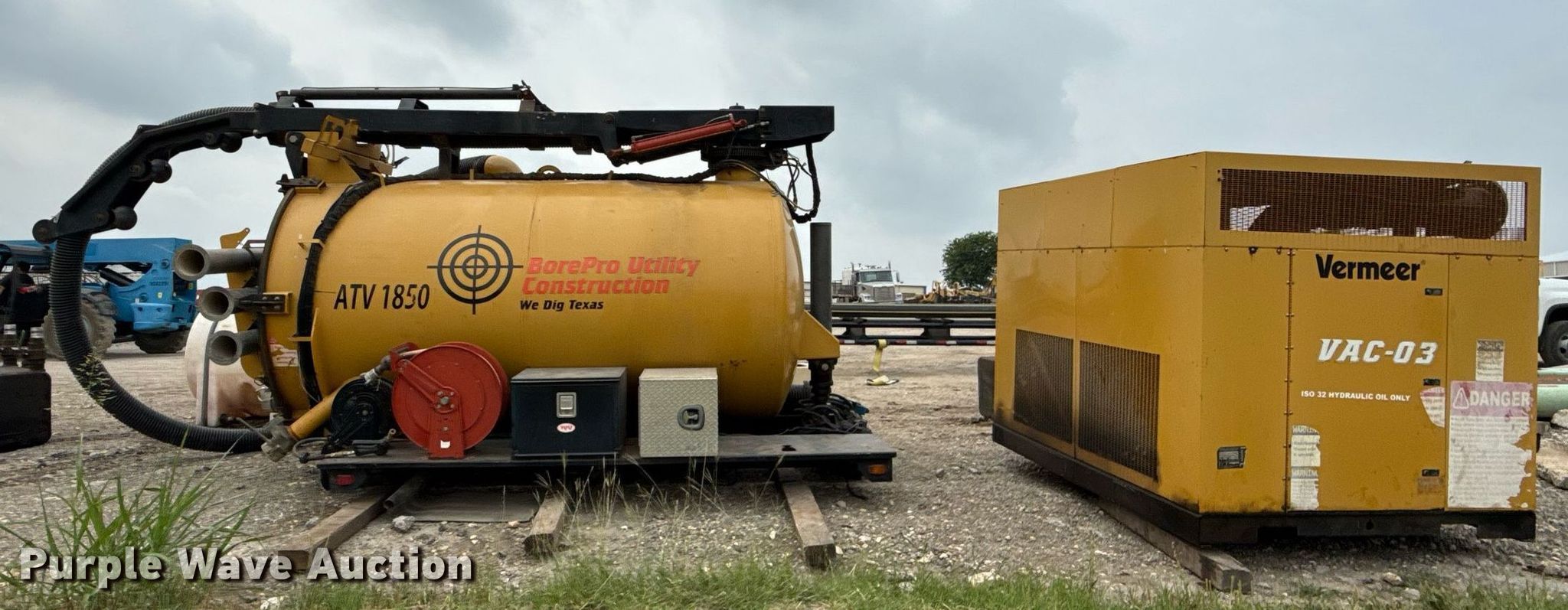 Purple Wave is selling a used Truck Part and Attach. in Texas. This item is a Vermeer ATV-1850 vacuum excavator with the following: Spoils tank, Capacity: 1,800 gallons, Flat bed, 10� 8� L x 96� W, Water tank, Capacity: 425 gallons, Water pump, Cat Pumps 1530, PSI: 2,000, Vacuum pump, Inlet valve size: 6", Outlet valve size: 6", CFM: 2,400, Suction hose, Diameter: 6"