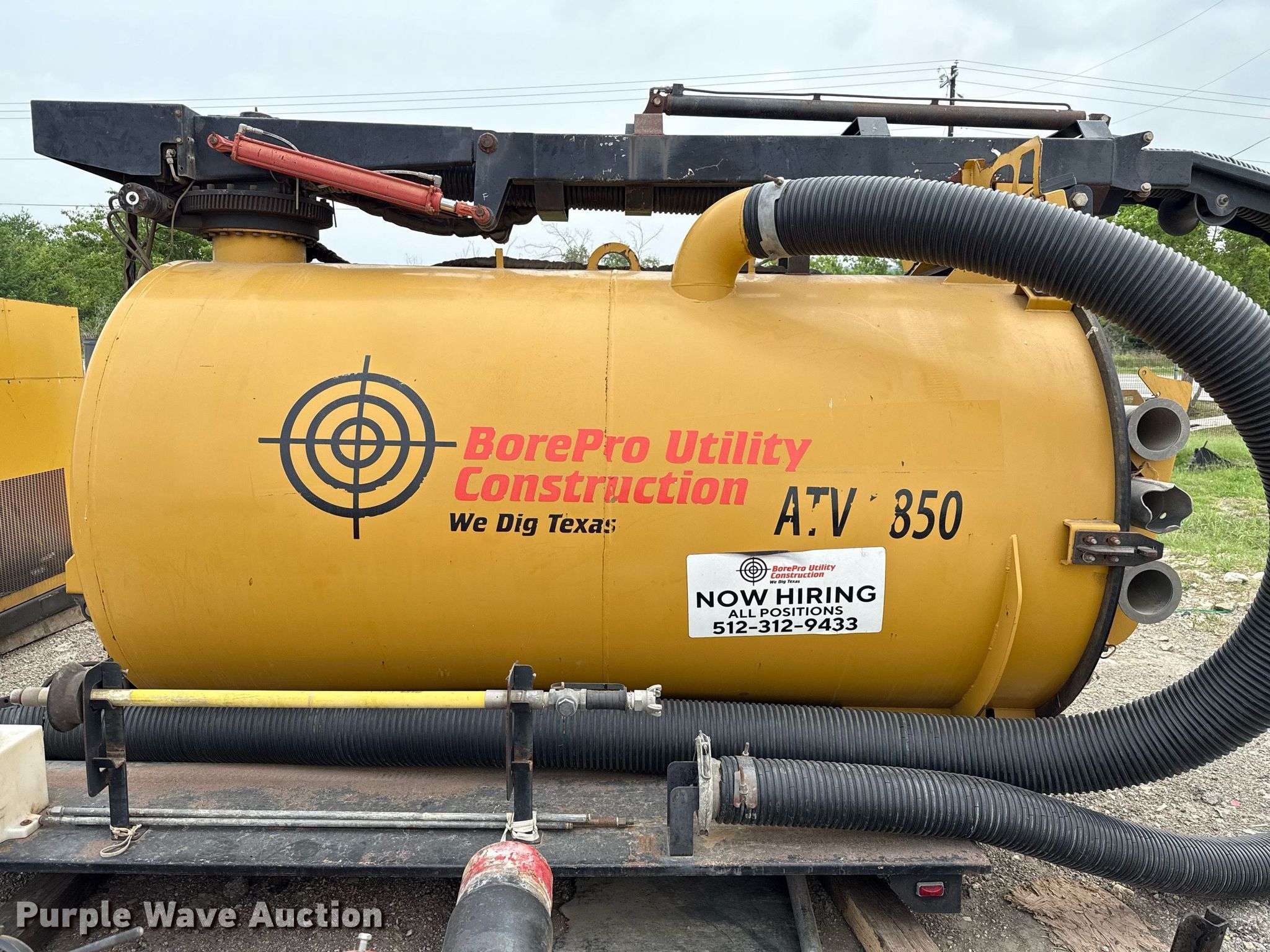Vermeer ATV-1850 vacuum excavator. Features. Spoils tank Capacity: 1,800 gallons, Flat bed 10� 8� L x 96� W, Water tank Capacity: 425 gallons, Water pump Cat Pumps 1530, PSI: 2,000, Vacuum pump Inlet valve size: 6", Outlet valve size: 6", CFM: 2,400, Suction hose Diameter: 6". BorePro Utility Construction LLC. Buda, TX 78610