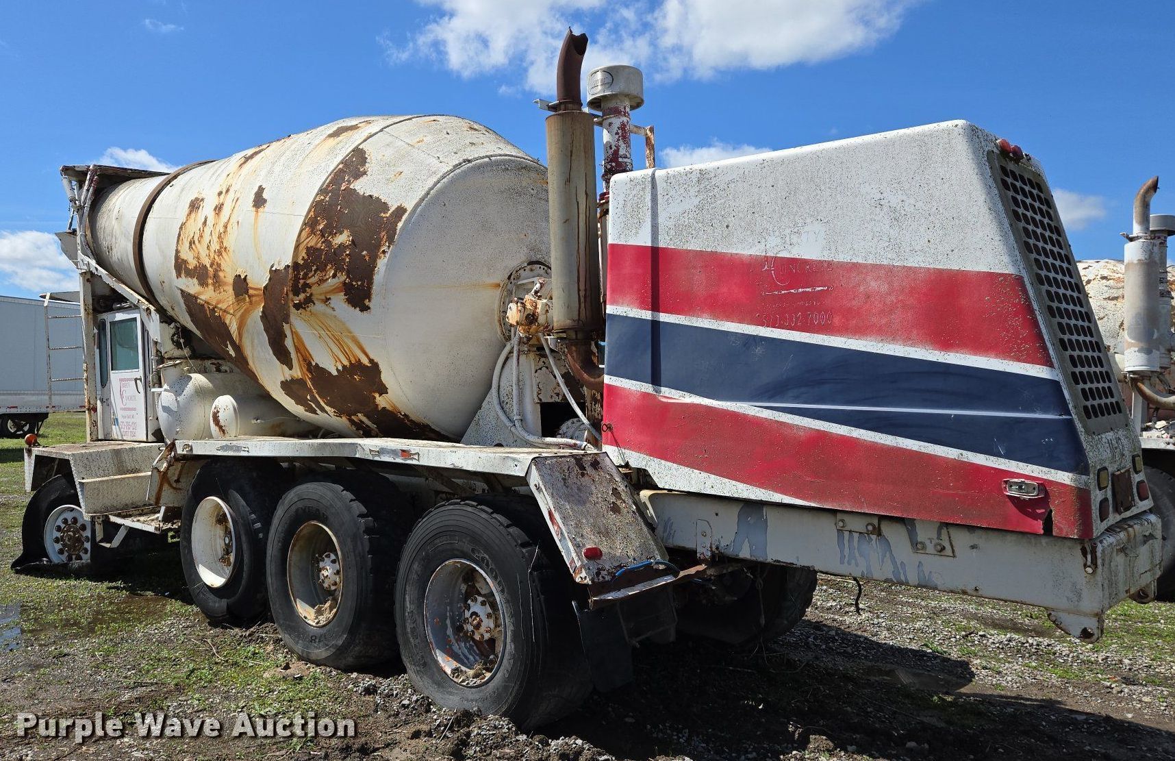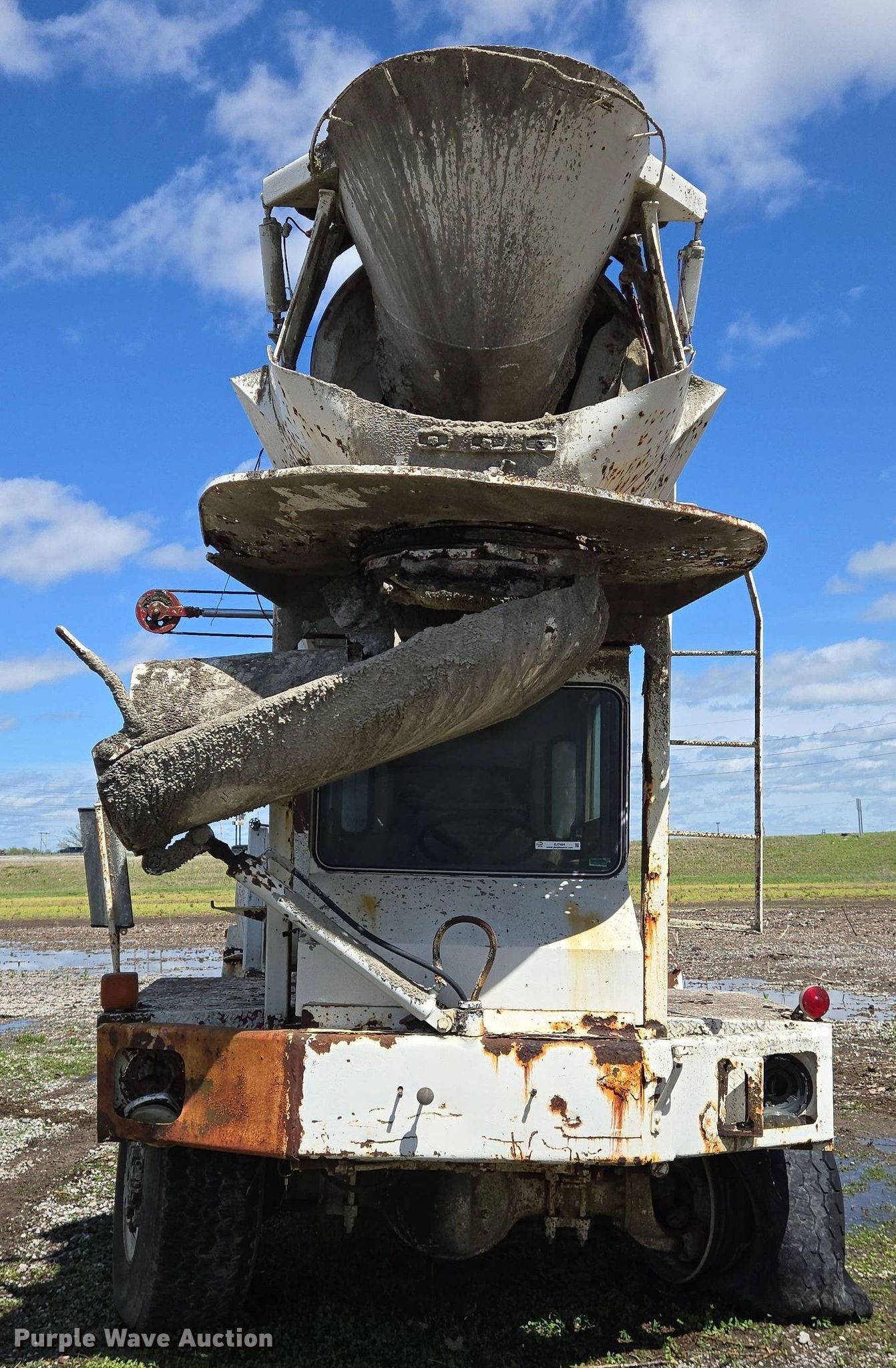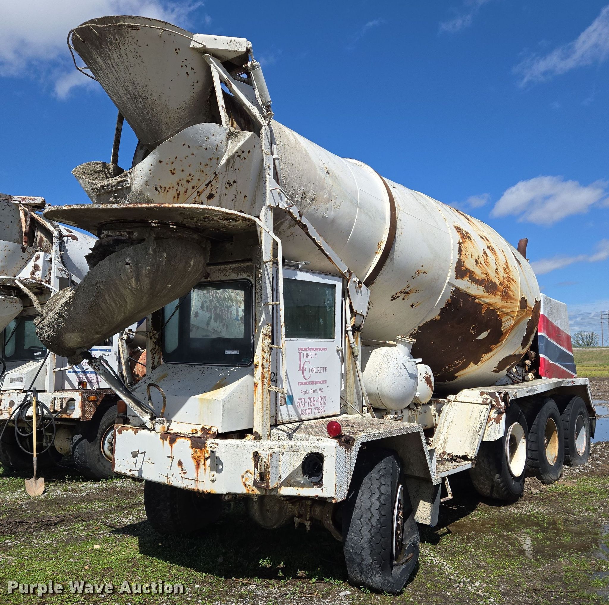 1988 Advance ready mix truck. VIN: 1A9TAC4S5I0007597, Hours: 8,877 on meter, Miles: Unknown. Engine Cummins L10, Cylinders: 6, Fuel type: Diesel. Transmission Automatic. Chassis Axles: Triple, Pusher axle, Differential lock: Inter-axle, Brakes: Air, PTO. Features Mixer 1987 Advance, Serial: 1597988, Discharge: Front, In-cab controls, Rear drum controls. Tires Front: 425/65R22.5, Rear: 445/65R22.6. Notes Windshield chipped or cracked, Glass missing, Tires need replaced, Unknown operating condition Unit must be towed or hauled. Missouri title. Title distribution may be delayed up to 14 days from verification of funds. Jerry Lipps, Inc.. CAPE GIRARDEAU, MO 63702