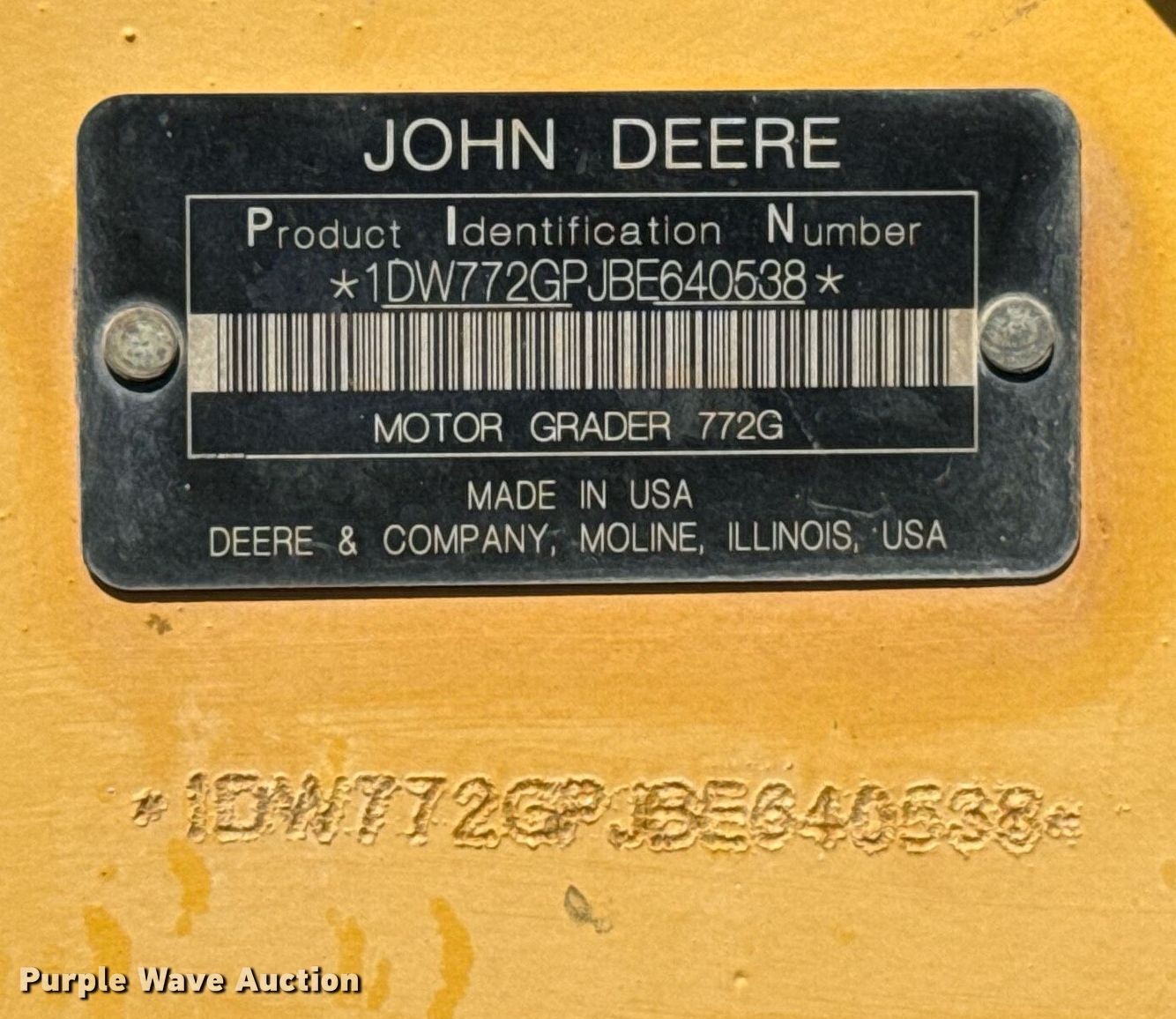 Purple Wave is selling a used Motor Grader in Oklahoma. This item is a 2012 John Deere 772GP motor grader with the following: Hours: 11,179 on meter, Serial: 1DW772GPJBE640538, Unit #: 451.288