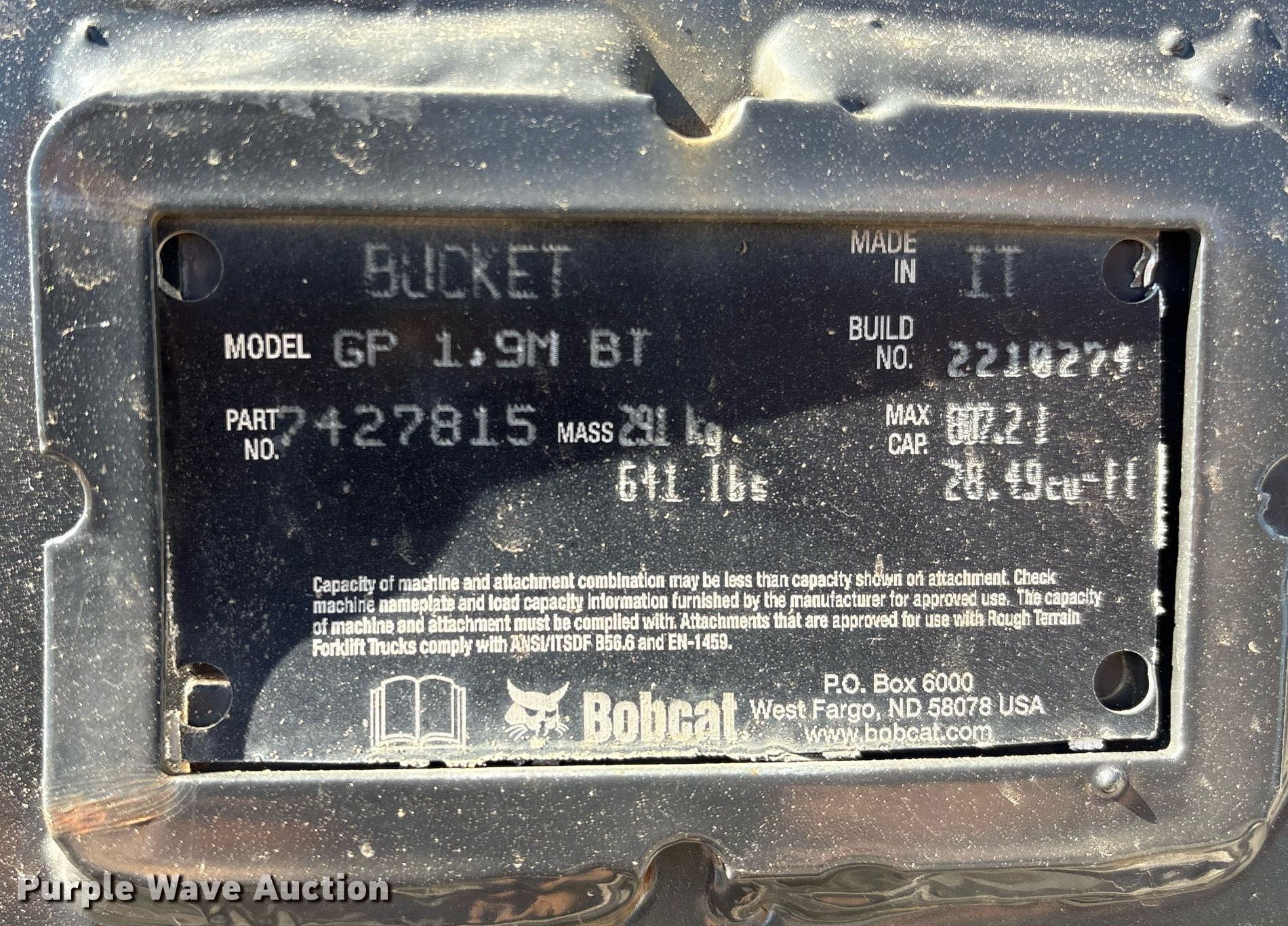 Bobcat GP 1.9M BT skid steer bucket has sold in Tulsa, Oklahoma for $797.50. Item EL2096 sold on June 19th, 2025.