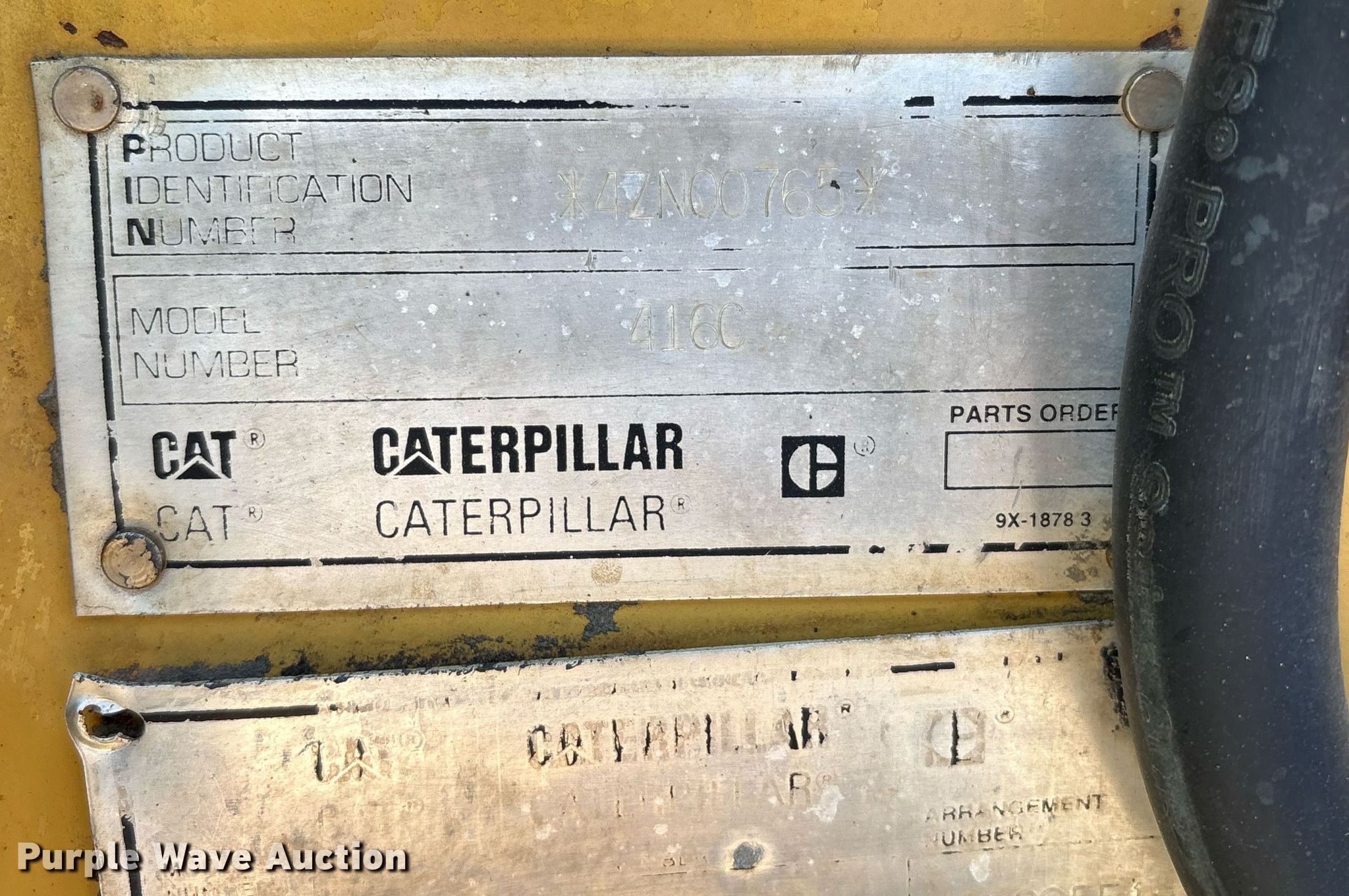 1997 Caterpillar 416C backhoe. Hours: 3,000 on meter, Serial: 4ZN00765. Engine Caterpillar, Cylinders: 4, Fuel type: Diesel. Transmission Shuttle shift, 4F - 4R. Chassis Four wheel drive, Differential lock. Operators station Enclosed cab, AC, Heat, Backhoe controls: Wobble stick / two stick. Features Loader Auxiliary hydraulics, Bucket Bucket leveler, Four-in-one, Width: 88", Cutting edge: Bolt-on, Backhoe Extendable stick, Width: 22", Teeth: 2. Tires Front: 320/80-18, Rear: 19.5L-24. Notes Glass cracked. Becco Contractors Inc. Tulsa, OK 74116