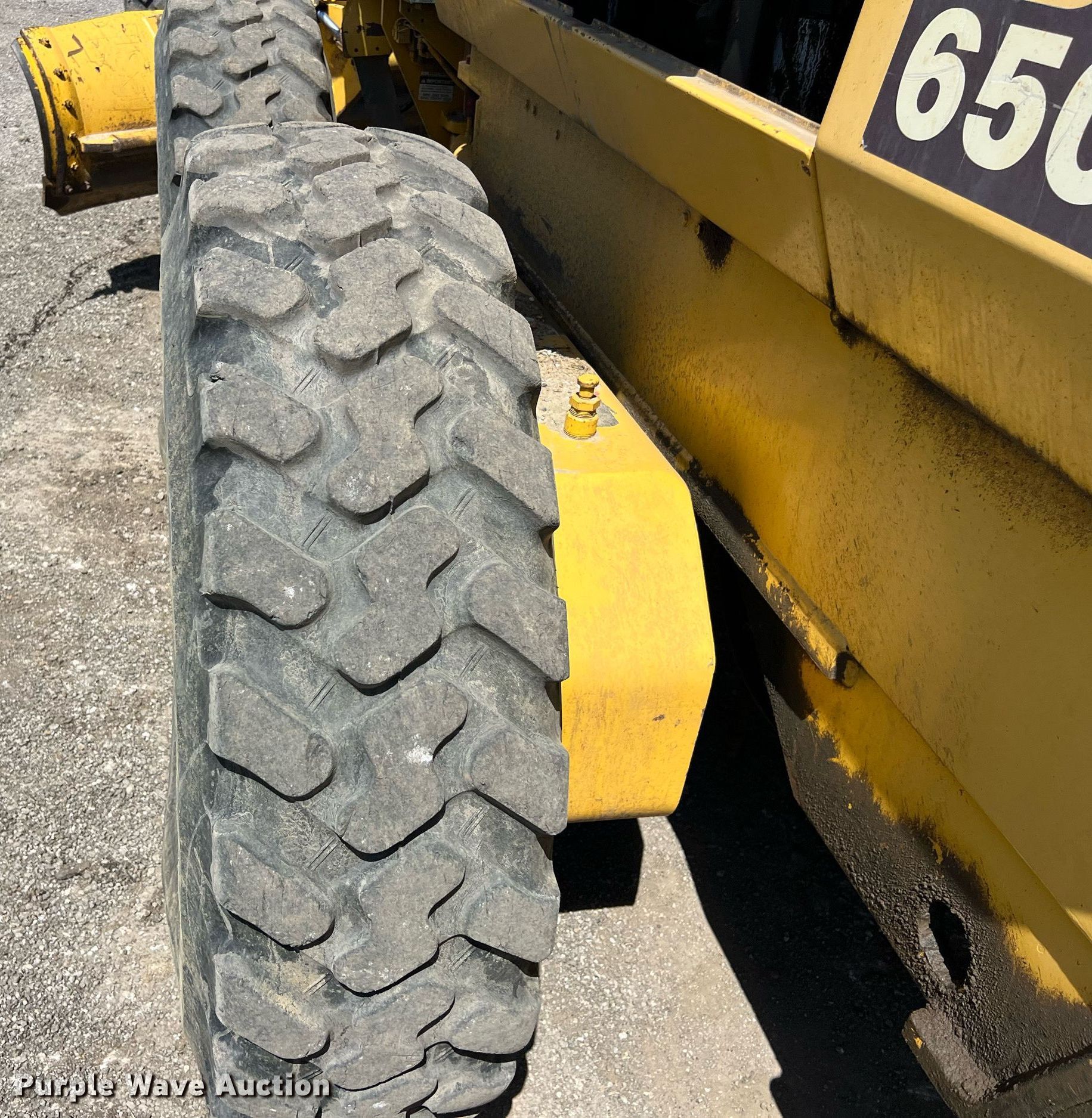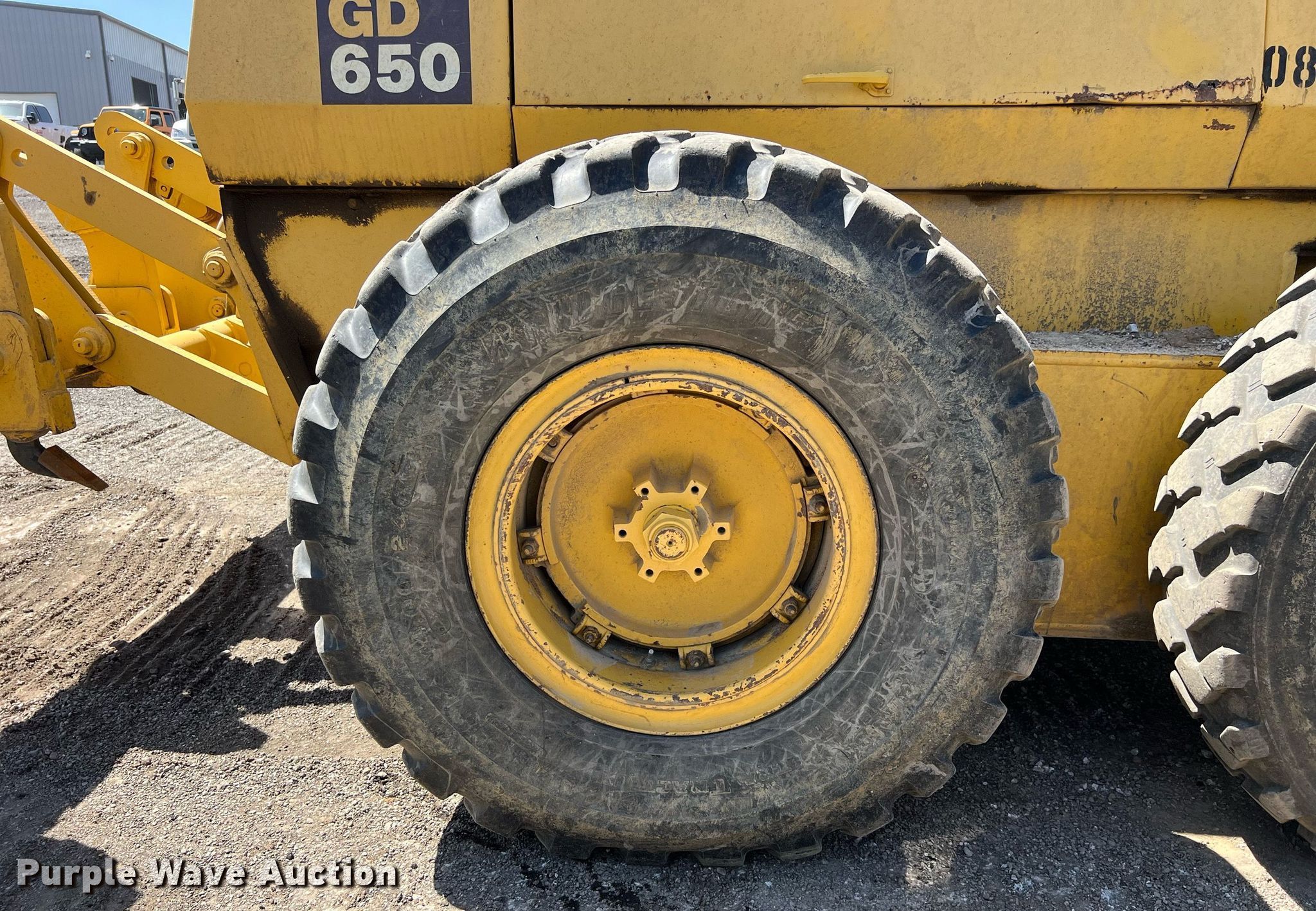 Komatsu GD650 motor grader. Hours: 15,924 on meter. Engine Komatsu, Cylinders: 6, Fuel type: Diesel. Transmission Powershift, 6F - 3R. Chassis Differential lock. Operators station Enclosed cab, Heat, Hydraulic control valves: 9. Features Moldboard: Tip control, Side shift, Moldboard total width: 14', Rear ripper Ripper shanks: 5, Scarifier teeth: 2. Tires Size: 14.00R24. Notes Glass cracked. Becco Contractors Inc. Tulsa, OK 74116