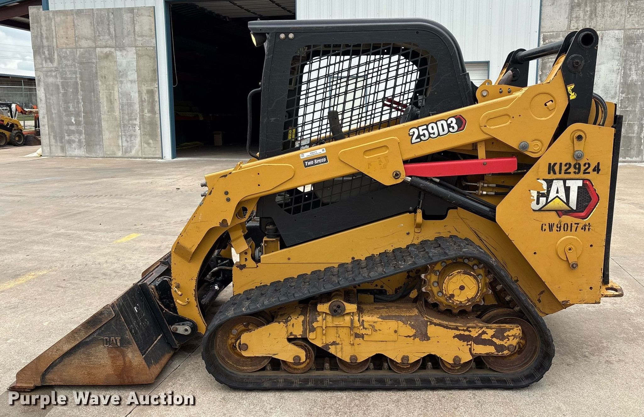 Purple Wave is selling a used Tracked Skid Steer Loader in Oklahoma. This item is a 2019 Caterpillar 259D3 tracked skid steer loader with the following: Hours: 2,332 on meter, Serial: CAT0259DKCW901741