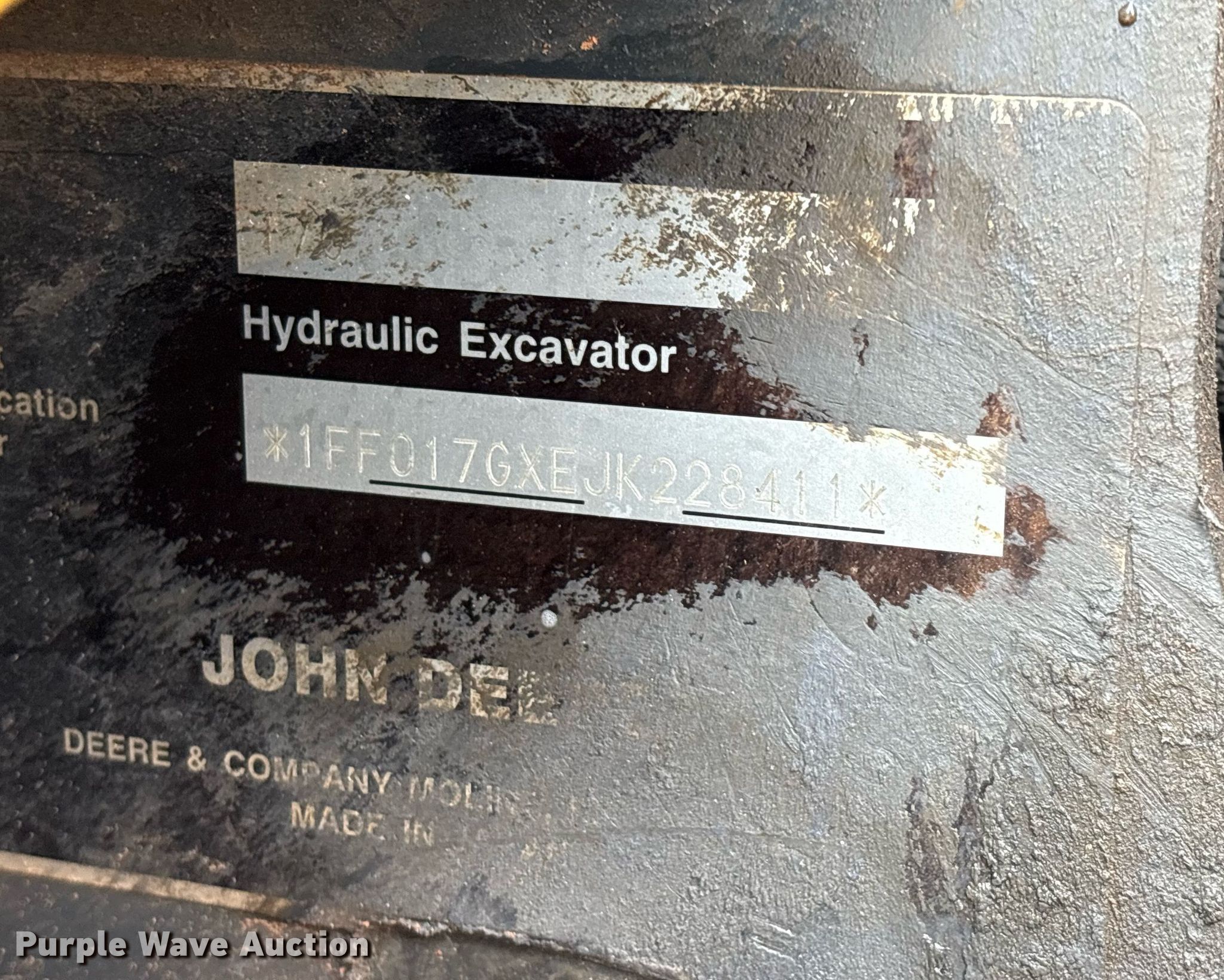 Purple Wave is selling a used Mini Excavator in Oklahoma. This item is a 2019 John Deere 17G mini excavator with the following: Hours: 2,409 on meter, Serial: 1FF017GXEJK228411