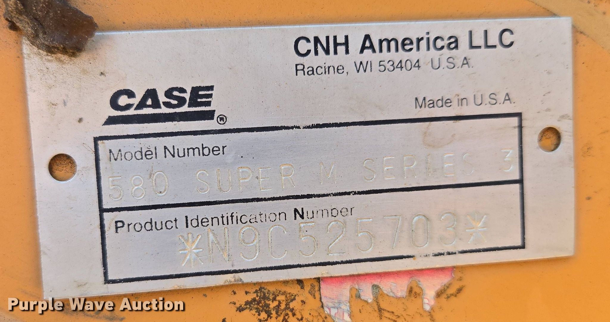 2009 Case 580 Super M Series 3 backhoe. Hours: 7,750 on meter, Serial: N9C525703. Engine Case 445TA/EAA, Displacement: 4.5L, Cylinders: 4, Fuel type: Diesel. Transmission Shuttle shift, 4F - 4R. Chassis Four wheel drive. Operators station Enclosed cab, AC, Heat, Backhoe controls: Four stick. Features Loader Bucket Width: 83", Cutting edge: Bolt-on, Backhoe Extendable stick, Auxiliary hydraulics, Bucket Width: 24", Teeth: 5.. Tires Front: 12-16, Rear: 19.5L-24. Notes Right lift arm cylinder hydraulic leak Rebuild kit included. Raytown, MO 64133