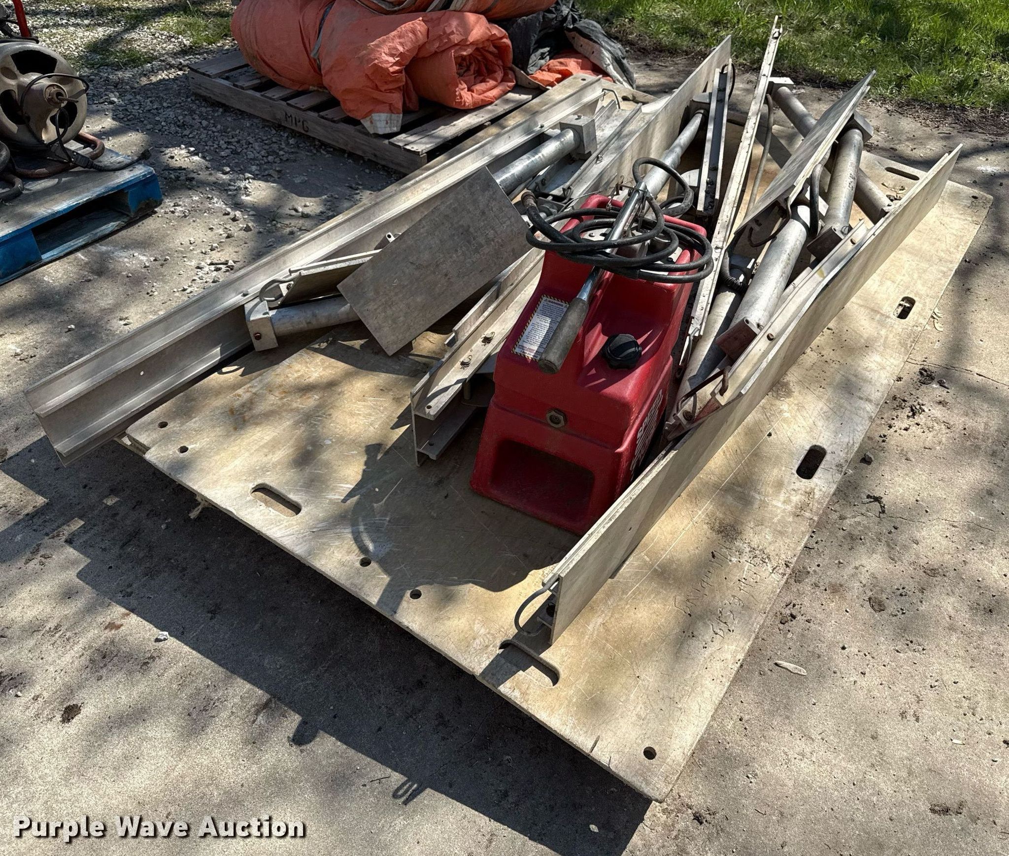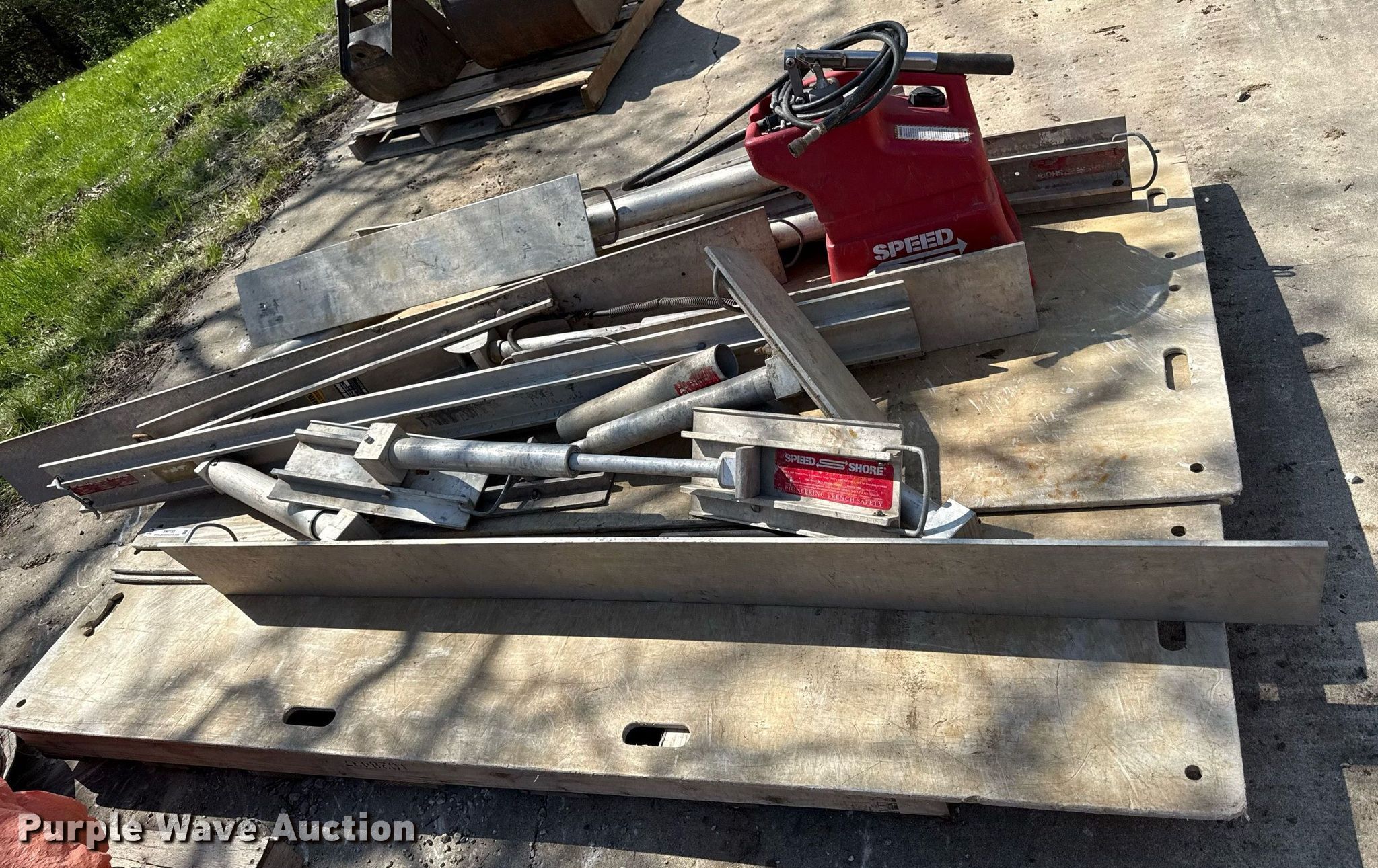Purple Wave is selling a used Underground Safety or Shoring in Missouri. This item is a Speed shoring system with the following: (4) 48" W x 96" L poly sheets, (4) braces, Hydraulic pump