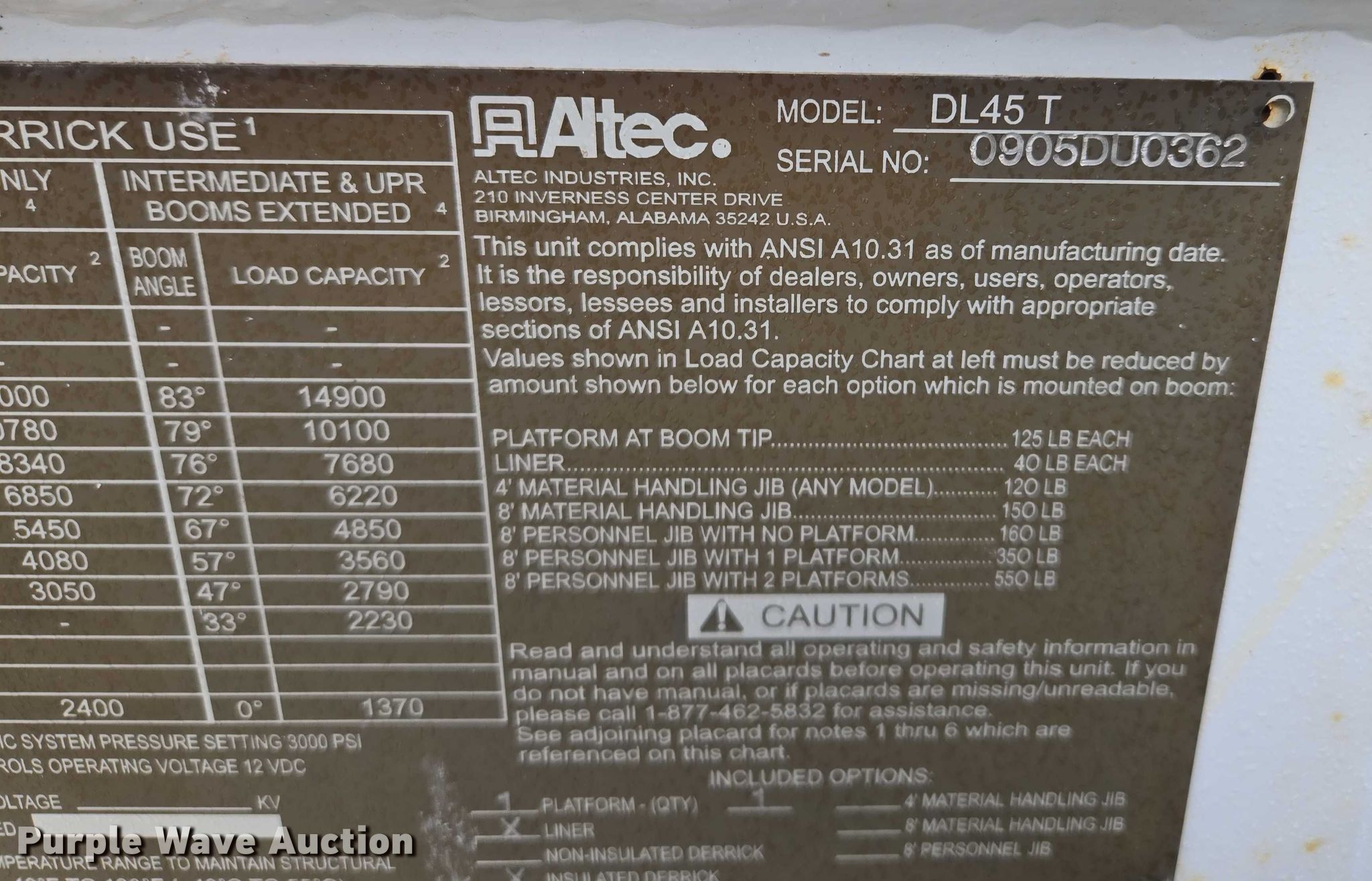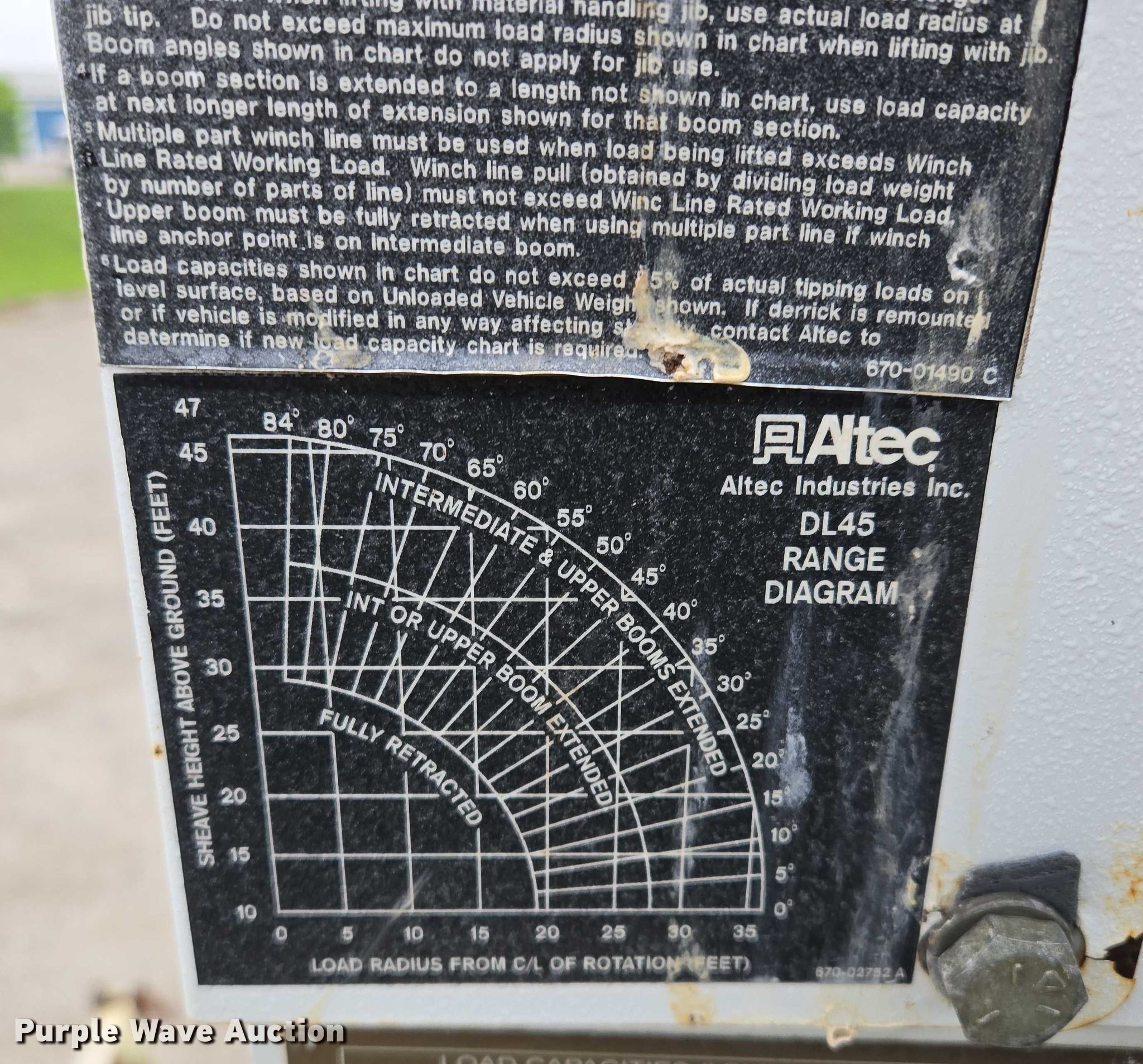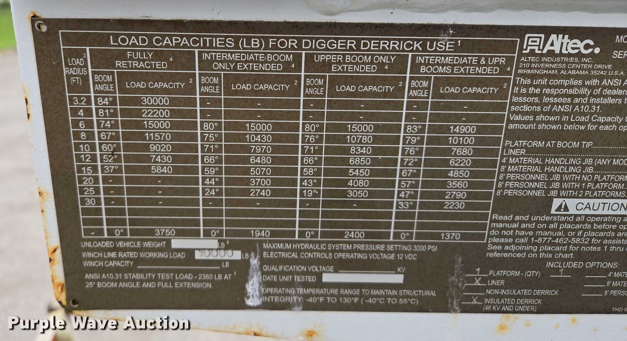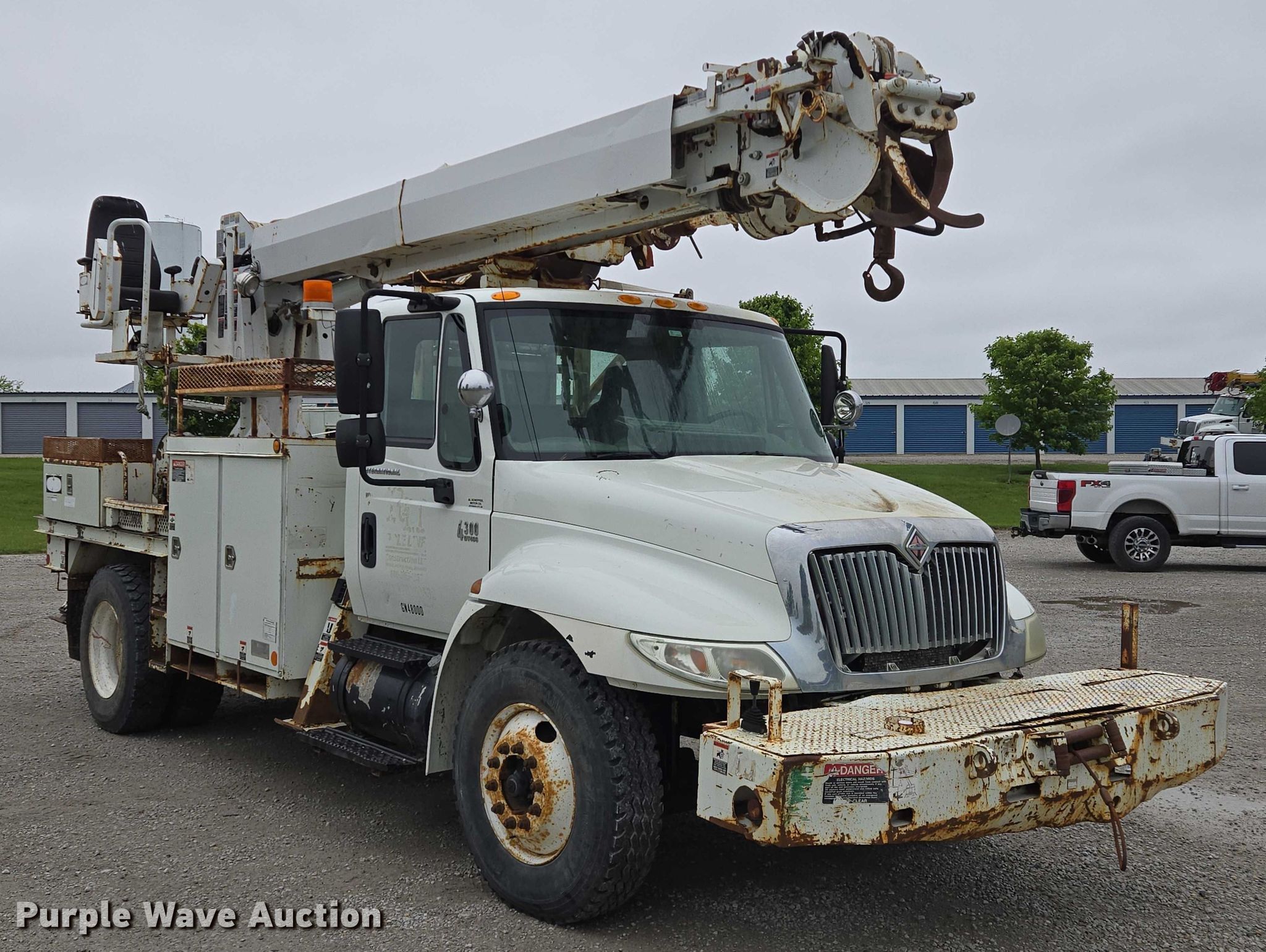 2006 International 4300 digger derrick truck. Miles: 168,619 on odometer, VIN: 1HTMMAAN76H229276. Engine International DT466, Displacement: 7.64L, Cylinders: 6, Fuel type: Diesel. Transmission International 6 Plus, Manual, Speed: 7. Chassis Axles: Single, Differential lock, Suspension: Spring, Brakes: Air, PTO, GVWR: 33,000 lbs. Interior AC, Heat, Cruise control. Features Bed Altec, Serial: 37-4331323, 13' L x 96" W, Boom Altec DL45 T, Serial: 0905DU0362, Boom length: 45', Maximum lift capacity: 15,000 lbs, Maximum lift height: 47', Boom type: Telescopic, Boom controls Platform/ basket, Material handler, Pole guide, Auger Diameter: 18".. Tires Size: 11R22.5. Notes Dash warning indicator: Check engine, ABS, Fuel filter, Warn engine, Engine. Oklahoma title. Title distribution may be delayed up to 30 days from verification of funds. Plattsburg, MO 64477