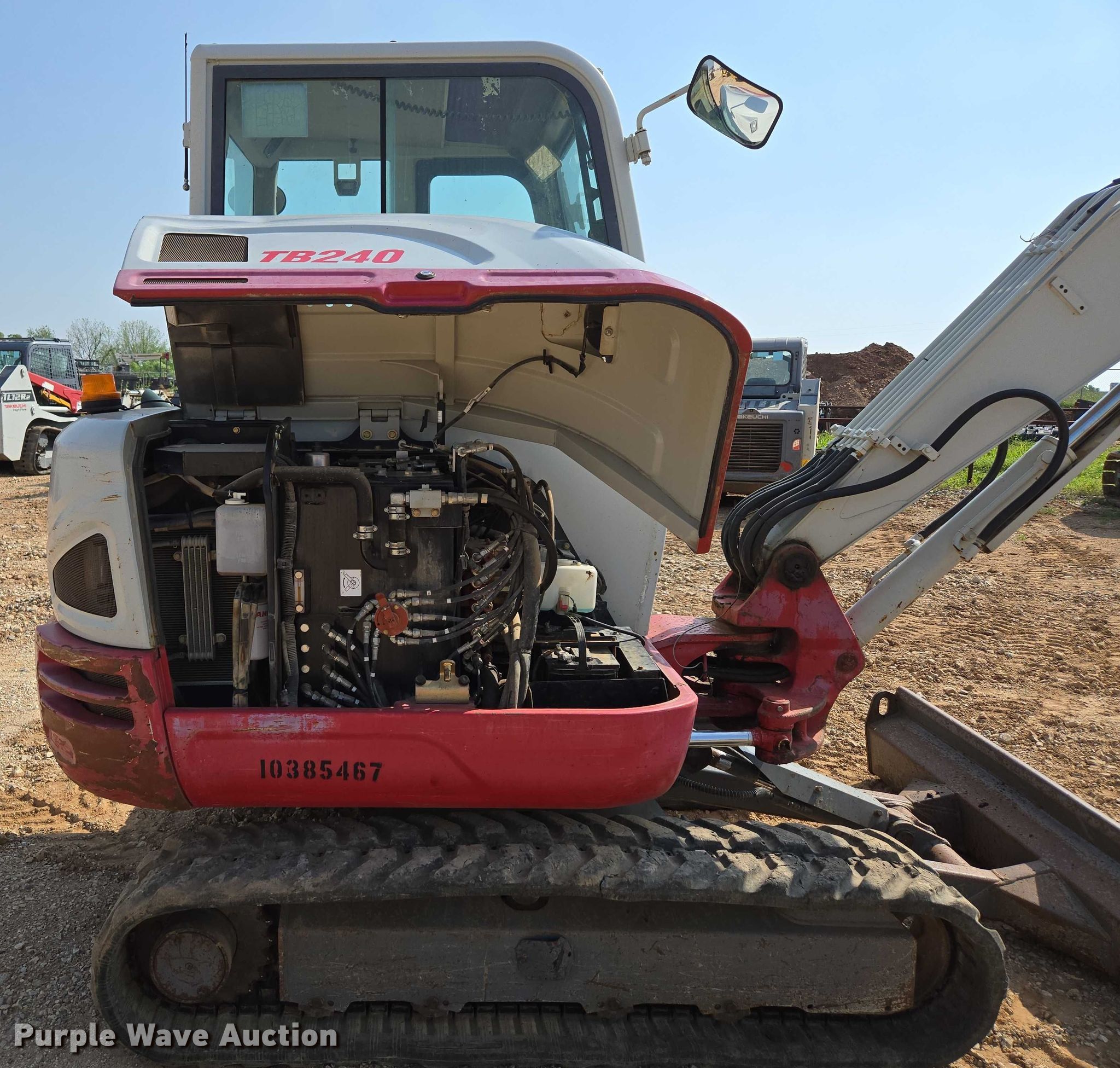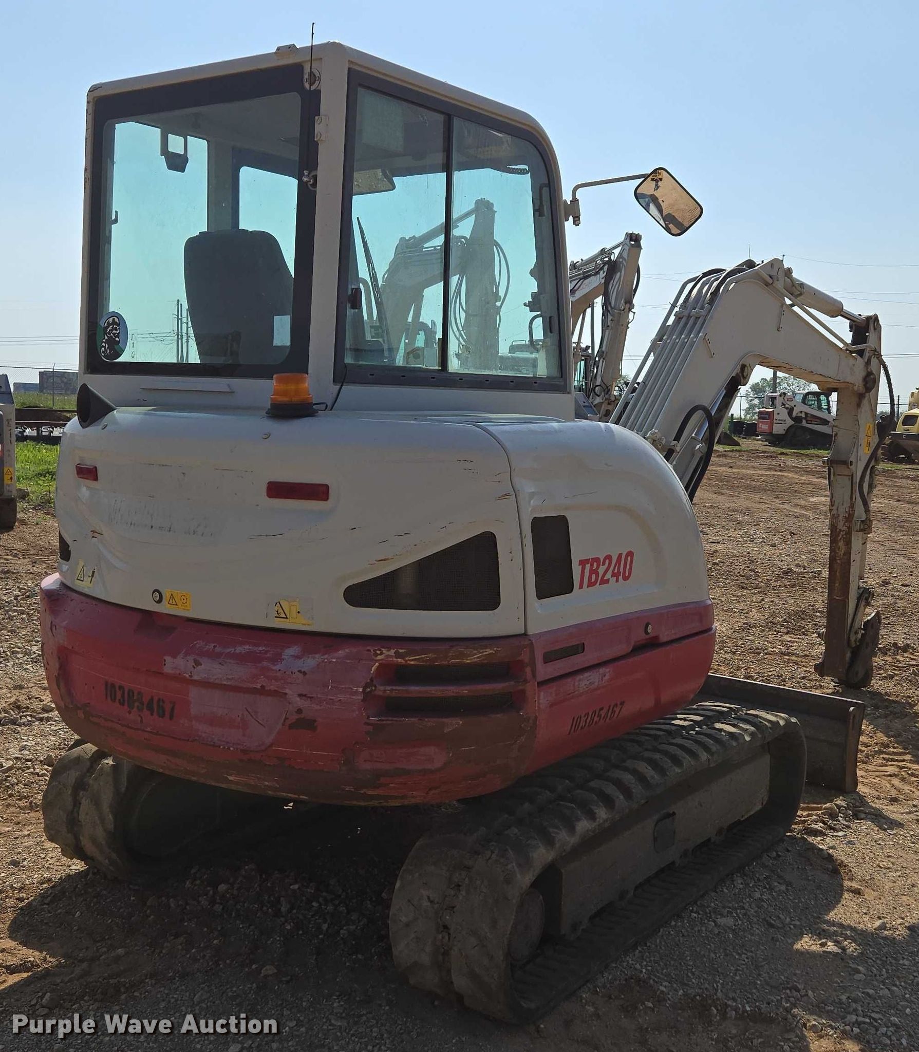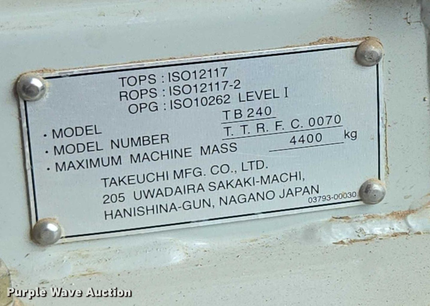Purple Wave is selling a used Mini Excavator in Missouri. This item is a 2015 Takeuchi TB240 mini excavator with the following: Hours: 3,953 on meter, Serial: 124000510, Unit #: 93336