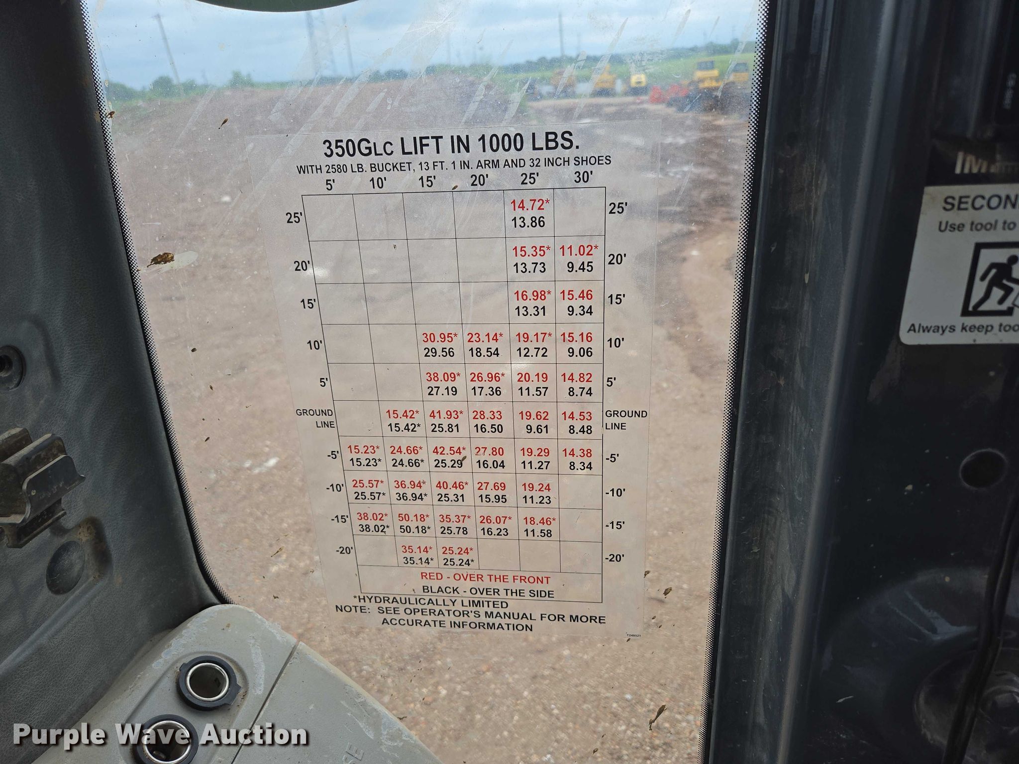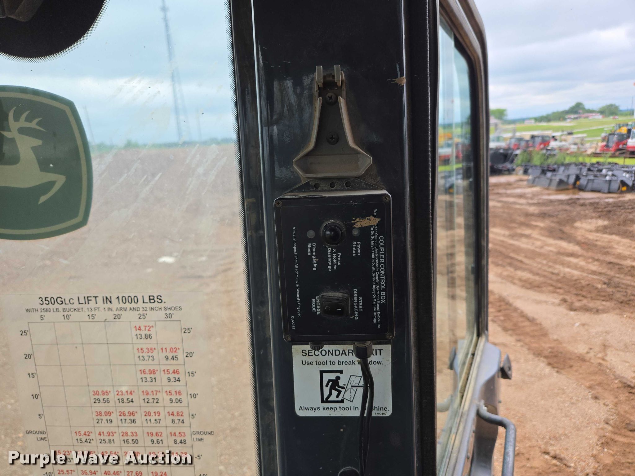 2012 John Deere 350G LC excavator. Hours: 8,882 on meter, Serial: 1FF350GXECE808591, Unit #: 93445. Engine John Deere 6090HT010, Displacement: 9.0L, Cylinders: 6, Fuel type: Diesel. Transmission Hydrostatic. Operators station Enclosed cab, OROPS, AC, Heat. Features Auxiliary hydraulics, Boom Standard, Stick Stick length: 13', Quick coupler: Hydraulic Dromone JD330, Bucket TAG Deere 350G, Width: 31.5", Teeth: 3. Tracks Width: 31.5", Steel, Grouser pads: Triple. Notes Door latch issues, difficult to open from the inside, Outside door keeper latch issues, Loose wires on back right corner of machine, Loose step on right rear of track carriage, Contents not included, Non-operational HVAC. Midwest equipment. Springfield, MO 65802