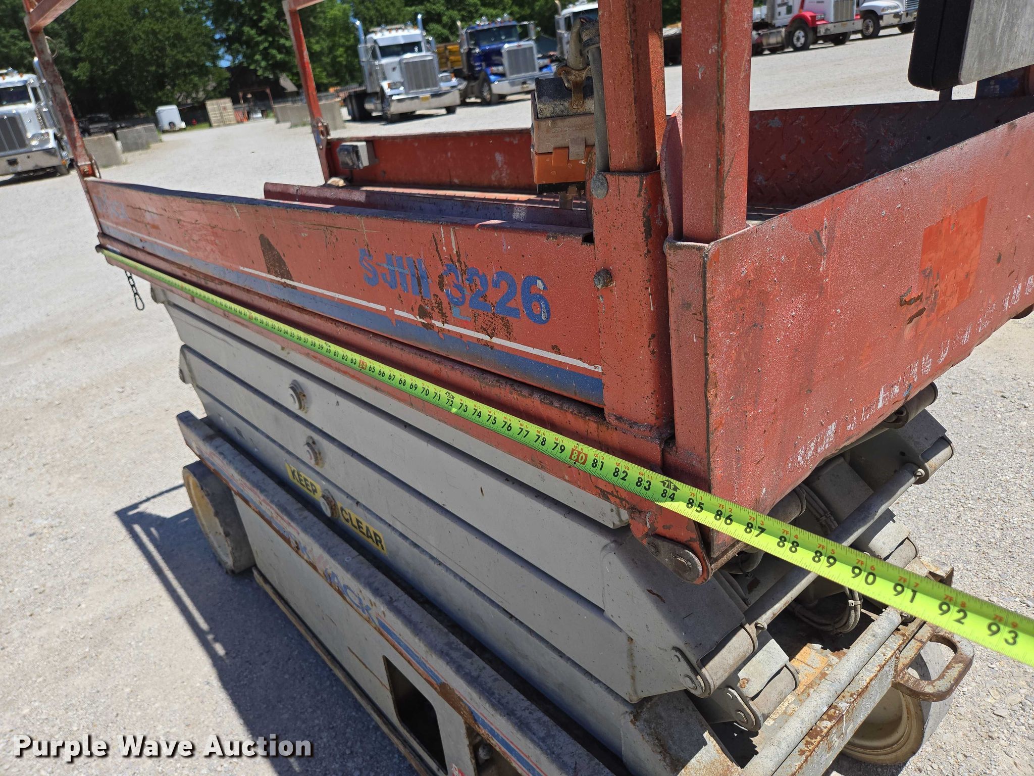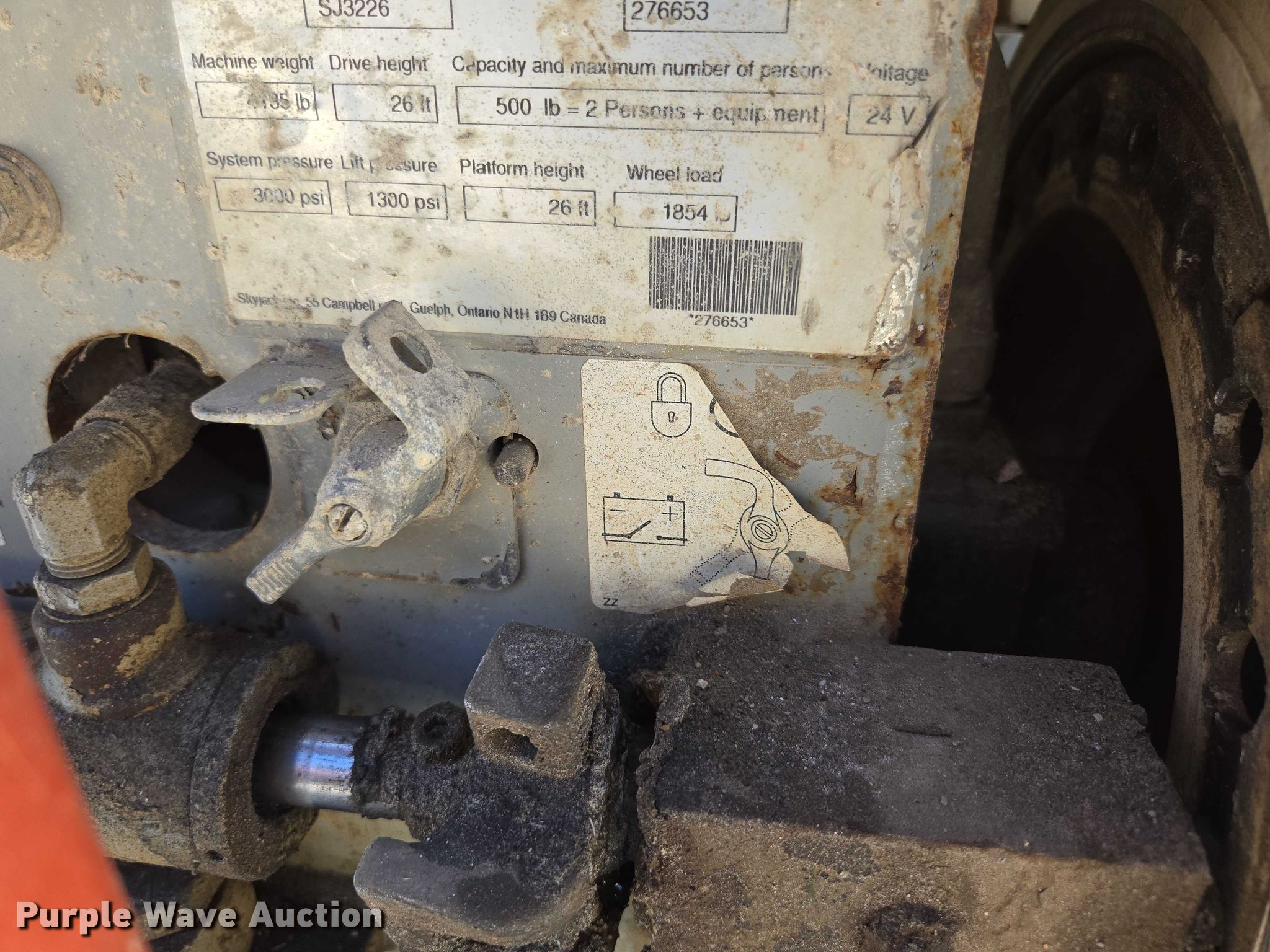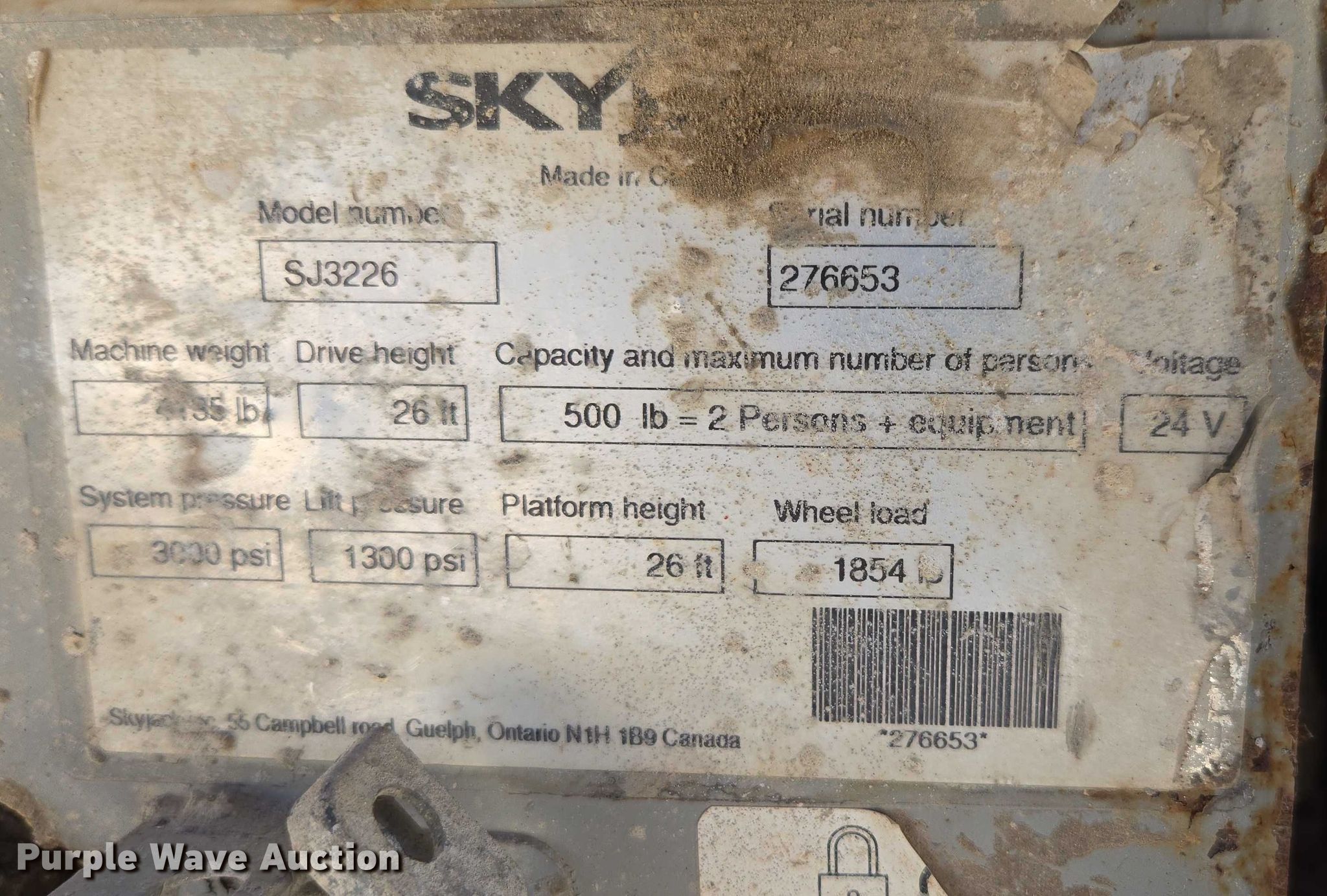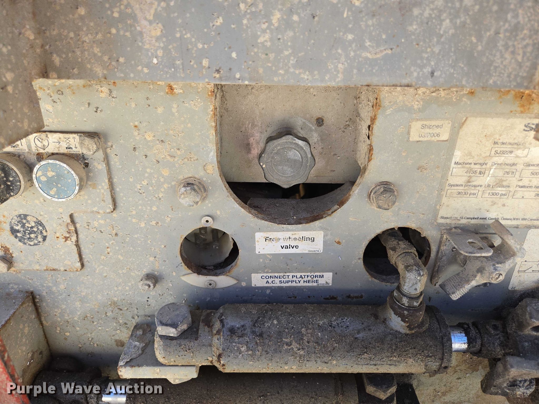 2006 Skyjack SJ3226 scissor lift. Hours: 479 on meter, Serial: 276653. Electric Motor Volts: 24. Features Maximum lift capacity: 500 lbs, Maximum lift height: 26', Platform: 85" L x 31" W, AC power outlet, Controls: Remote, Platform extensions: Manual. Tires Solid. Nabholz Inc.. Rogers, AR 72756