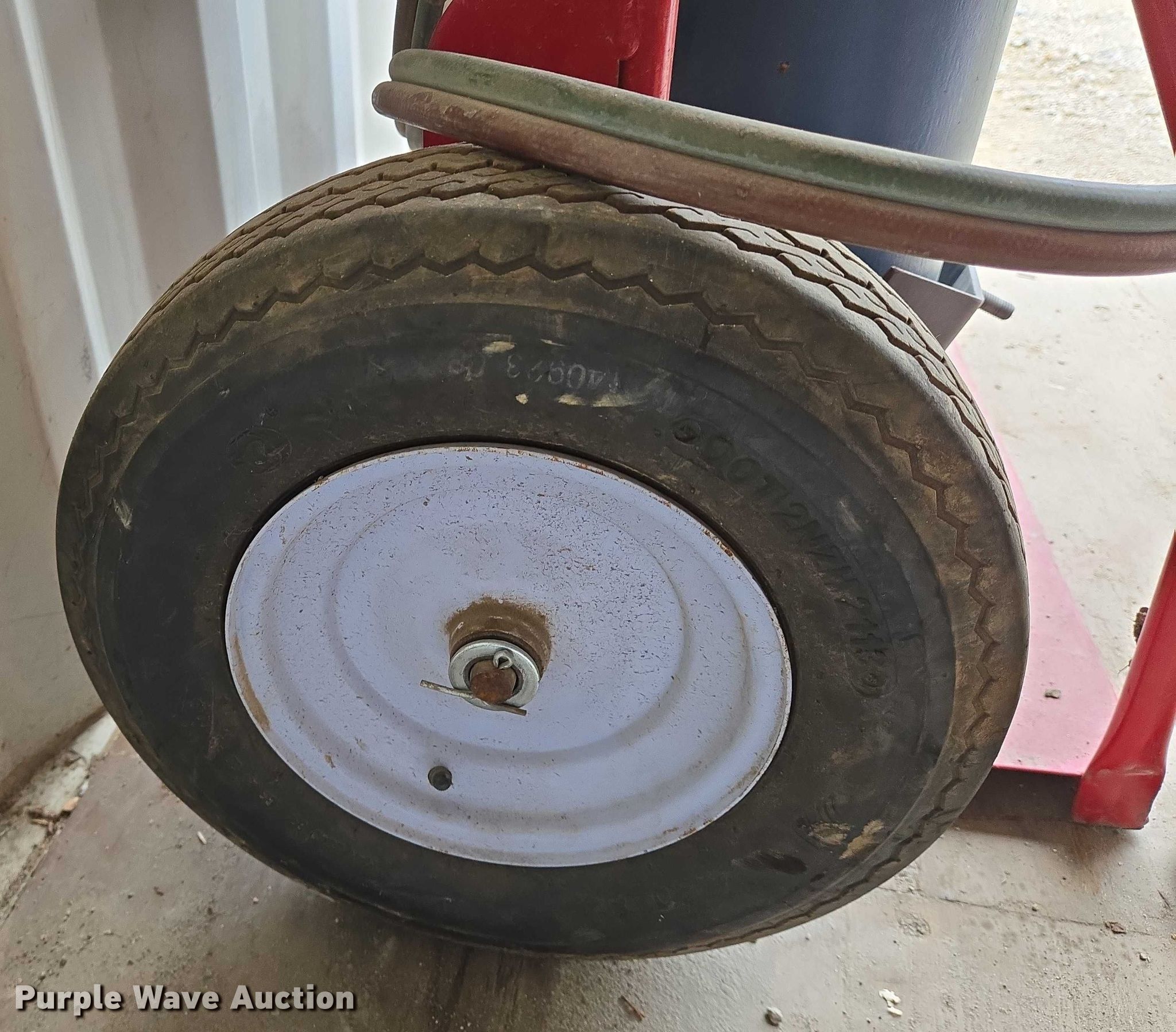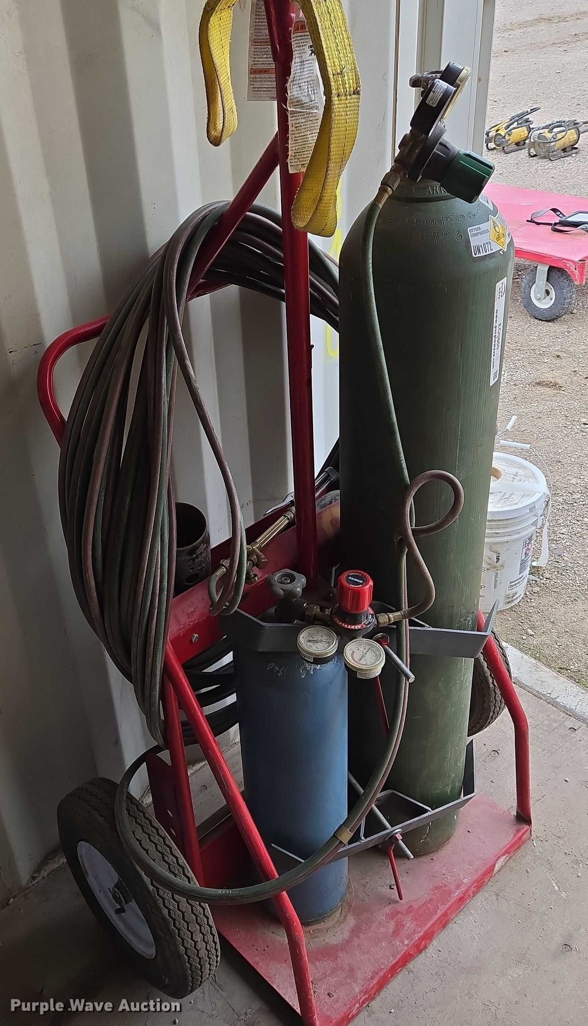 Purple Wave is selling a used Torch in Kansas. This item is a Cutting torch bottles with the following: Oxygen bottle, Acetylene bottle, Regulator, Cutting torch, Dolly, Tire sire: 4.80-8