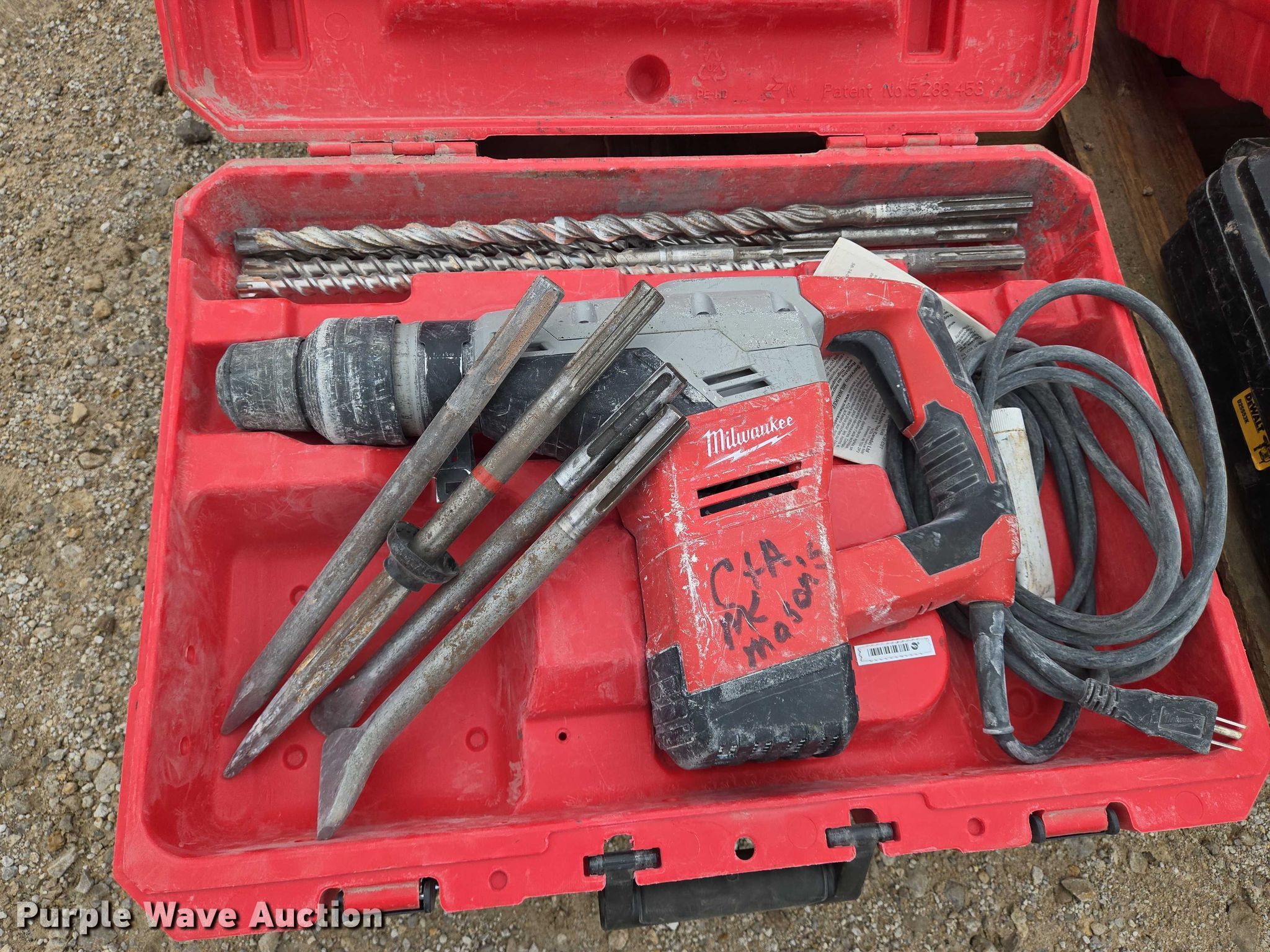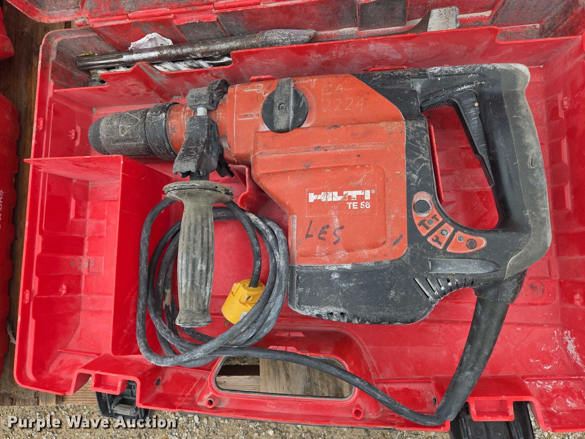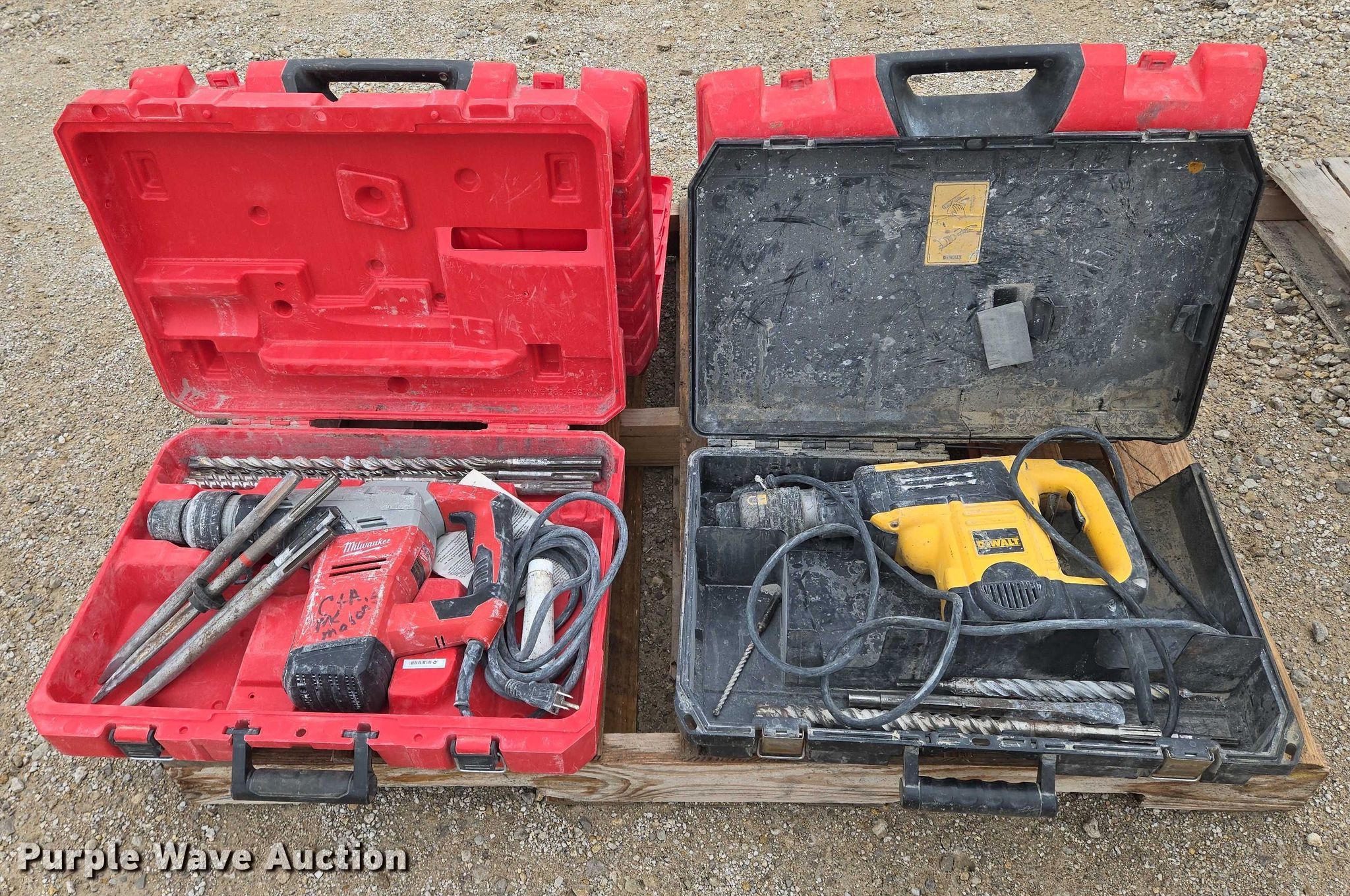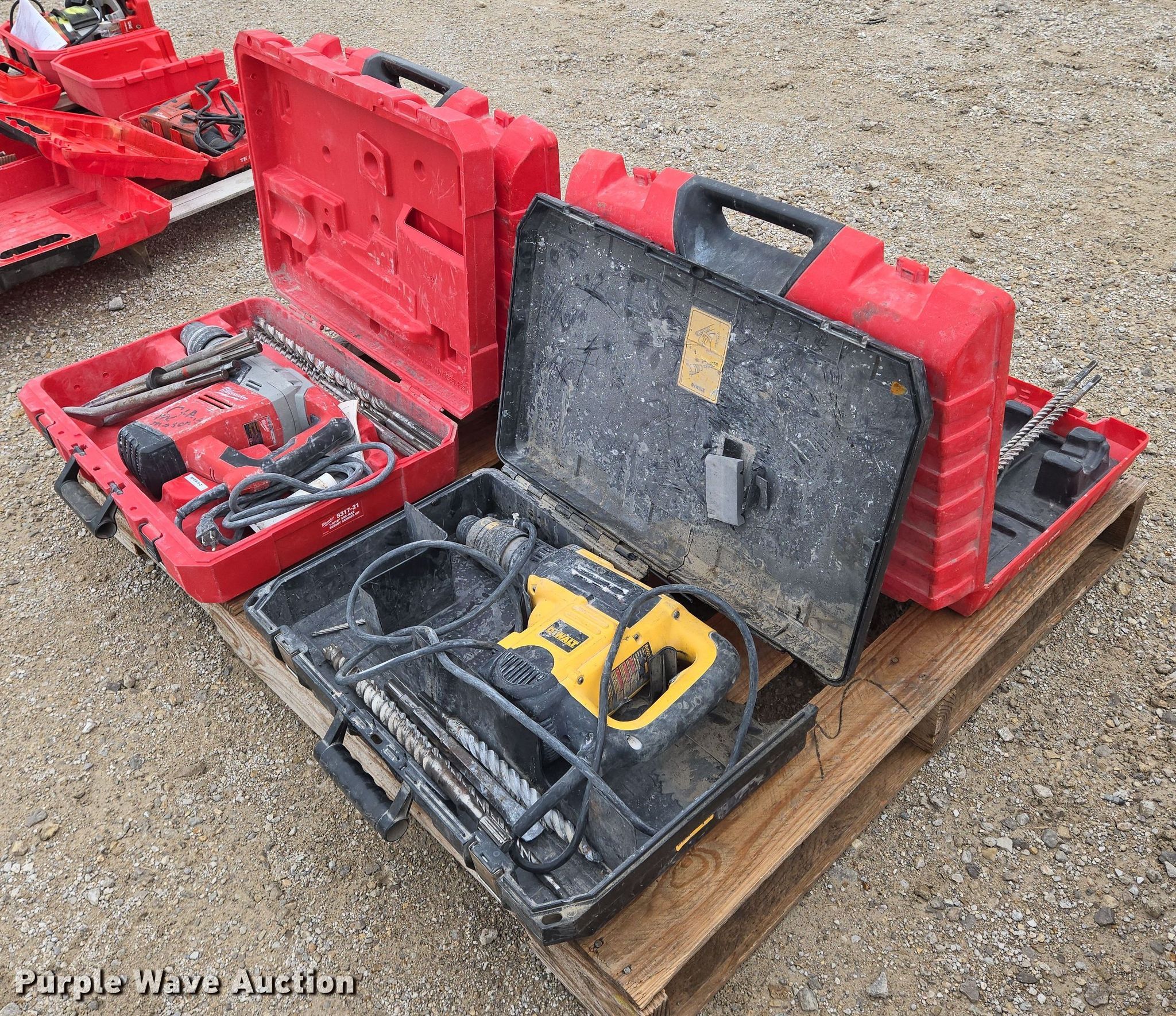 Purple Wave is selling a used Tools in Kansas. This item is a (4) hammer drills with the following: Dewalt, (5) bits, Hilti TE 56, (4) bits, Hilti TE 4-A18, (12) bits, Milwaukee, (8) bits