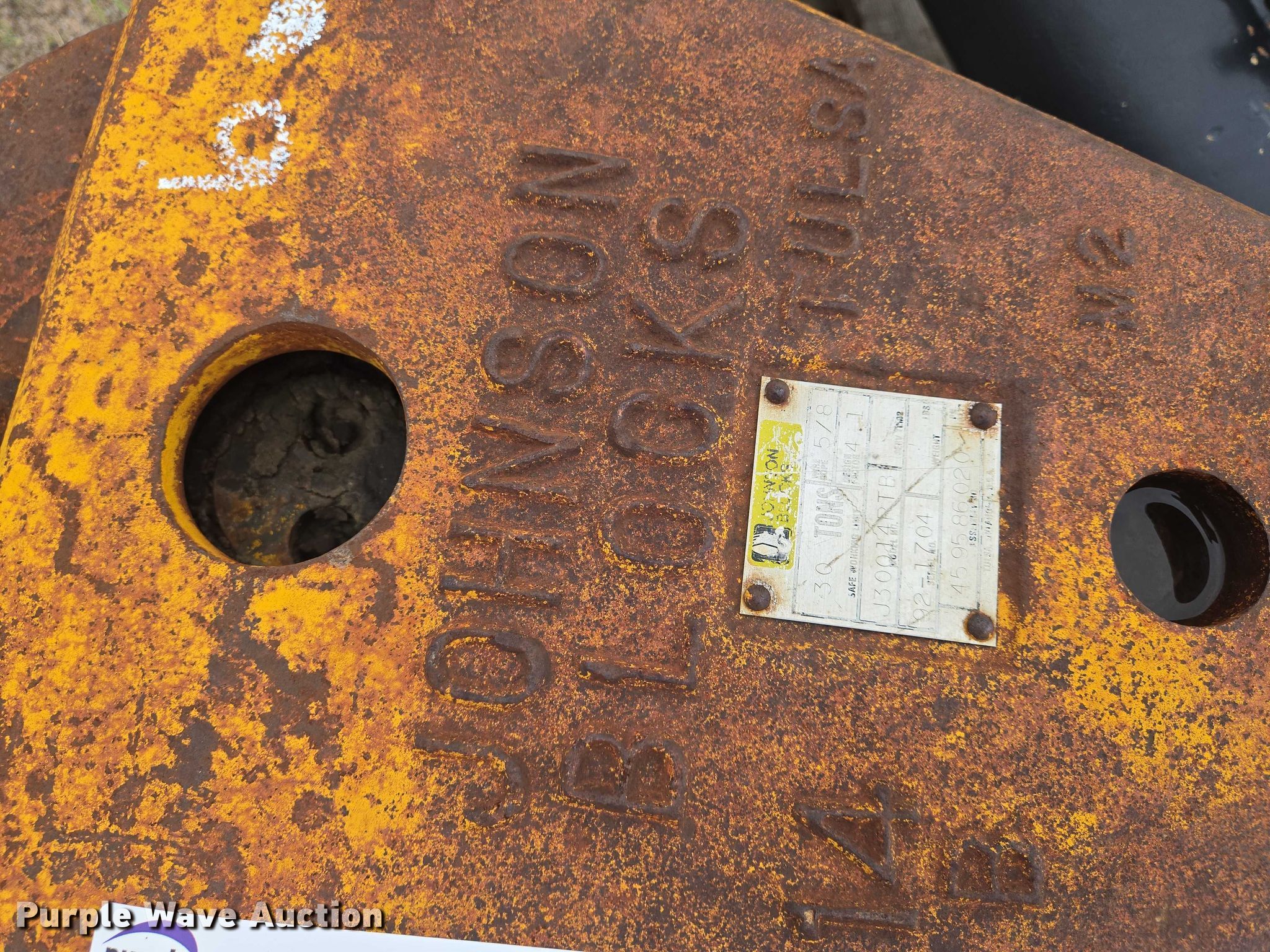Purple Wave is selling a used Crane Attach. in Kansas. This item is a Johnson crane block with the following: Serial: 92-1704, Rope wire capacity: 5/8", Capacity: 30 tons, Sheaves: 4