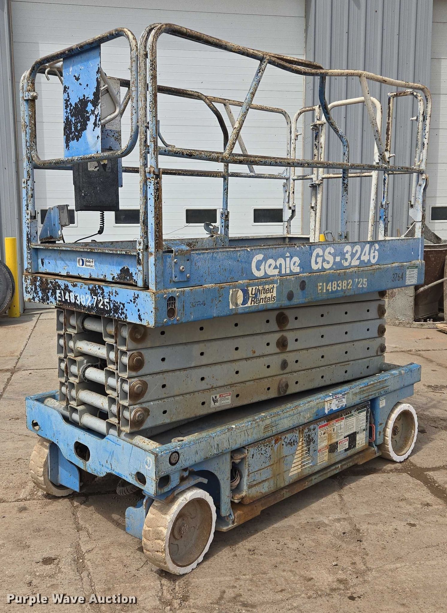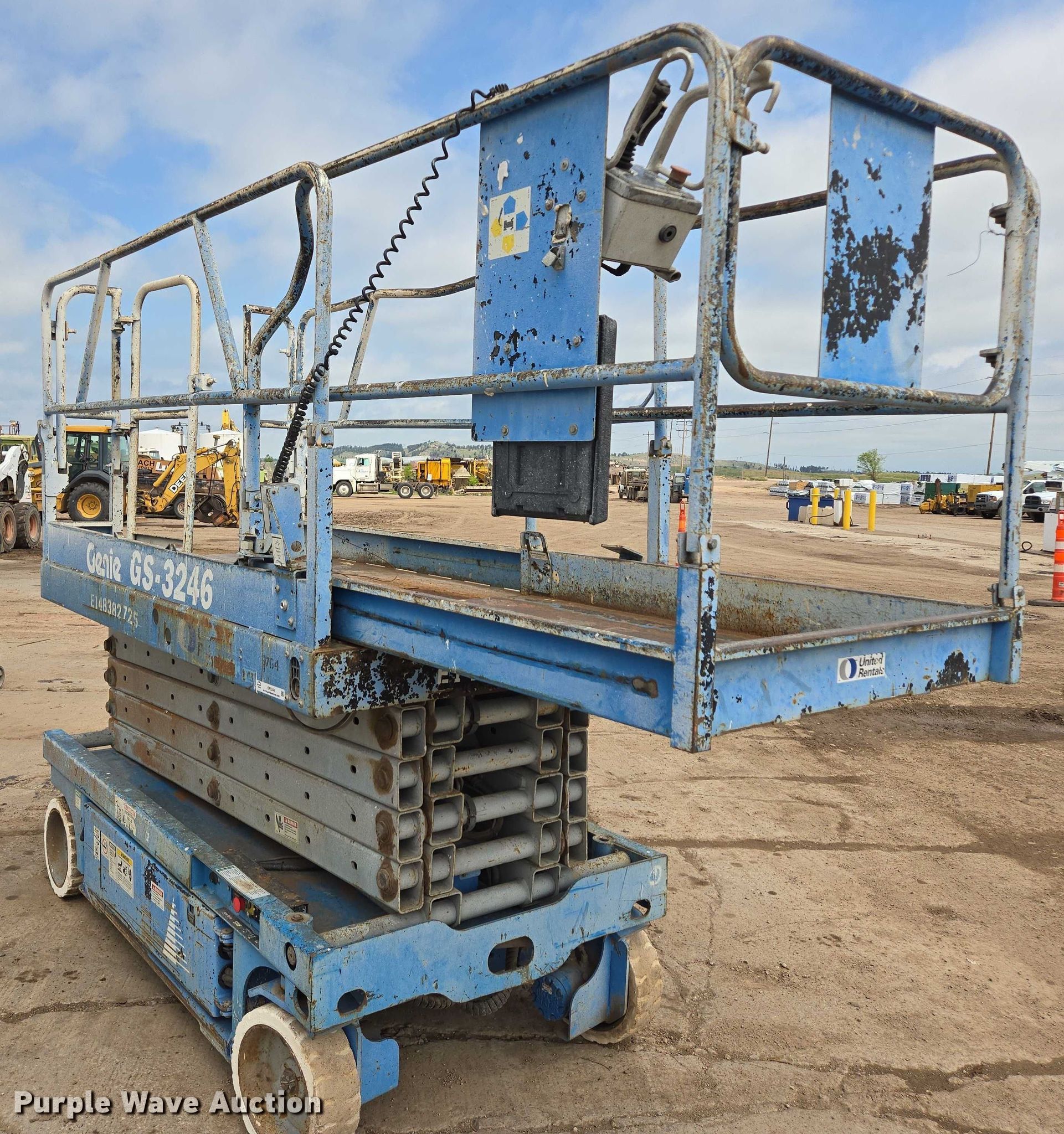 Purple Wave is selling a used Scissor or Vertical Lift in South Dakota. This item is a 1999 Genie GS3246 scissor lift with the following: Hours: Unknown, Serial: 20465