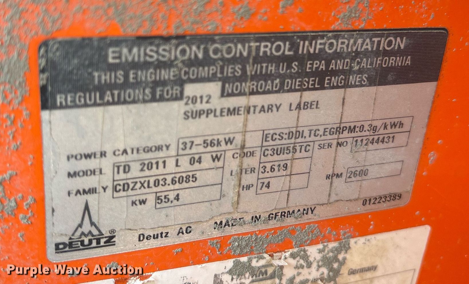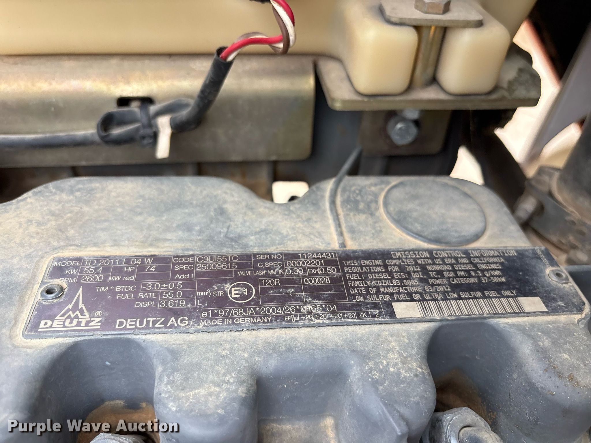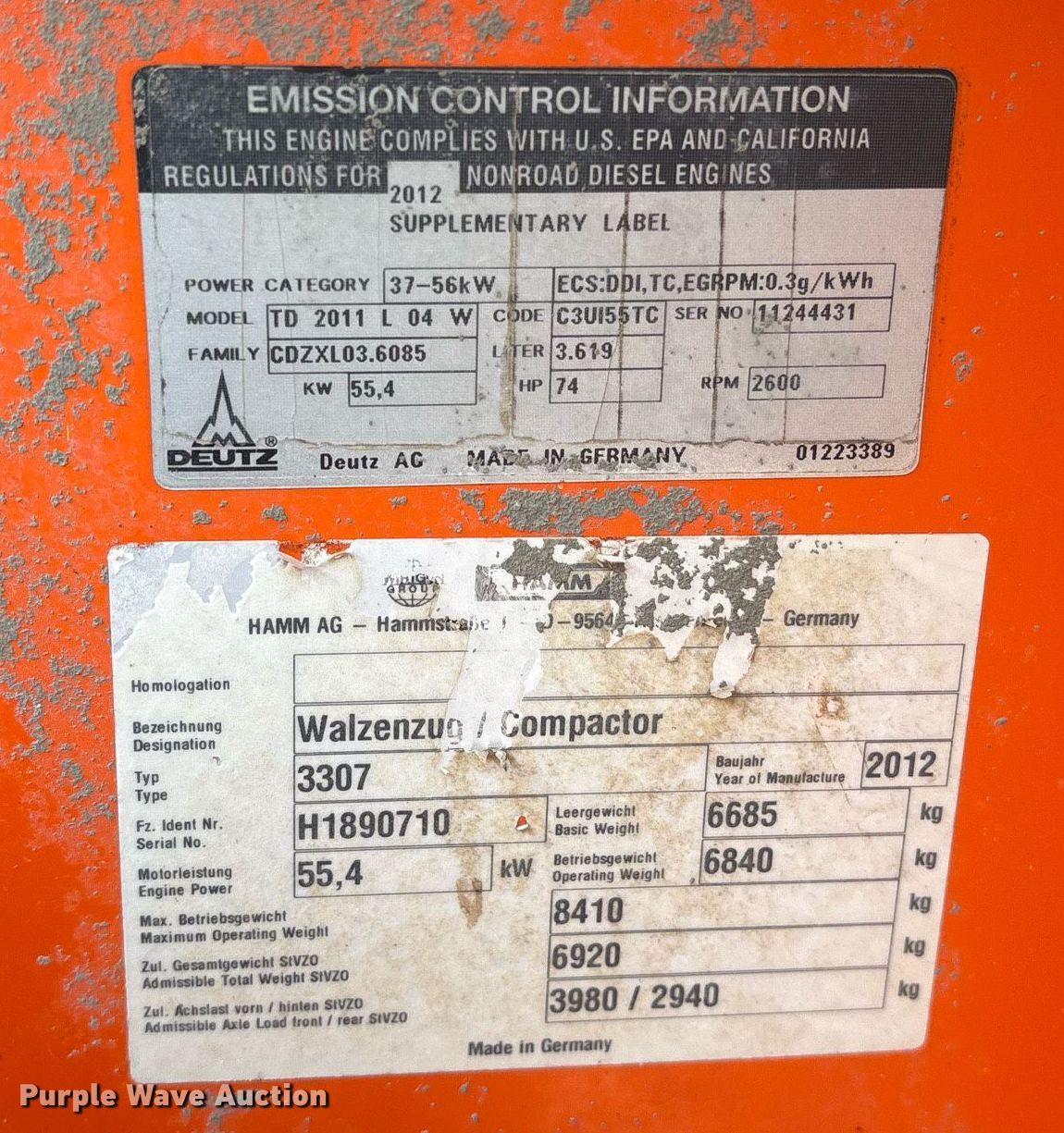 2012 Hamm 3307 single drum vibratory roller. Hours: 2,909 on meter, Serial: H1890710, Unit #: 5409. Engine Deutz TD2011L04W, Serial: 11244431, Displacement: 3.619L, Cylinders: 4, Fuel type: Diesel, HP: 74, kW: 55. Transmission Hydrostatic, Two speed travel. Operators station OROPS. Features Drum: Smooth, Vibratory system: Single, Two speed, Front drum Width: 66", Diameter: 48", Drum scrapers: Front, Rear. Tires Size: 14.9-24. Notes Warning indicator: Heat sensor light blinks Possible heat sensor warning light issues. Welch Excavation. Winona, TX 75792