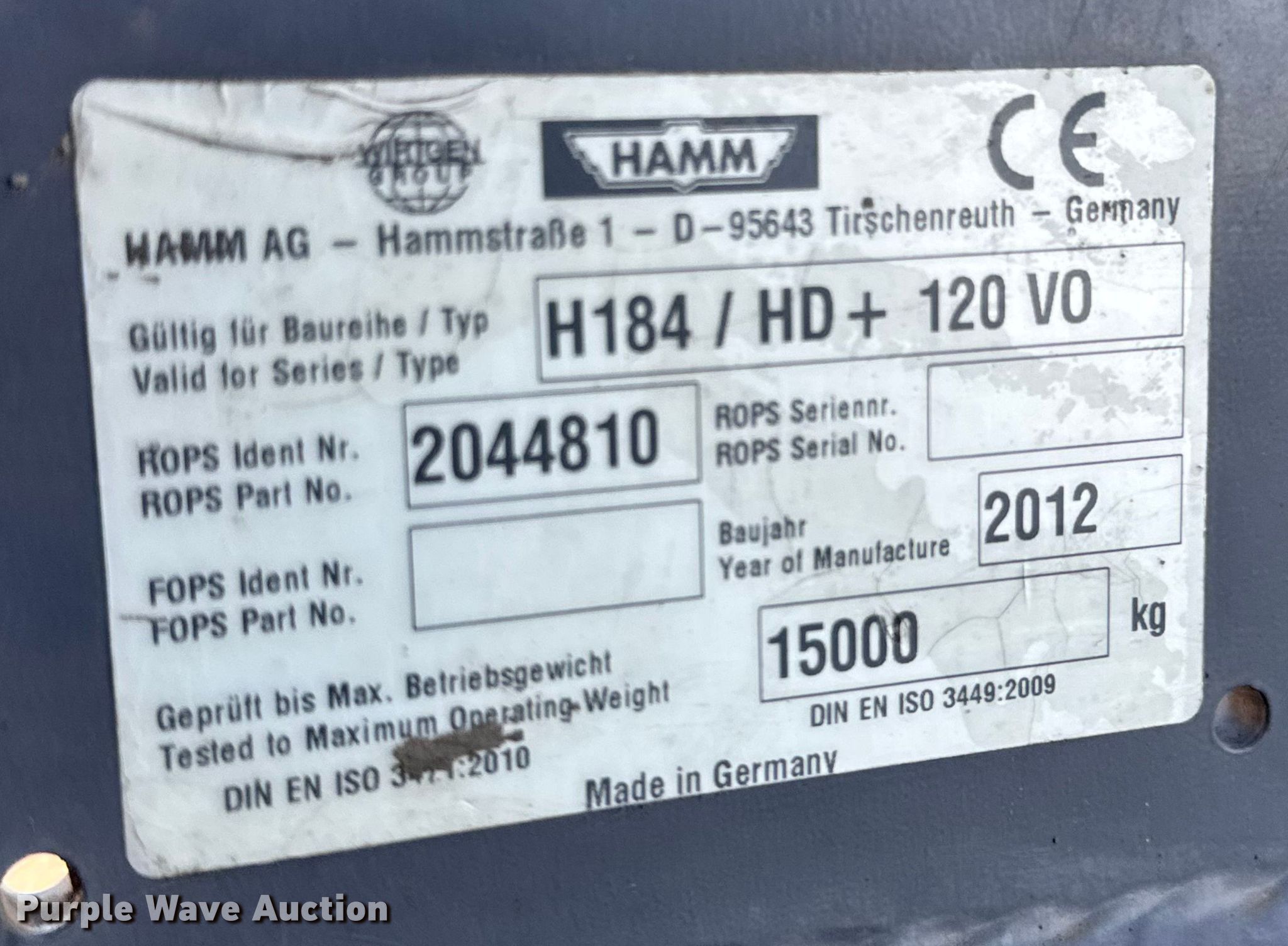 2012 Hamm HD+120VO double drum vibratory roller. Hours: 3,343 on meter, Serial: H1840723. Engine Deutz TCD 2012 L04 2V, Cylinders: 4, Fuel type: Diesel. Transmission Hydrostatic. Operators station OROPS. Features Drum: Smooth, Vibratory system: Double, Front drum Width: 78", Diameter: 55", Rear drum Width: 78", Diameter: 54", Drum scrapers: Front, Rear, Water spray applicator: Front, Rear. Venture Corp. Great Bend, KS 67530