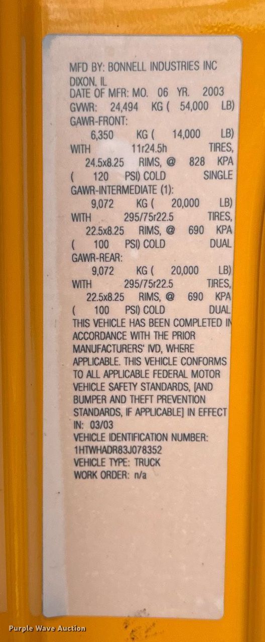 2003 International 7400 dump truck. Miles: 122,026 on odometer, Hours: 6,676 on meter, VIN: 1HTWHADR83J078352, Unit #: 10. Engine International DT530, Displacement: 8.7L, Cylinders: 6, Fuel type: Diesel. Transmission Automatic. Chassis Axles: Tandem, Suspension: Spring over walking beam, Brakes: Air, PTO, GVWR: 54,000 lbs FAWR: 14,000 lbs, IAWR: 20,000 lbs, RAWR: 20,000 lbs. Interior AC, Heat, Heated mirrors, Power windows, Cruise control. Features Dump bed Heil HPT-53, 13' L x 96" W, Side height: 37", Side board height: 18", Bed type: Steel, Bed vibrator, Ram: Single, End gate: Air operated, Spreader Bonnell, Plow Bonnell 12ST42MX1E, Width: 144". Tires Front: 12R22.5, Rear: 11R22.5. Notes Bed apron removed but included. Illinois title. Title distribution may be delayed up to 14 days from verification of funds. Kendall County Highway Dept.. Yorkville, IL 60560