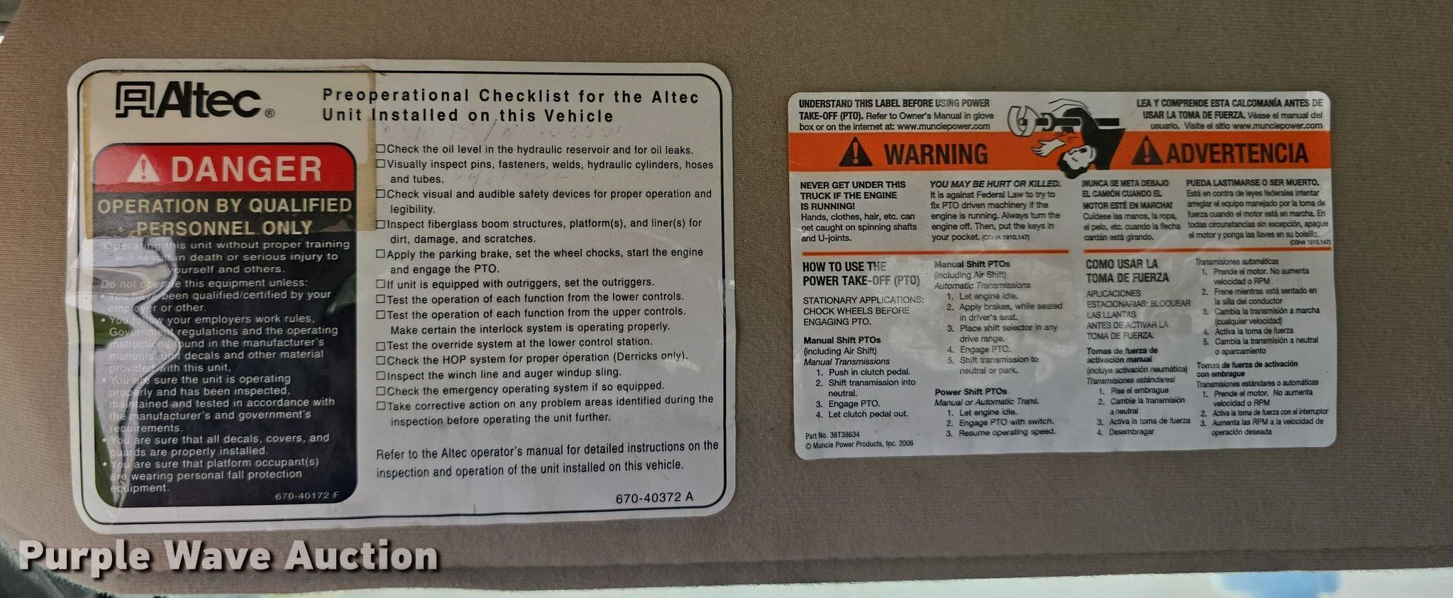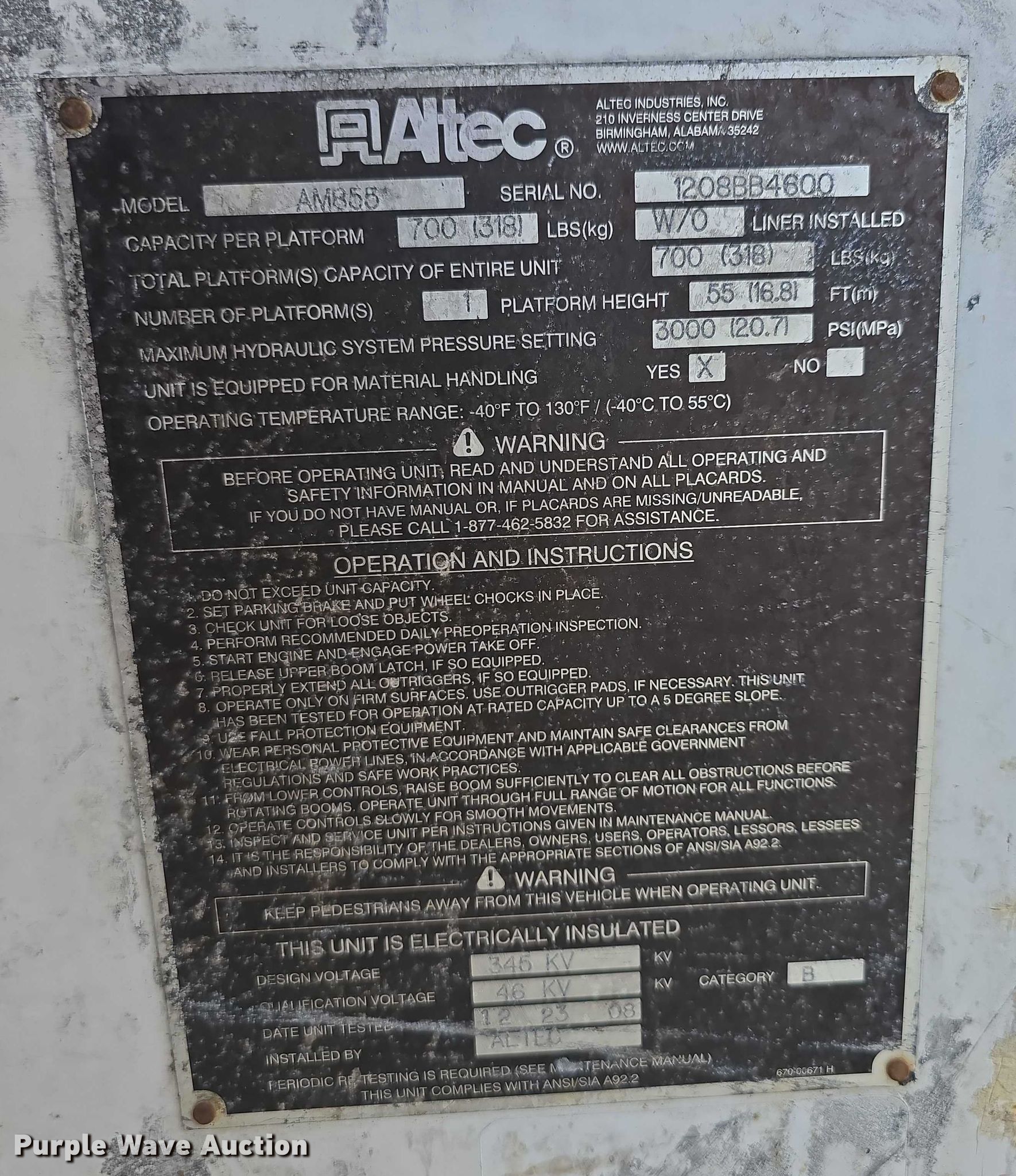 2009 Chevrolet C8500 bucket truck. Miles: 53,319 on odometer, VIN: 1GBM8C1B09F405382. Engine Isuzu 6HK1-TC, Displacement: 7.8L, Cylinders: 6, Fuel type: Diesel. Transmission Allison, Automatic. Chassis Axles: Single, Suspension: Spring, Brakes: Air, PTO, GVWR: 33,000 lbs, Wheelbase: 178". Interior AC, Heat, Cruise control, Auxiliary controls. Features Bed Altec, Serial: 37-11461462, 15' L x 96" W, Boom Altec AM855, Serial: 1208BB4600, Maximum lift capacity: 700 lbs, Maximum lift height: 55', Boom type: Articulating, Insulated, Man basket, Boom controls Ground, Platform/ basket, Material handler, Front mounted winch. Tires Size: 11R22.5. Notes Dash warning indicator: Check engine, Exhaust regen light, Smoke damage from building fire. Item subject to future title branding. Nebraska title. Title distribution may be delayed up to 14 days from verification of funds. City of Wymore. Wymore, NE 68466