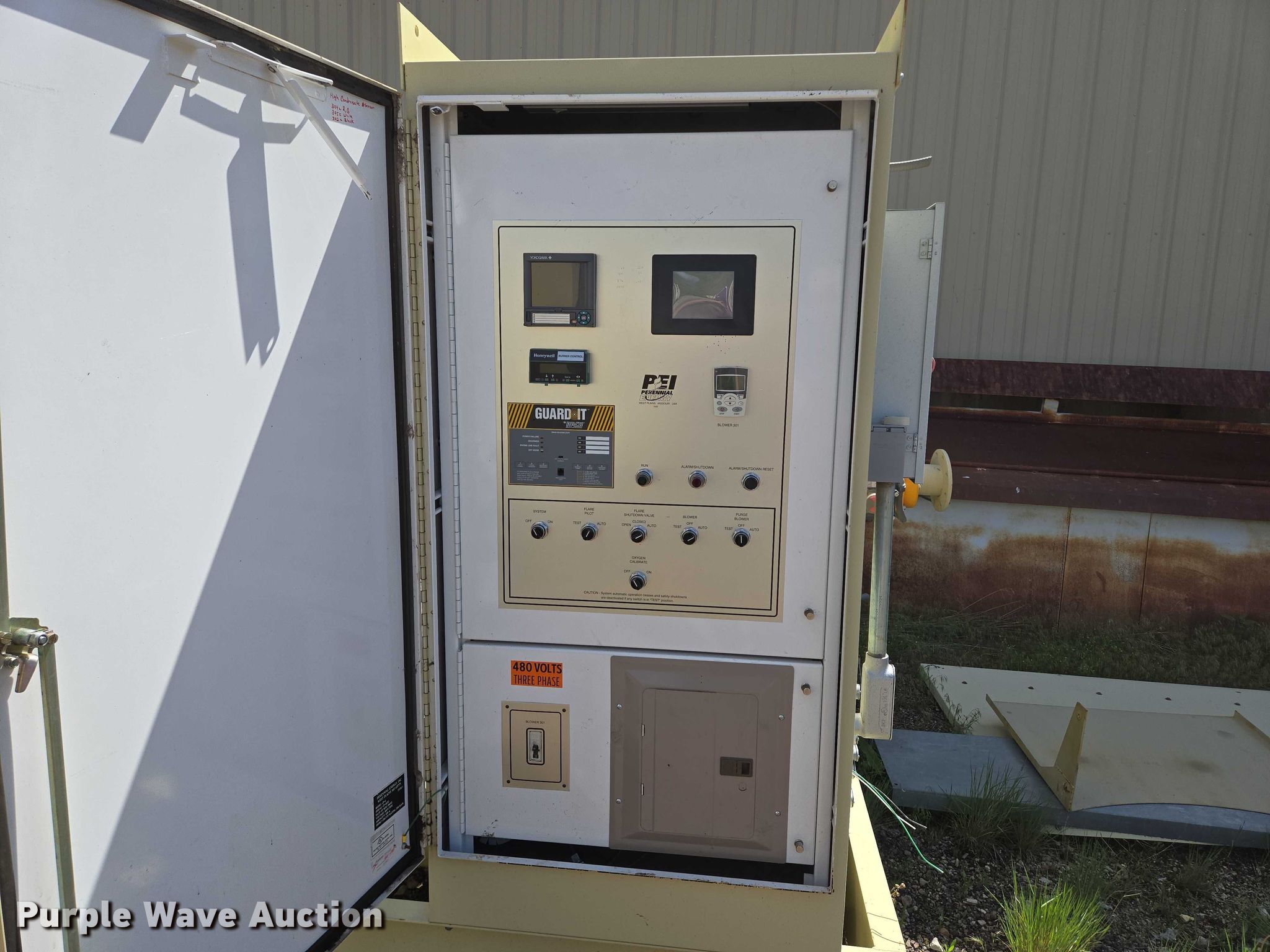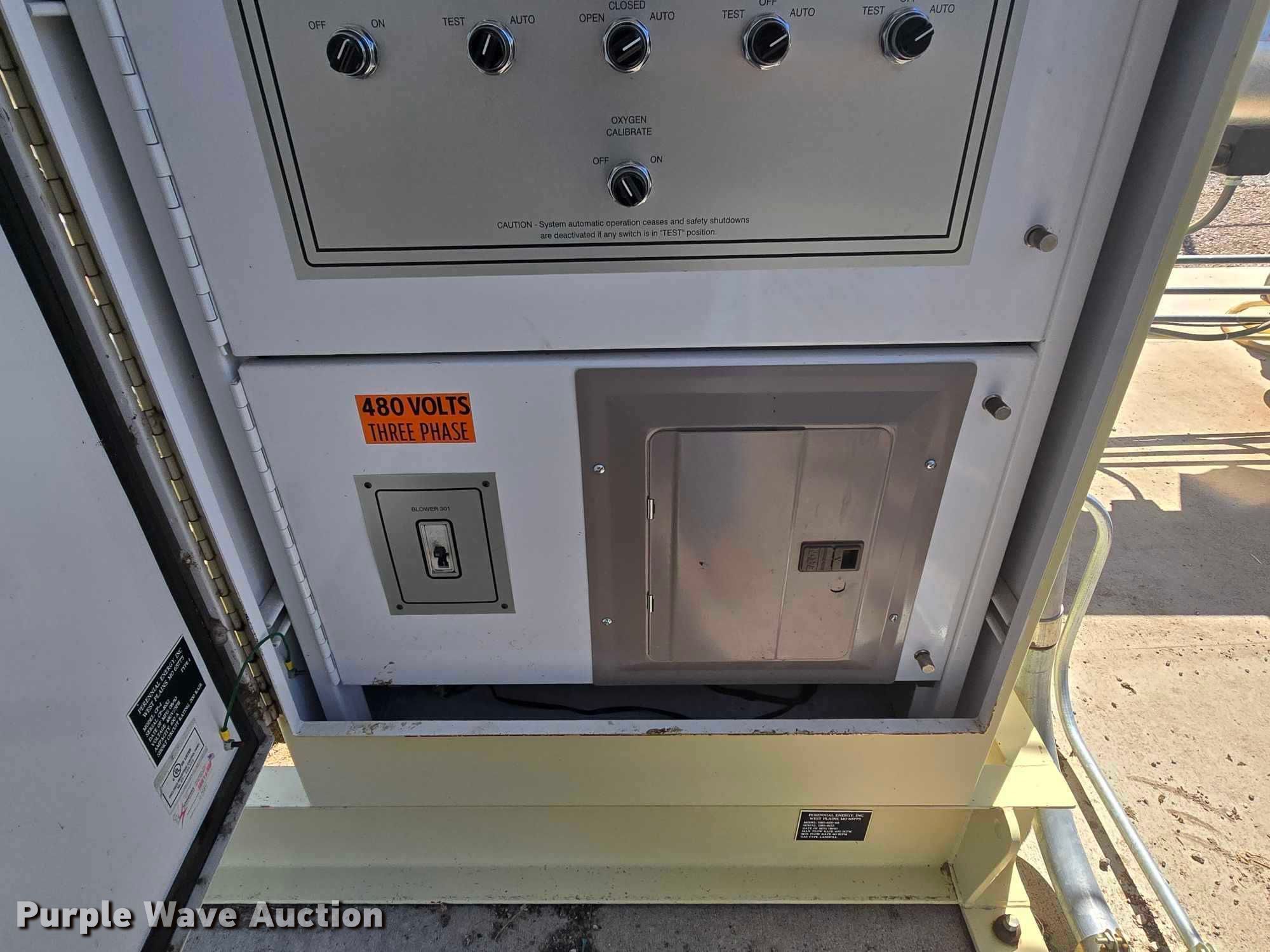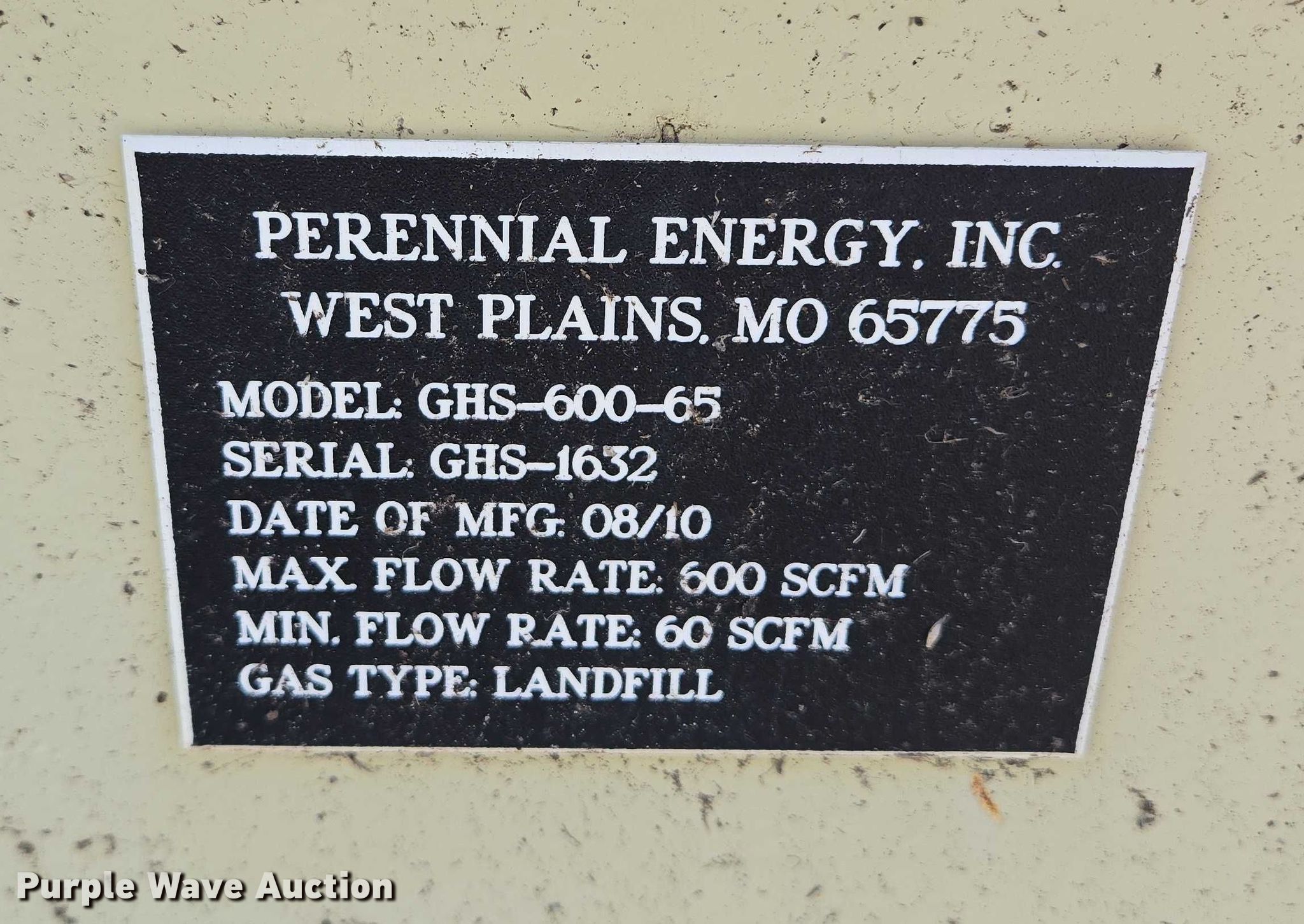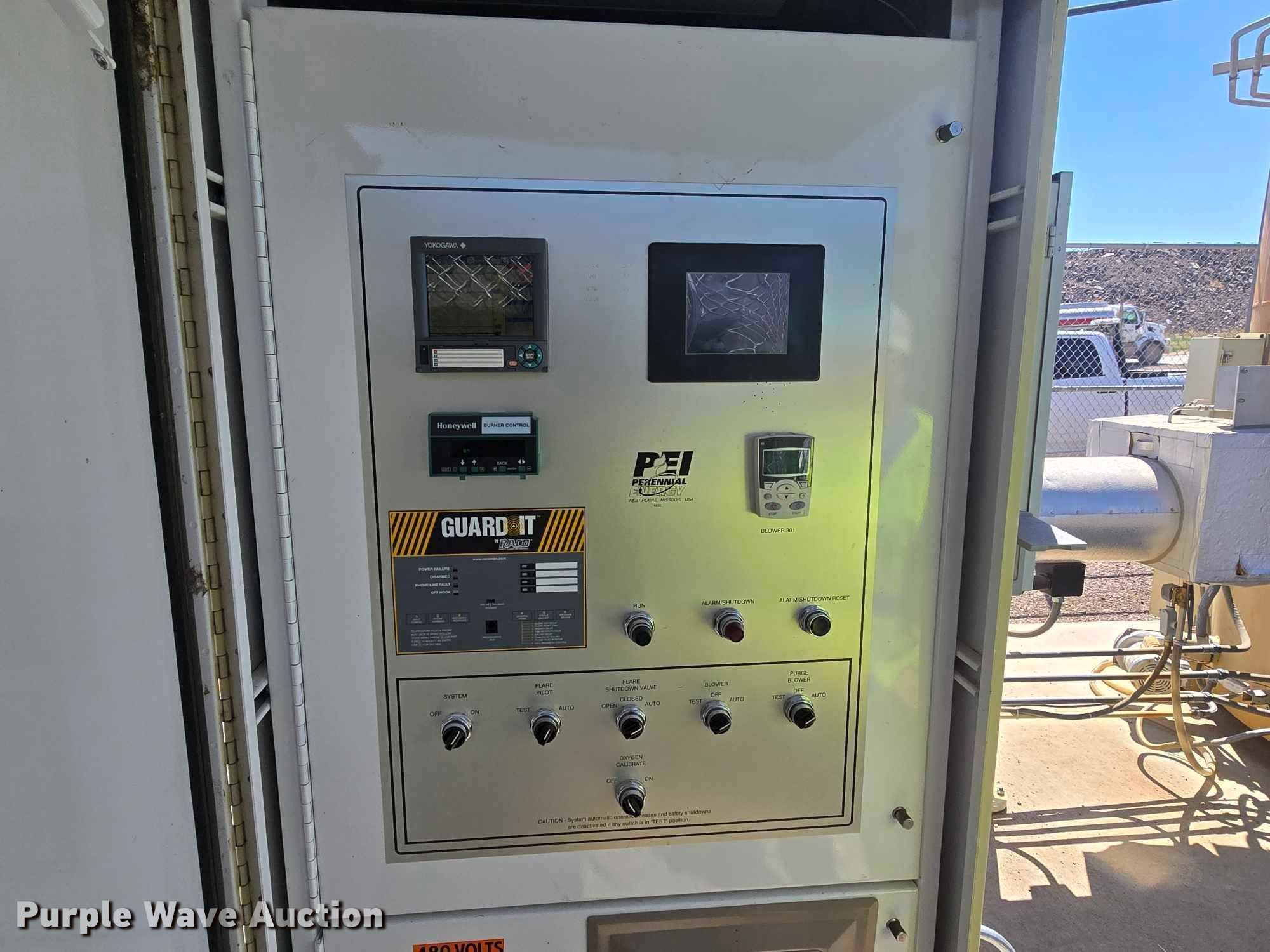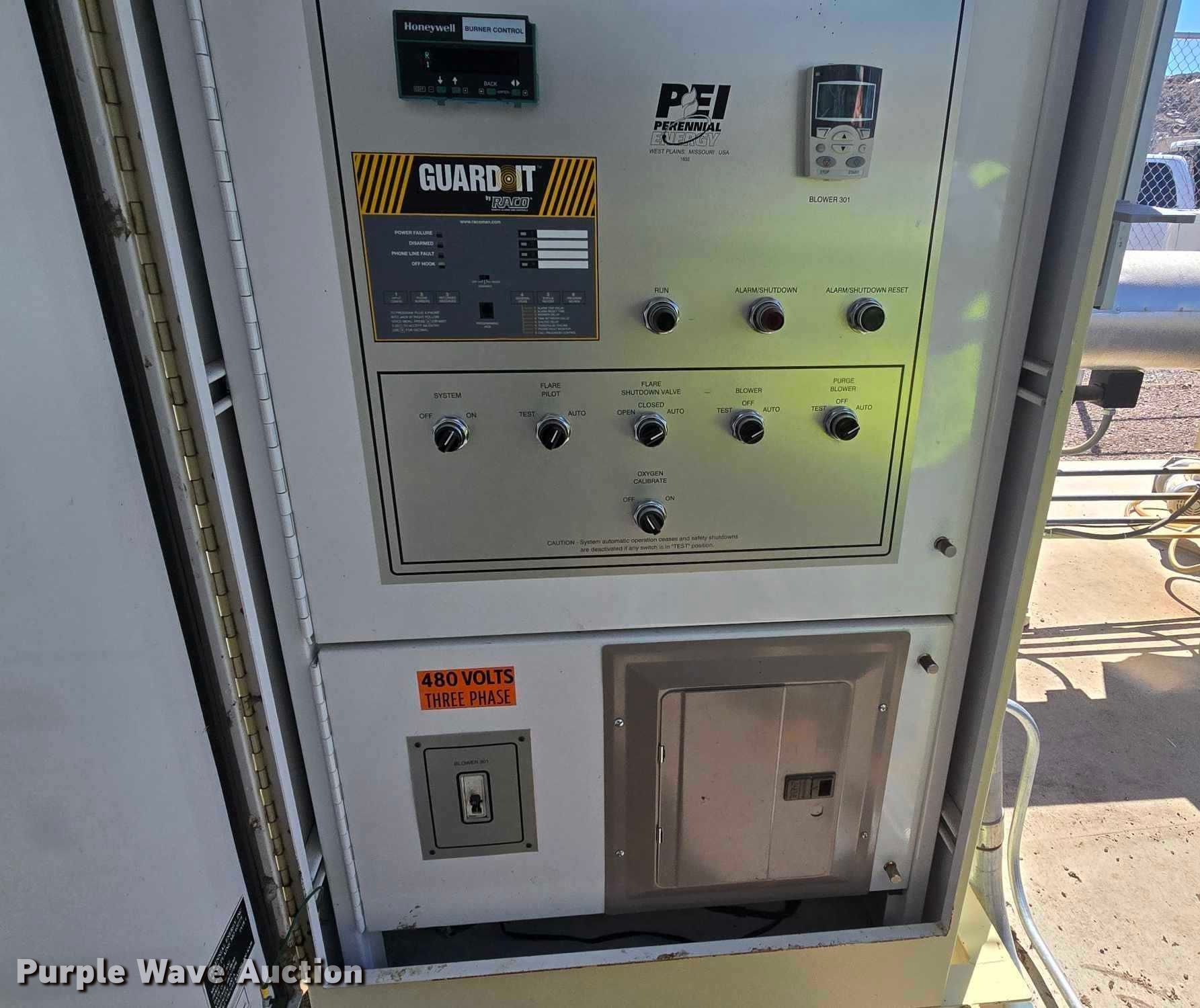 2010 Perennial Energy Inc GHS-600-65 gas flare. Serial: GHS-1632, Flare stack 104" L x 29' H. Lone Star Multistage MC5-04 turbo Serial: S1710353-2004. Baldor Reliancer Super-E Motor Serial: 09P011Z601, HP: 20, Volts: 230/460, Phase: Three. Perennial Energy CP-1 control board Serial: CP-1632, Volts: 480, Phase: Three. Notes Chain link fence not included. City of Rapid City, SD. Rapid City, SD 57701