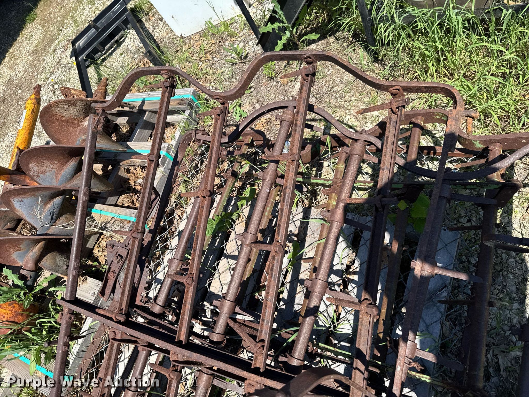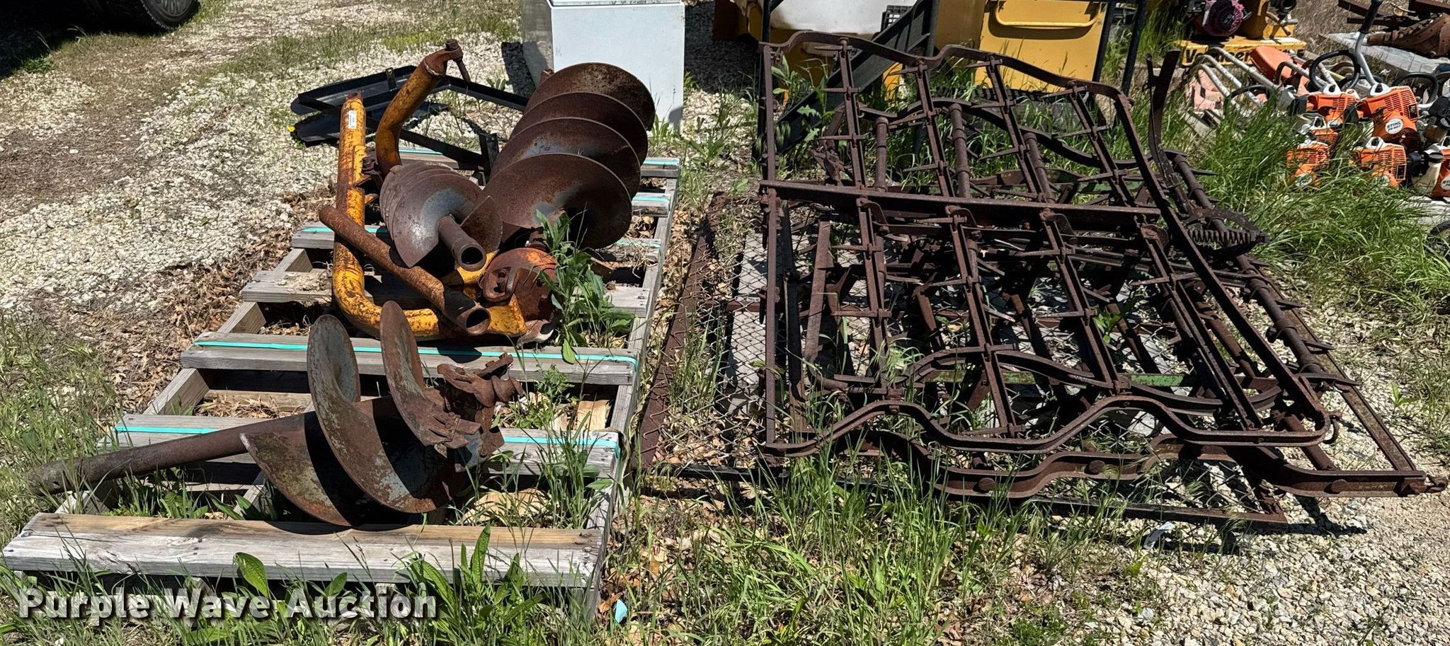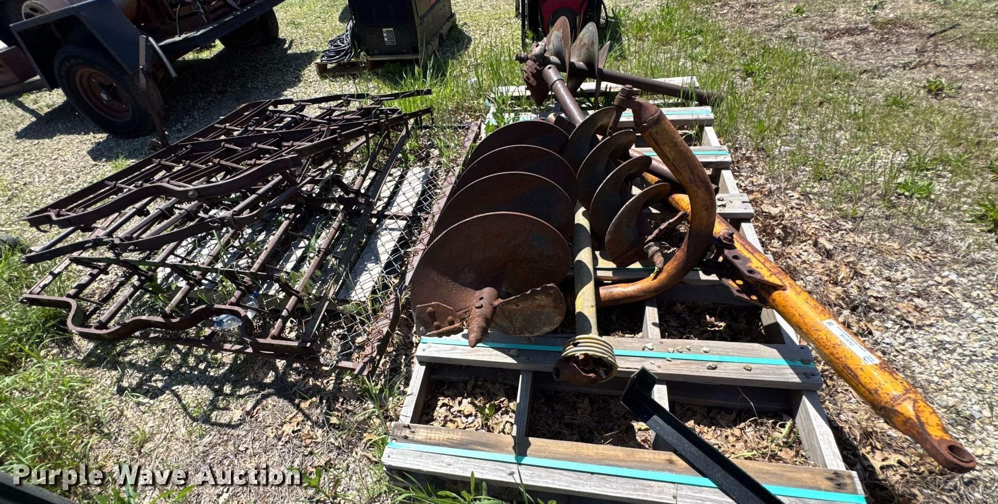 (2) ag attachments. Post hole auger. (3) bits 20� L x 18" diameter, 45� L x 18" diameter, 30� L x 12" diameter, Hitch: Three point, PTO: 540. (3) 66� W spike tooth harrow sections Bars: 4. City of Chanute, KS. Chanute, KS 66720