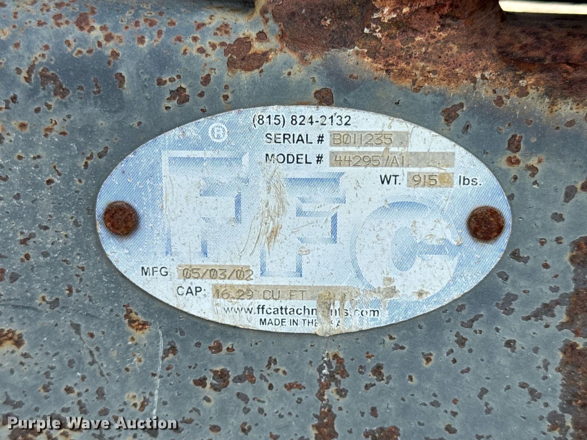2002 FFC 44295/A1 skid steer bucket has sold in Kirksville, Missouri for $907.50. Item DV4042 sold on June 24th, 2025.