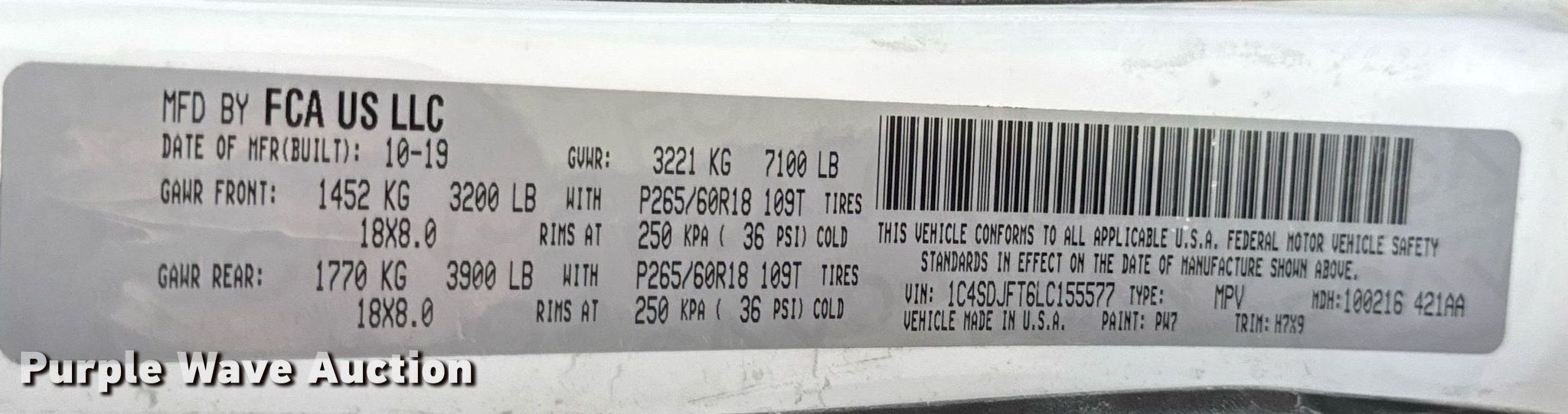 Purple Wave is selling a used Passenger Vehicle in Missouri. This item is a 2020 Dodge Durango SSV SUV with the following: Miles: 148,104 on odometer, VIN: 1C4SDJFT6LC155577