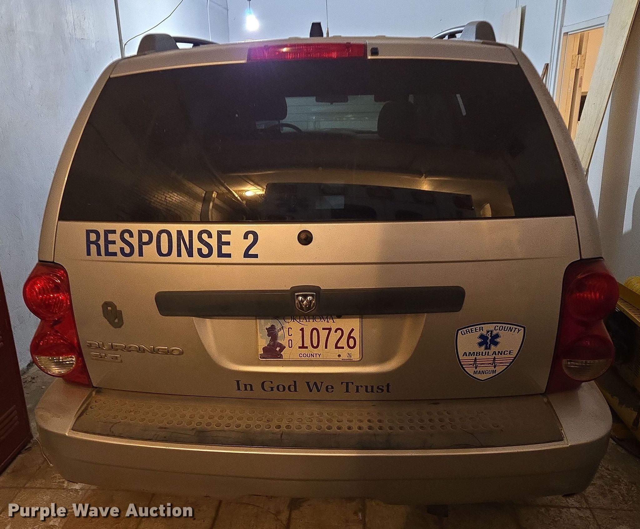 2007 Dodge Durango SUV. Miles: 104,925 on odometer, VIN: 1D8HD48N67F512207. Engine Displacement: 4.7L V8 SOHC, Cylinders: 8, Fuel type: Gas. Transmission Automatic. Interior AC, Heat, Seat: Power driver, Power windows, Power locks, Cruise control. Tires Size: 265/60R18. Notes Dead battery, Possible fuel issues, Non-operational unit Unit must be towed or hauled. Oklahoma rebuilt salvage title. Title distribution may be delayed up to 30 days from verification of funds. Greer County EMS. Mangum, OK 73554