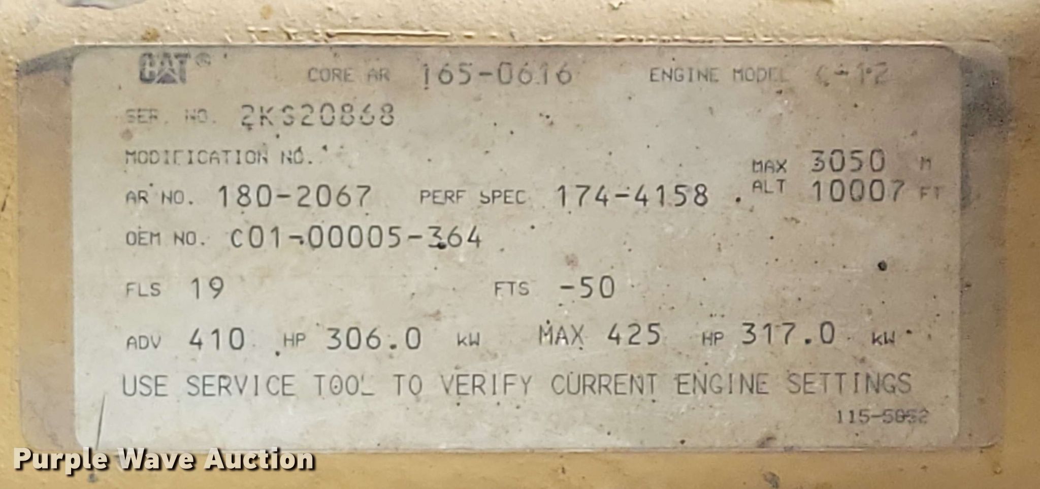 2000 Sterling LT9500 dump truck. Miles: 513,871 on odometer, Hours: 20,491 on meter, VIN: 2FZNEWEB4YAG70578. Engine Caterpillar C-12, Serial: 2KS20868, Displacement: 12.0L, Cylinders: 6, Fuel type: Diesel, HP: 410. Transmission Eaton Fuller, Manual, Speed: 10. Chassis Double frame, Axles: Tandem, Differential lock: Full, Suspension: Spring over walking beam, Brakes: Air, Front mount PTO, GVWR: 58,000 lbs FAWR: 18,000 lbs, IAWR: 20,000 lbs, RAWR: 20,000 lbs. Interior AC, Heat, Heated mirrors, Cruise control, Brake controller. Features Dump bed 14' L x 96" W, Side height: 42", Bed type: Steel, Ram: Single, End gate: Air operated. Tires Front: 315/80R22.5, Rear: 11R22.5. Notes Dump bed lever missing, Possible drivers side heated mirror issues. South Dakota title. Seller is a government entity who will be assigning and distributing the title. Please contact the seller for distribution questions. Title distribution may be delayed up to 14 days from verification of funds. Kingsbury County, SD. De Smet, SD 57231