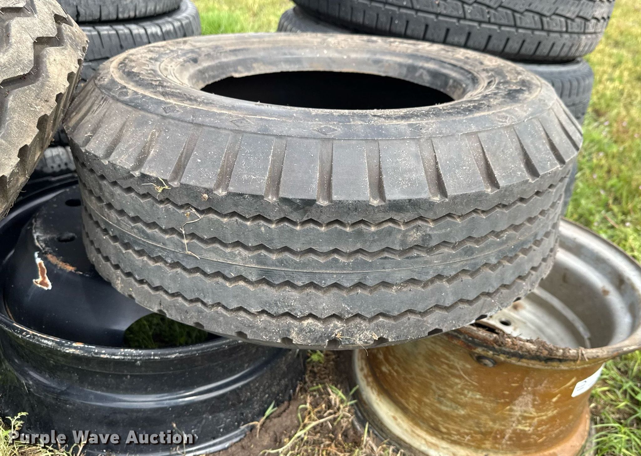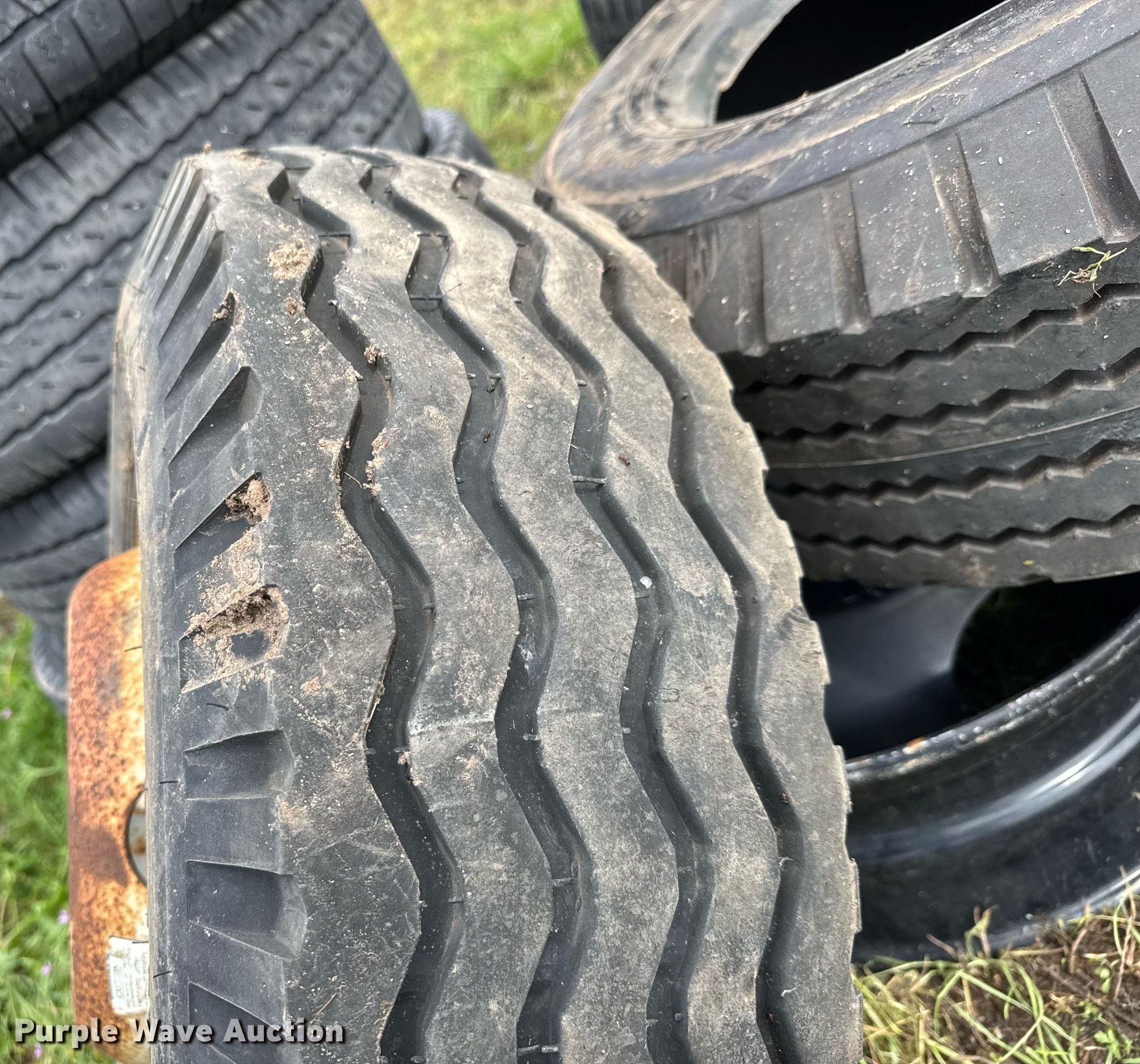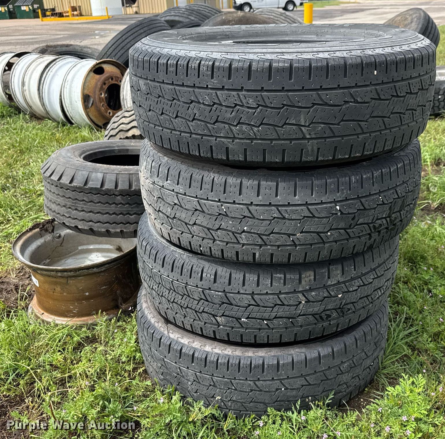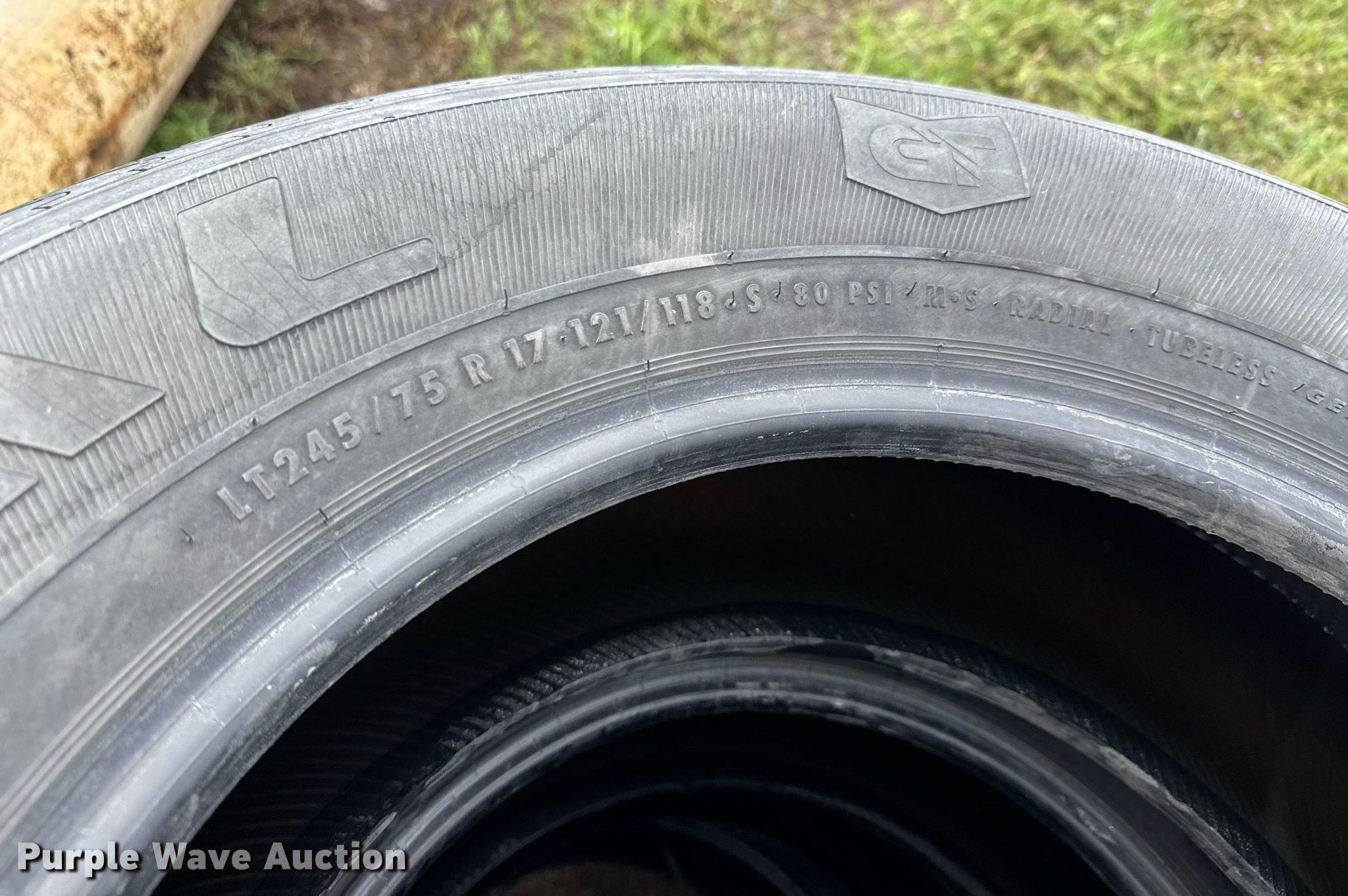 Purple Wave is selling a used Fleet Tires in Kansas. This item is a Tires and wheels with the following: (4) General Grabber LT245/75R17 tires, (4) Goodyear Wrangler P265/70R17 tires, 9-14.5LT tire and wheel, Goodyear 9-14.5LT tire, (2) 8 lug wheels