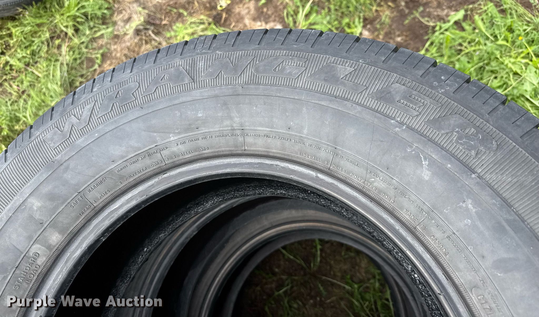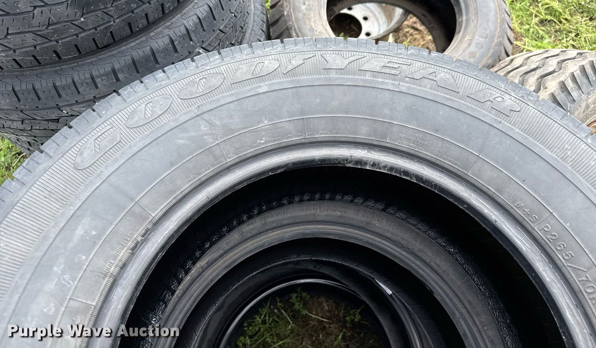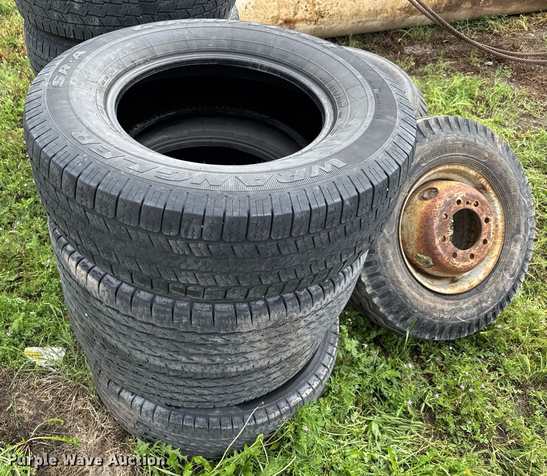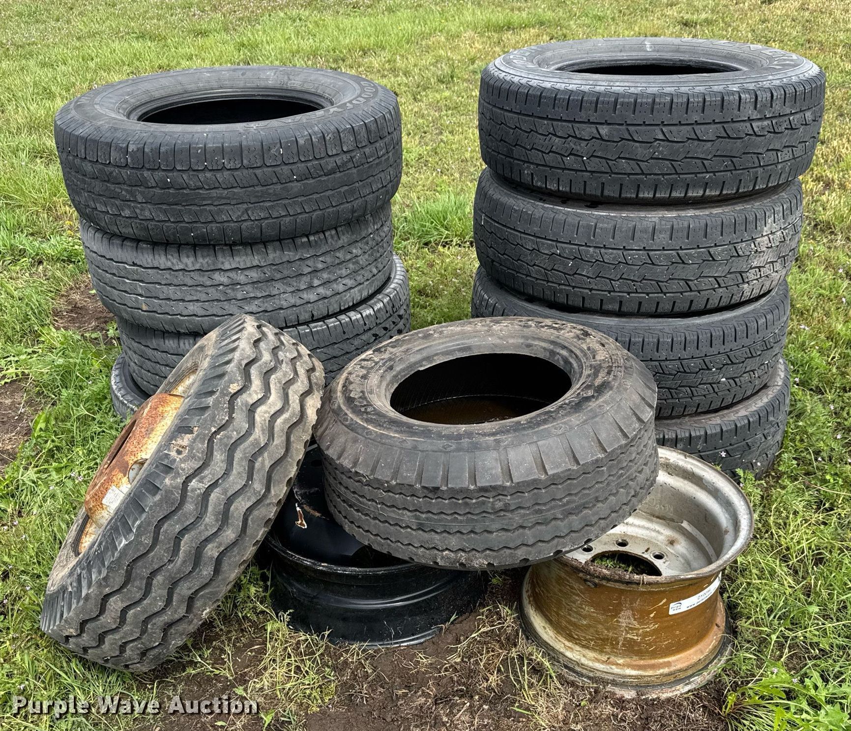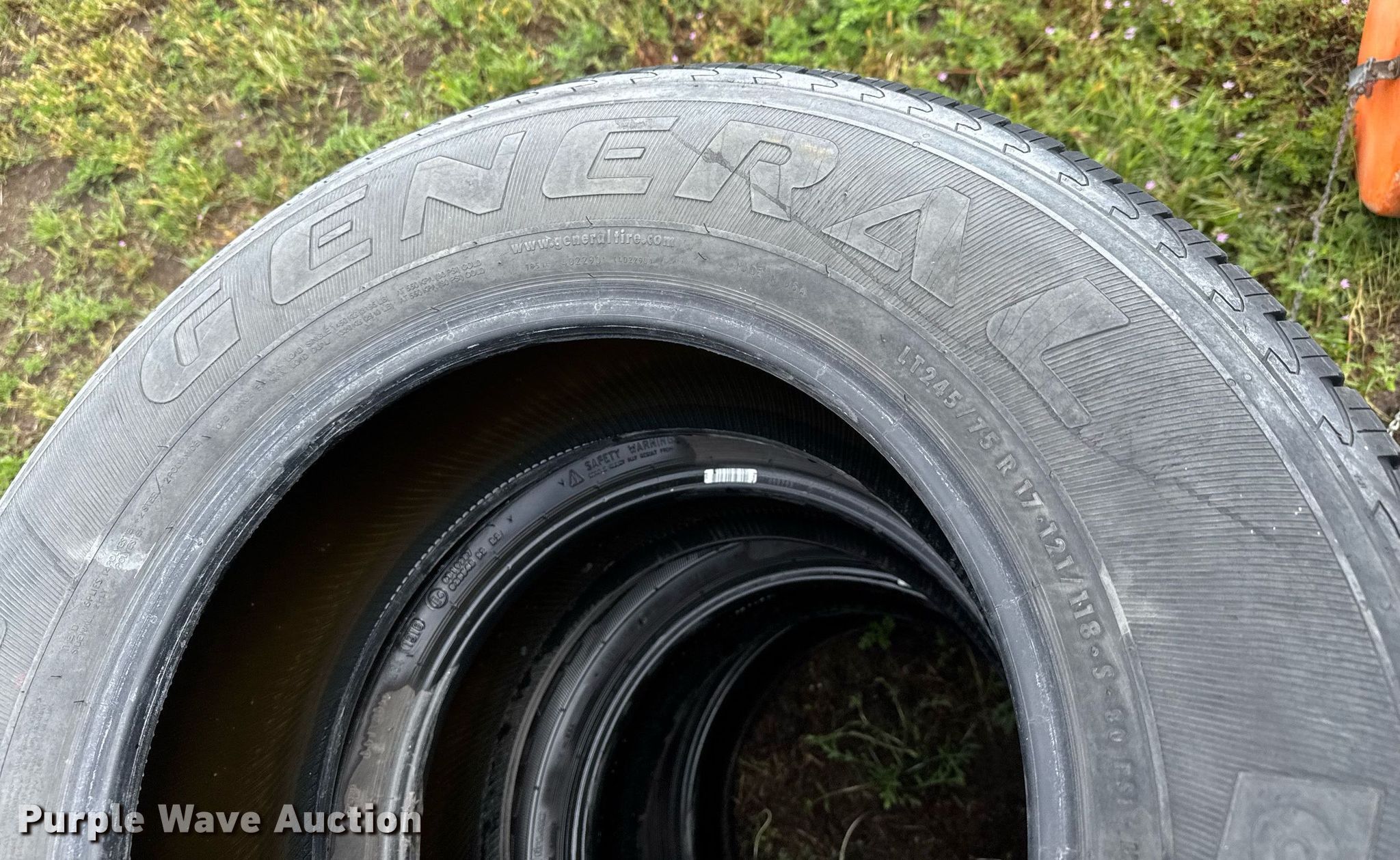 Tires and wheels. (4) General Grabber LT245/75R17 tires, (4) Goodyear Wrangler P265/70R17 tires, 9-14.5LT tire and wheel, Goodyear 9-14.5LT tire, (2) 8 lug wheels. Reno County Public Works. South Hutchinson, KS 67505