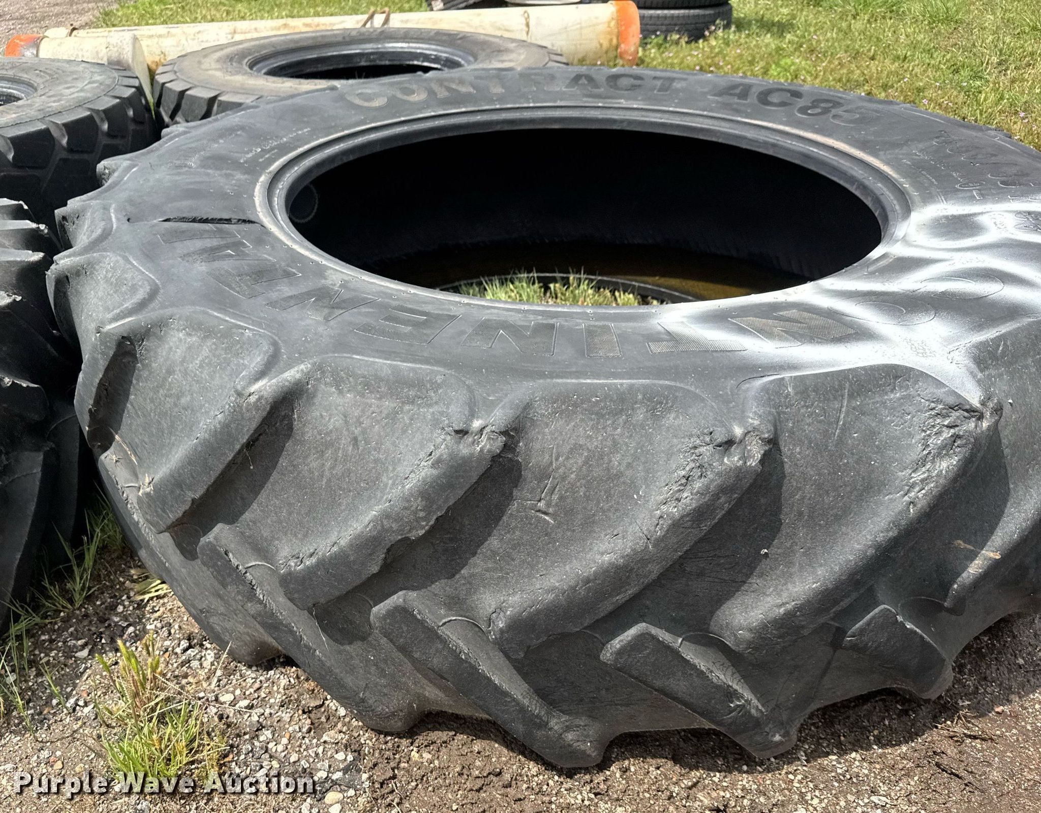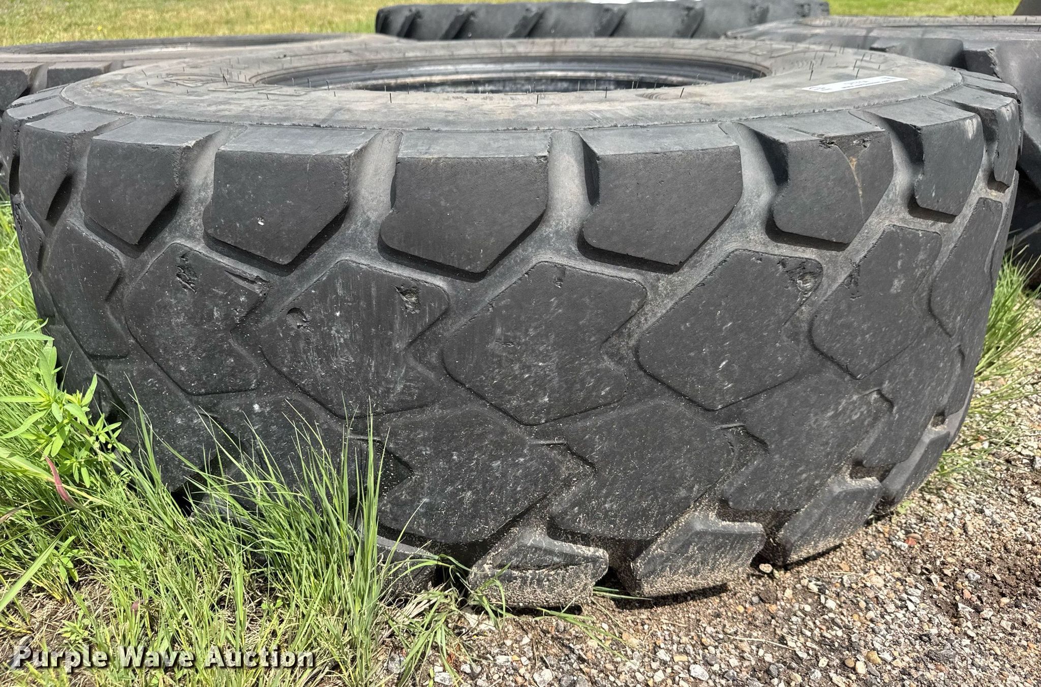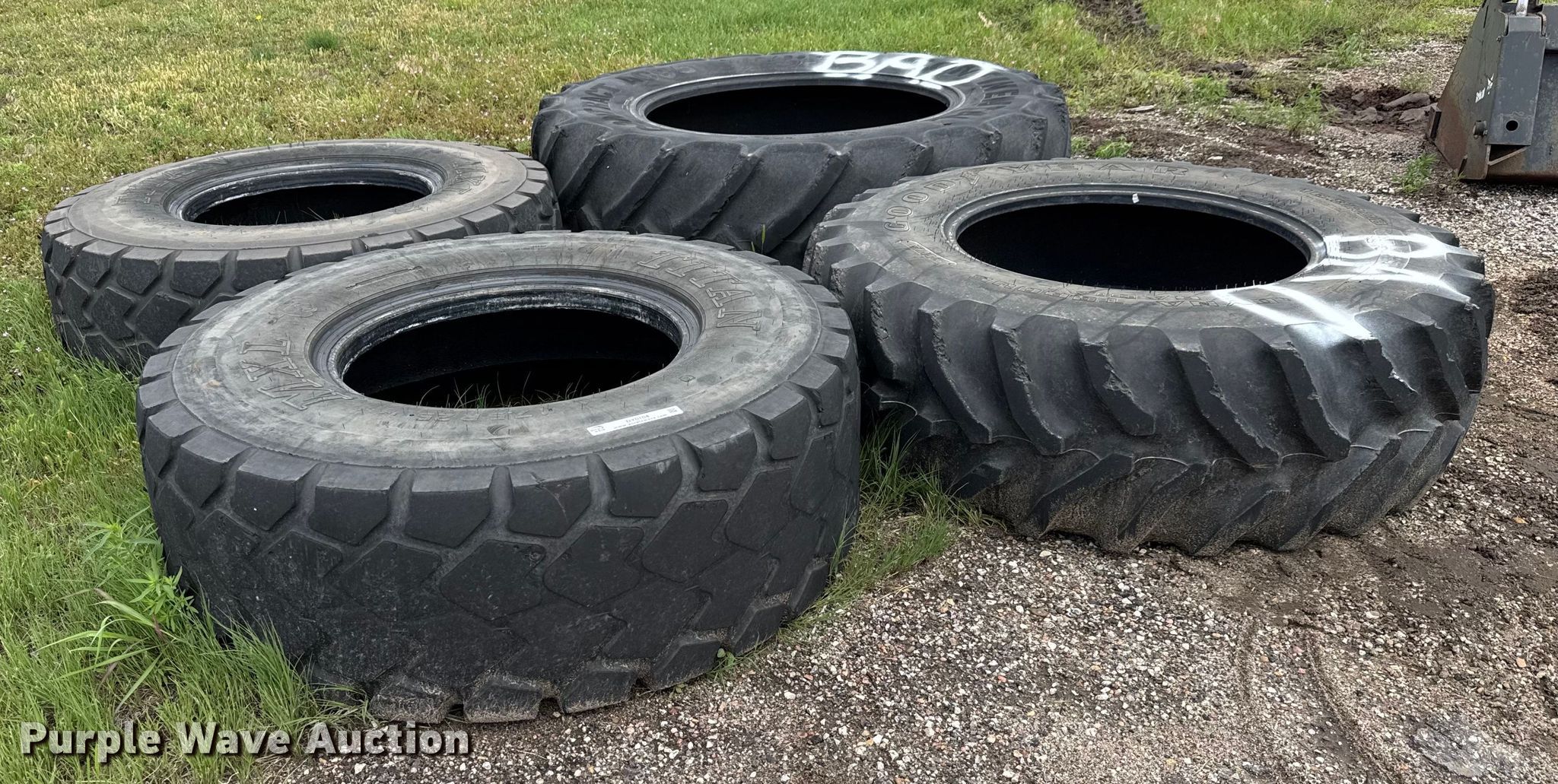 Purple Wave is selling a used Industrial Tires or Tracks in Kansas. This item is a (4) tires with the following: (2) Titan MXL 17.5R25, Continental 460/85R38, Goodyear 16.9R28