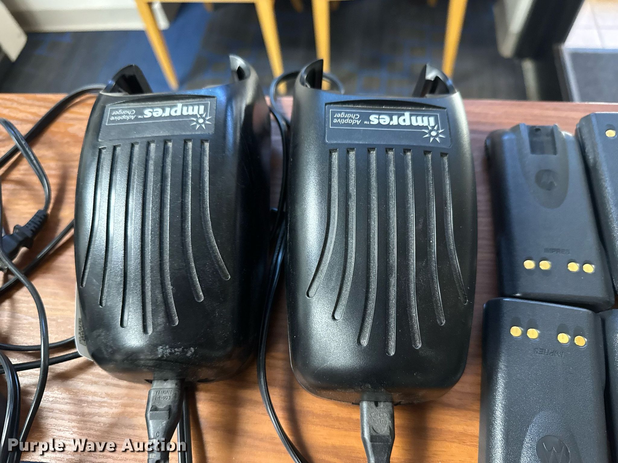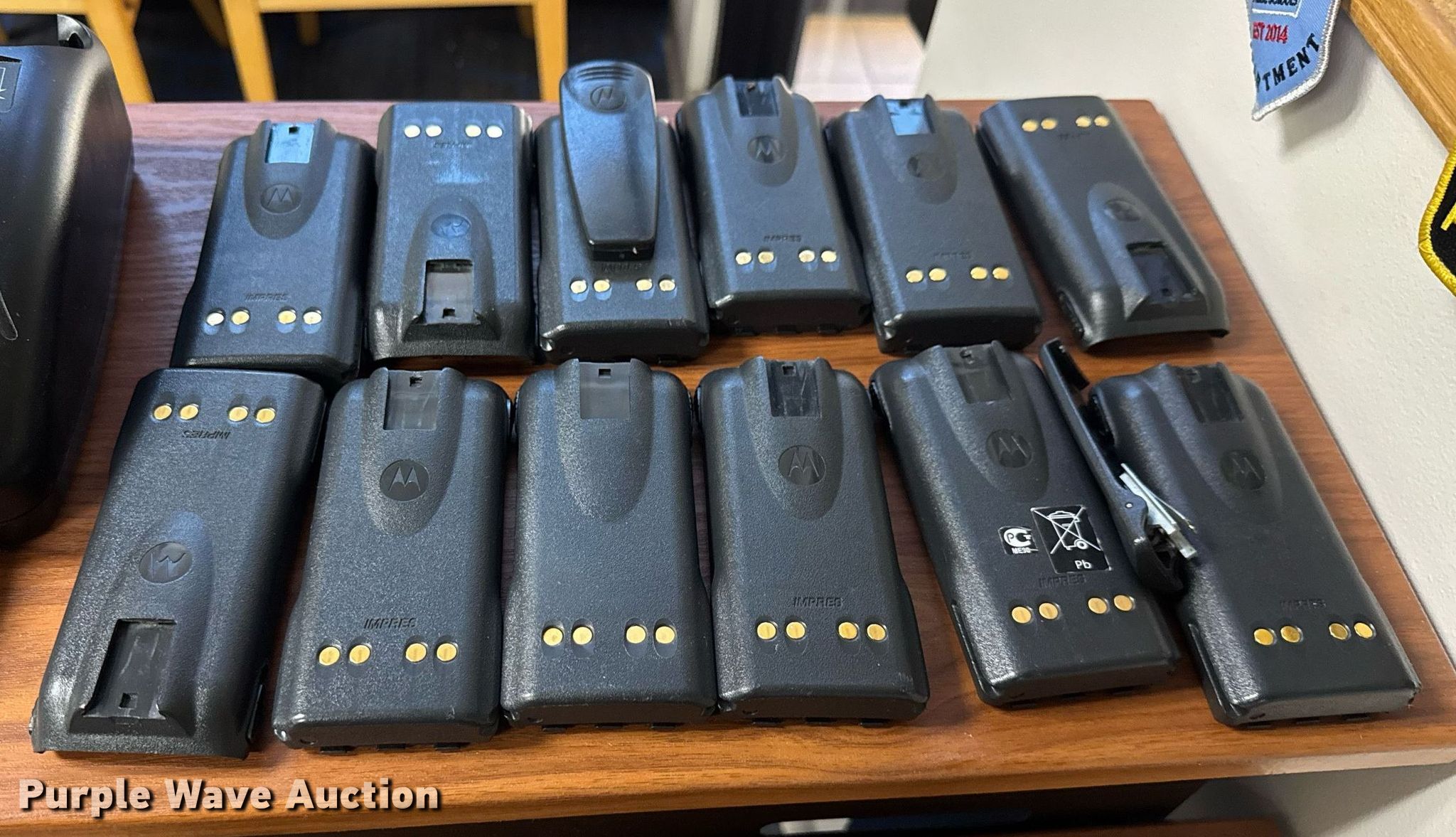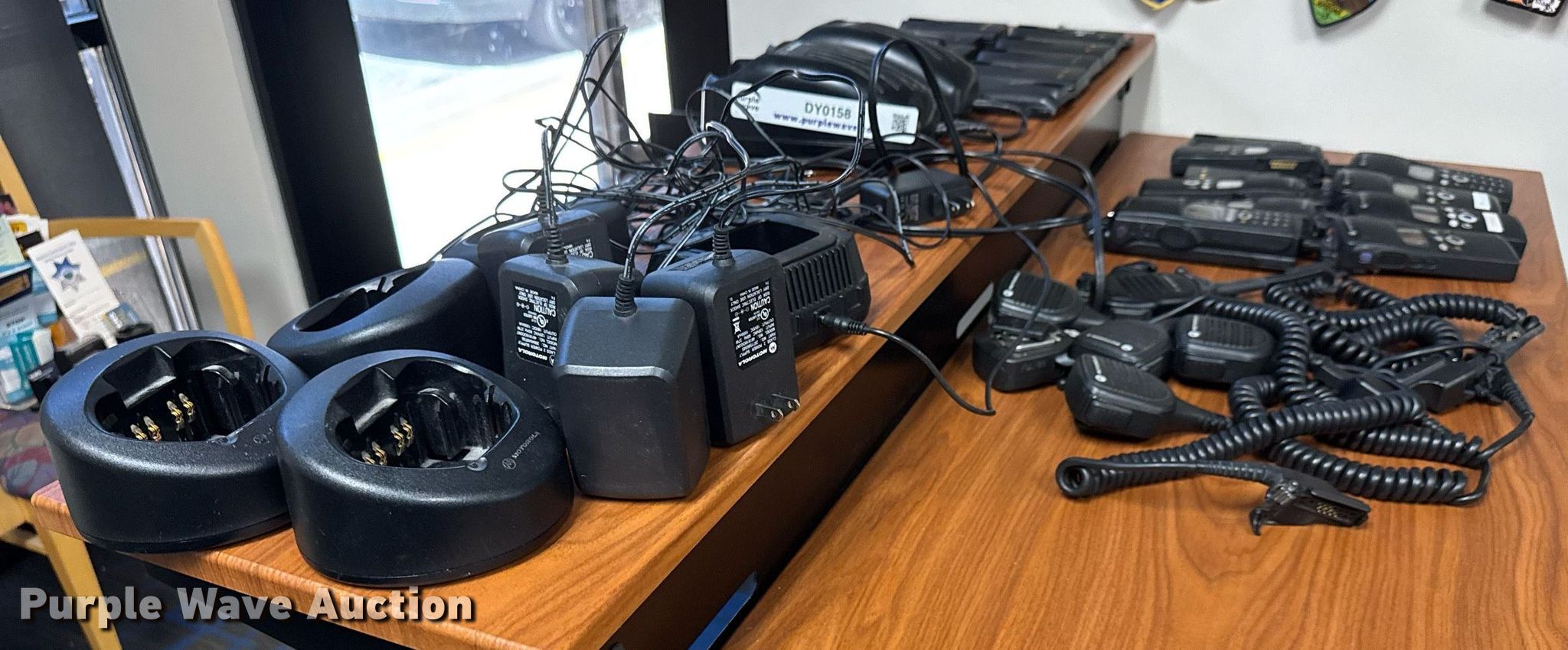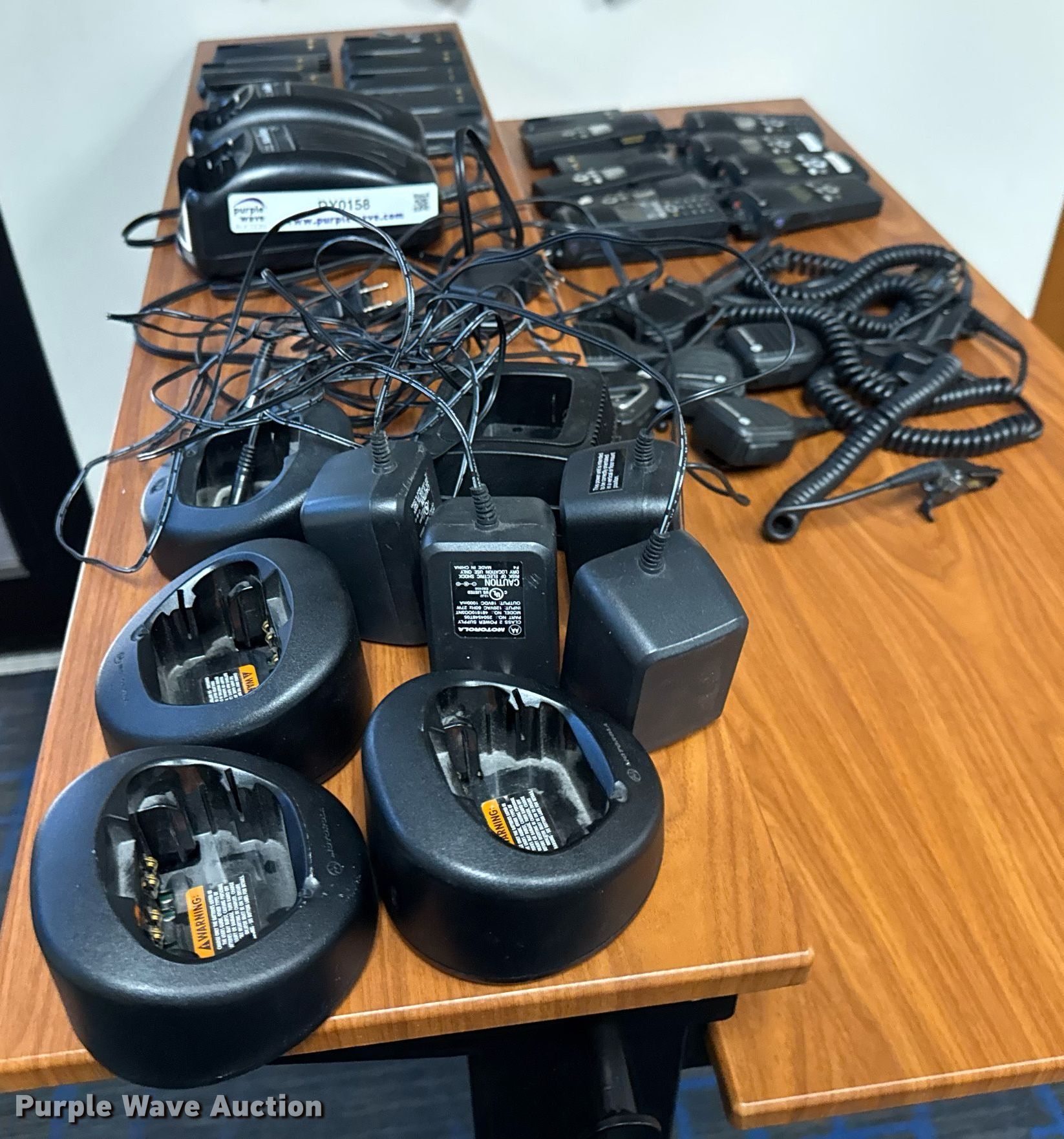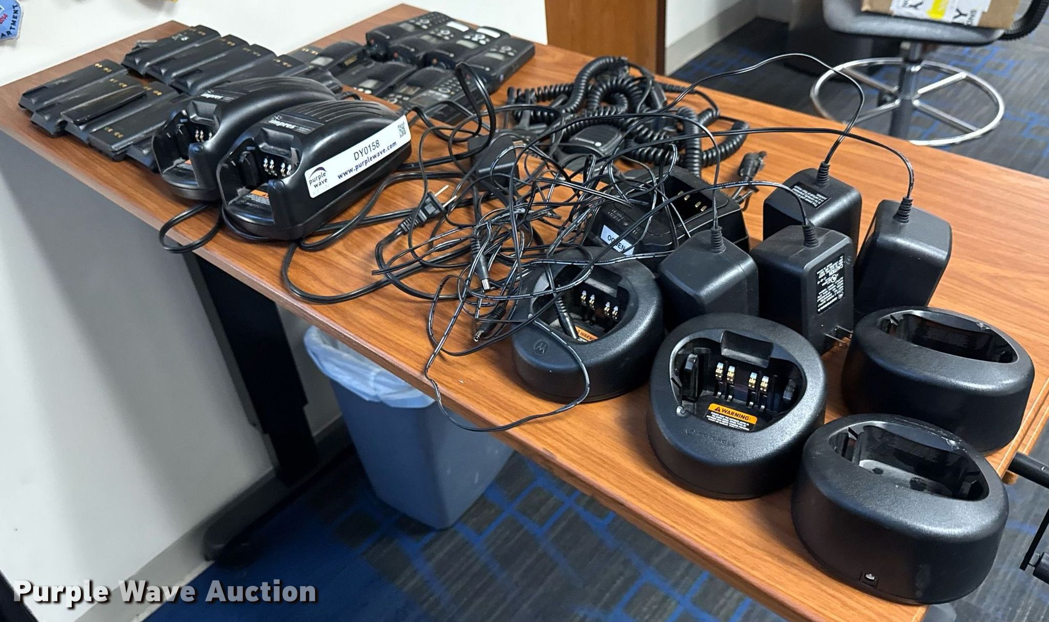 Motorola radios. (7) Motorola STX 2500 radios, (6) Motorola lapel microphones, (11) Motorola batteries, Motorola CM300 radio with lapel microphone, Motorola CDM1550-LS radio with lapel microphone, (2)Motorola CDM1250 radios with lapel microphone, Motorola STX 5000 radio, Motorola MCS2000 radio with lapel microphone, Kenwood TK-860 radio, (6) Motorola chargers. Notes Table not included. City of Cheney, KS. Cheney, KS 67025