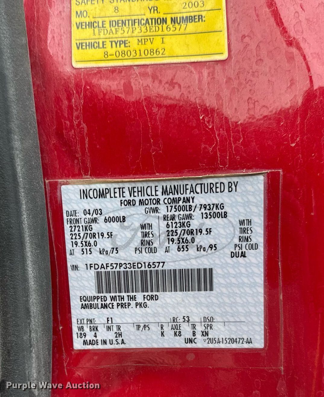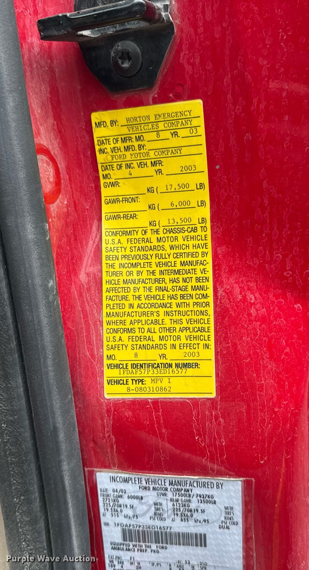 2003 Ford F550 Super Duty truck cab and chassis. Miles: 13,959 on odometer, VIN: 1FDAF57P33ED16577. Engine Displacement: 6.0L, Cylinders: 8, Fuel type: Diesel. Transmission Automatic. Chassis Four wheel drive, Axles: Single, Suspension: Spring, Brakes: Hydraulic, Truck chassis: 156", GVWR: 17,500 lbs FAWR: 6,000 lbs, RAWR: 13,500 lbs. Interior AC, Heat, Power windows, Power locks, Cruise control. Features Winch Ramsey EK12000, Capacity: 12,000 lbs, Fuel tank: Single. Tires Size: 255/70R19.5. Notes Unknown operating condition winch, Windshield chipped or cracked, Dead battery. Iowa title. Seller is a government entity who will be assigning and distributing the title. Please contact the seller for distribution questions. Title distribution may be delayed up to 14 days from verification of funds. City of De Soto, IA. De Soto, IA 50069