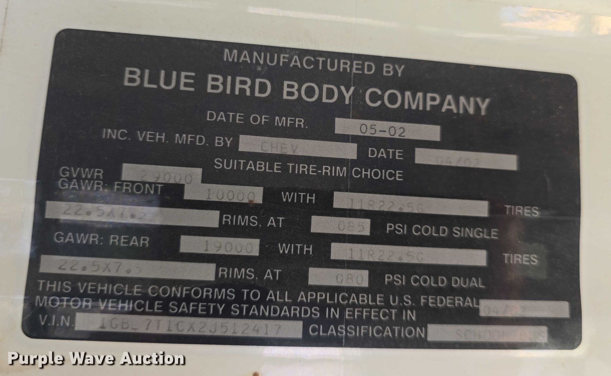 Purple Wave is selling a used Bus in Kansas. This item is a 2003 Blue Bird C7H064 school bus with the following: Miles: 147,970 on odometer, VIN: 1GBL7T1CX2J512417, Unit #: 15