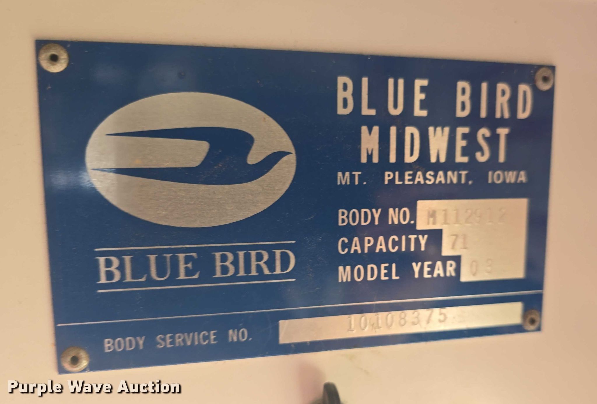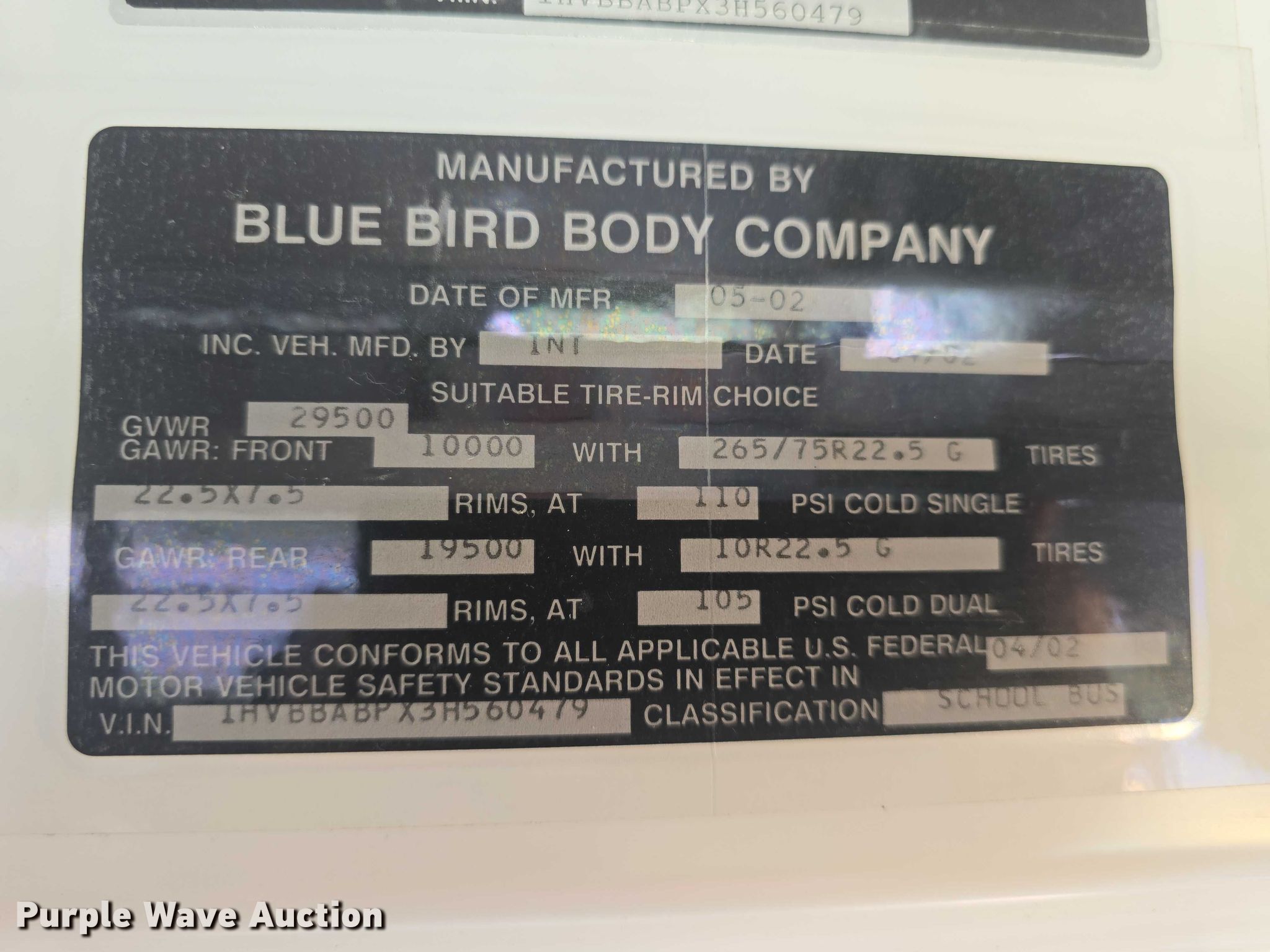 2003 International 3800 school bus. Miles: 160,142 on odometer, VIN: 1HVBBABPX3H560479, Unit #: 5. Engine International, Displacement: 7.3L, Cylinders: 8, Fuel type: Diesel. Transmission Automatic. Chassis Axles: Single, Suspension: Spring, Brakes: Hydraulic, GVWR: 29,500 lbs, Wheelbase: 279". Interior AC, Heat, Heated mirrors, Cruise control, Passengers: 71. Tires Size: 11R22.5. Notes Decals will be removed prior to auction. Kansas title. Title distribution may be delayed up to 14 days from verification of funds. Southern Cloud Schools. Miltonvale, KS 67466