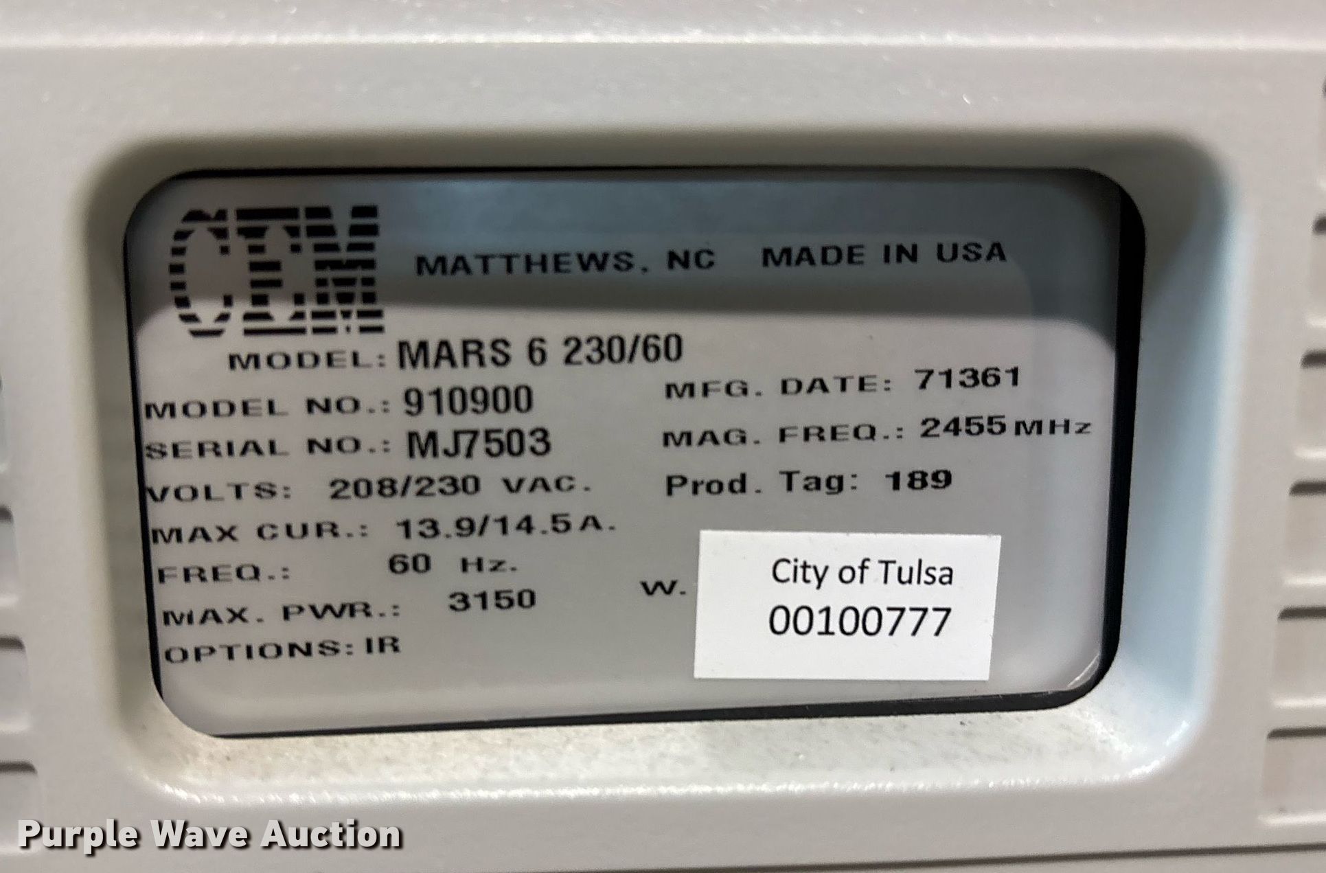 Purple Wave is selling a used Electronics in Oklahoma. This item is a CEM Mars 6 230/60 microwave digestion system with the following: Serial: MJ7503, Unit #: 1000